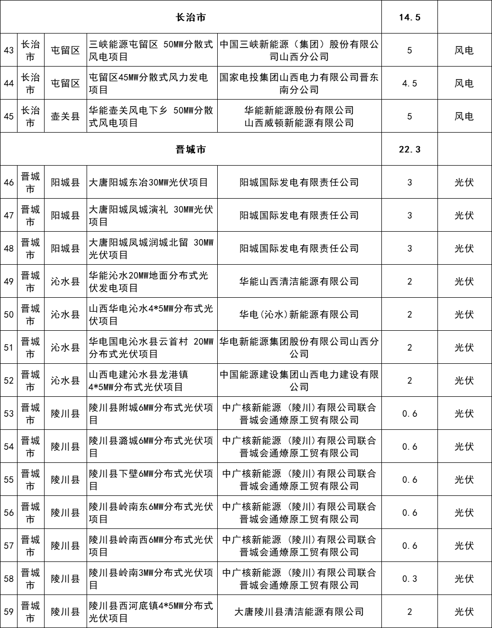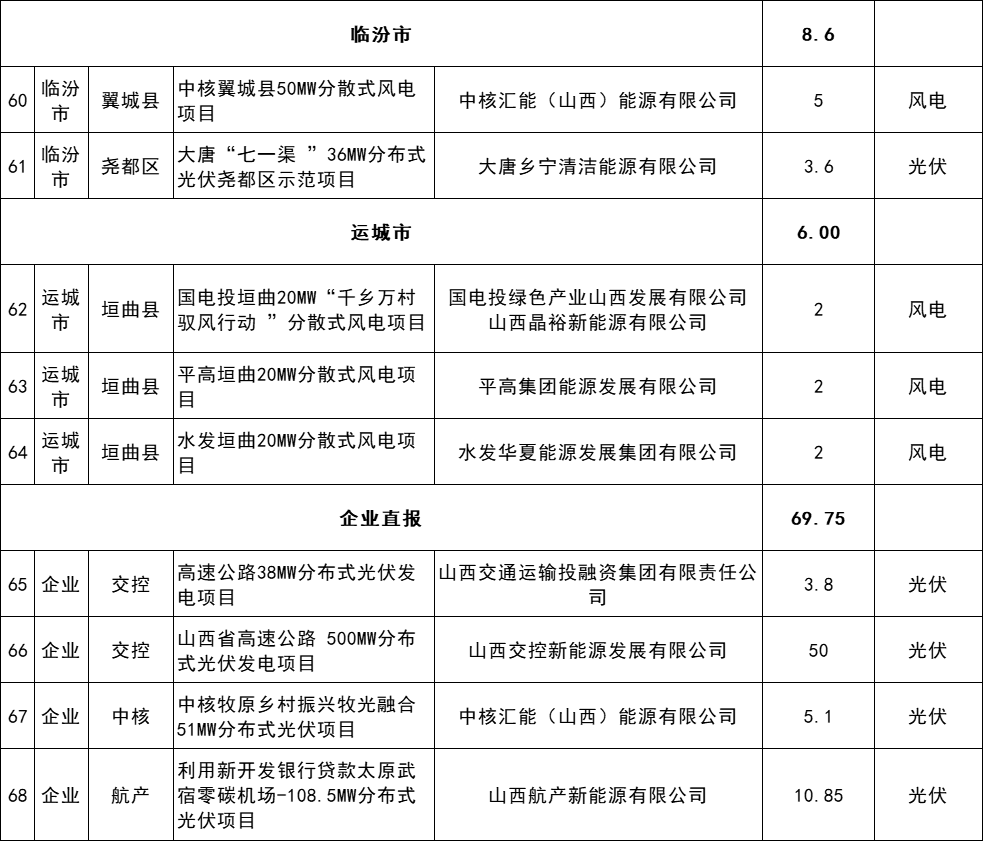 4月30日,山西省能源局發(fā)布關(guān)于山西省2024年分布式可再生能源項(xiàng)目評(píng)審結(jié)果的公示,公示顯示,擬納入2024年分布式可再生能源項(xiàng)目清單共有68個(gè)項(xiàng)目,規(guī)模合計(jì)2.5759GW。其中,光伏項(xiàng)目1396.8MW,風(fēng)電項(xiàng)目1163.1MW,風(fēng)光項(xiàng)目16MW。 原文如下: 關(guān)于山西省2024年分布式可再生能源項(xiàng)目評(píng)審結(jié)果的公示 根據(jù)《關(guān)于做好2024年分布式可再生能源發(fā)展工作的通知》(晉能源新能源發(fā)[2024]128號(hào)),省能源局組織專家對(duì)各市初選上報(bào)的2024年分布式可再生能源發(fā)展項(xiàng)目進(jìn)行了評(píng)審,優(yōu)選出項(xiàng)目68個(gè)、規(guī)模257.59萬千瓦,現(xiàn)將結(jié)果予以公示。 公示時(shí)間為2024年5月1日至5月10日。如有異議,請(qǐng)?jiān)诠酒趦?nèi)向項(xiàng)目所在市能源局提出書面意見,各市匯總上報(bào)省能源局。 聯(lián)系電話:0351-4117220 13546726645 電子郵箱:sxnyjxnyc@126.com 山西省能源局 2024年4月30日 擬納入2024年分布式可再生能源項(xiàng)目清單