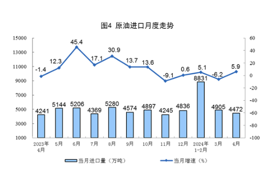 原油生產(chǎn)平穩(wěn)增長,進口由降轉(zhuǎn)增。4月份,規(guī)上工業(yè)原油產(chǎn)量1747萬噸,同比增長1.3%,增速比3月份加快0.1個百分點;日均產(chǎn)量58.2萬噸。進口原油4472萬噸,同比增長5.9%。 1—4月份,規(guī)上工業(yè)原油產(chǎn)量7095萬噸,同比增長2.1%。進口原油18207萬噸,同比增長2.0%。 原油加工有所下降。4月份,規(guī)上工業(yè)原油加工量5879萬噸,同比下降3.3%,3月份為增長1.3%;日均加工196.0萬噸。1—4月份,規(guī)上工業(yè)原油加工量24126萬噸,同比增長1.1%。