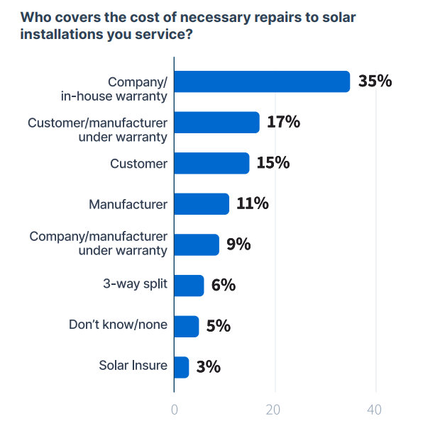圖2住宅用戶安裝電池儲(chǔ)能系統(tǒng)的常見原因 考慮到光伏系統(tǒng)通常是一項(xiàng)為期25年的長(zhǎng)期投資,售后服務(wù)是簽定安裝光伏系統(tǒng)協(xié)議的一個(gè)關(guān)鍵特征。大約96%的安裝商可以通過管理系統(tǒng)進(jìn)行監(jiān)控,63%的安裝人員表示,他們每季度主動(dòng)檢查一次客戶運(yùn)營(yíng)的住宅光伏系統(tǒng),以確保其正常工作。 調(diào)查表明,住宅光伏系統(tǒng)最常見的維修原因依次是逆變器硬件故障和更換、逆變器軟件和設(shè)置問題、電池軟件更新、通信和監(jiān)控修復(fù)、屋頂泄漏、電池硬件故障或更換、布線問題、以及損壞或性能不佳的光伏組件。 SolarReviews表示:“幸運(yùn)的是,當(dāng)出現(xiàn)問題時(shí),它們通常都在某種保修范圍內(nèi),因此只有15%的情況下客戶需要承擔(dān)維修費(fèi)用?!?/span>