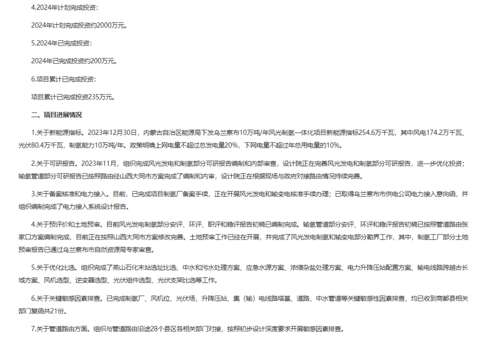 2024年5月21日,內(nèi)蒙古烏蘭察布市政府網(wǎng)站發(fā)布了內(nèi)蒙古烏蘭察布10萬噸/年風(fēng)光制氫一體化項(xiàng)目。 據(jù)悉,該項(xiàng)目建設(shè)規(guī)模年產(chǎn)綠氫10萬噸,其中包括建設(shè)制氫廠、長輸管道等。制氫廠選址位于烏蘭察布市商都縣玻璃忽鏡鄉(xiāng),規(guī)劃占地約820畝,制氫水源取自商都縣七臺鎮(zhèn)污水處理廠中水,主要包括100套2000Nm3/h堿液電解槽、1座6000m3水容積的低壓緩沖罐及47.6km中水輸送管線。輸氫管道全長約1145km,沿線經(jīng)過內(nèi)蒙古、京津冀等?。ㄊ?、自治區(qū)),設(shè)置10座站場、47座閥室。設(shè)計輸量10萬噸/年(遠(yuǎn)期增壓后輸量50萬噸/年),設(shè)計壓力6.3MPa,管徑為D457mm和D610mm,分別采用L245無縫鋼管和L245高頻電阻焊鋼管。 全文如下: