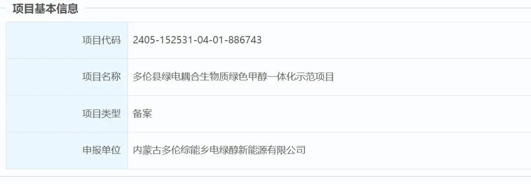 原文如下: 項目單位:內(nèi)蒙古多倫綜能鄉(xiāng)電綠醇新能源有限公司 項目名稱: 多倫縣綠電耦合生物質(zhì)綠色甲醇一體化示范項目 建設地點:錫林郭勒盟--多倫縣--多倫縣化工園區(qū) 總投資:350000萬元,其中 自有資金:350000 萬元 , 申請銀行貸款:0萬元 , 其他0 萬元 計劃建設起止年限:2024/08至2026/08 建設規(guī)模及內(nèi)容:建設廠房,辦公樓、原材料儲備庫,及消防設施,安防設施,應急管理設施以及其它附屬設施,建筑面積111765平方米。建設一條年產(chǎn)20萬噸綠色甲醇生產(chǎn)線。