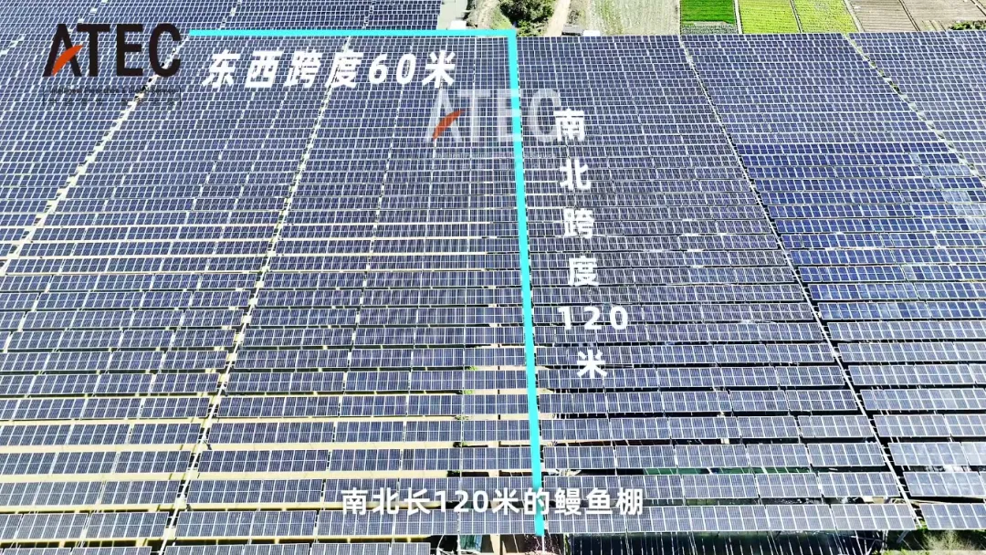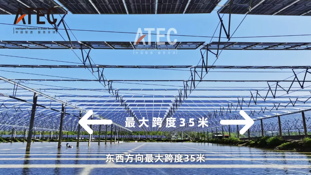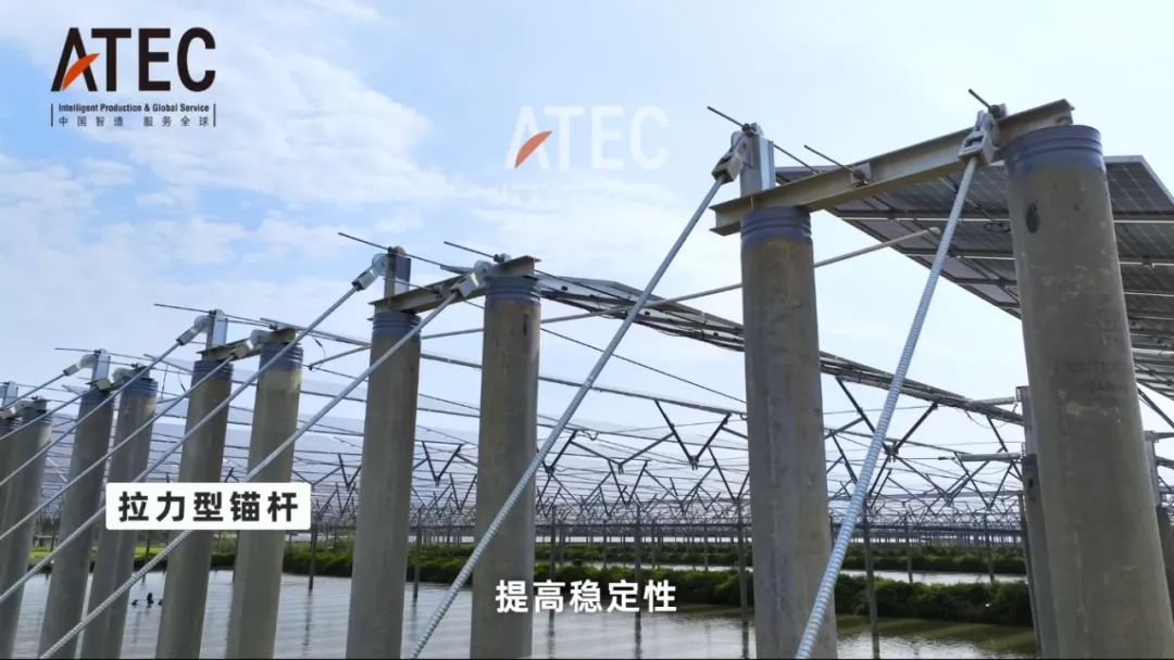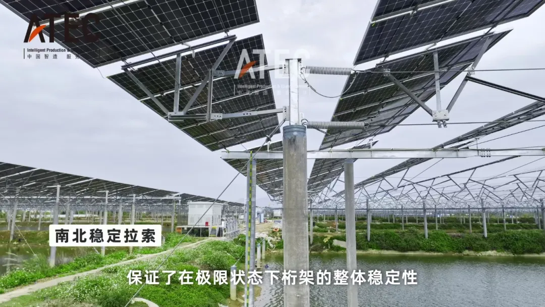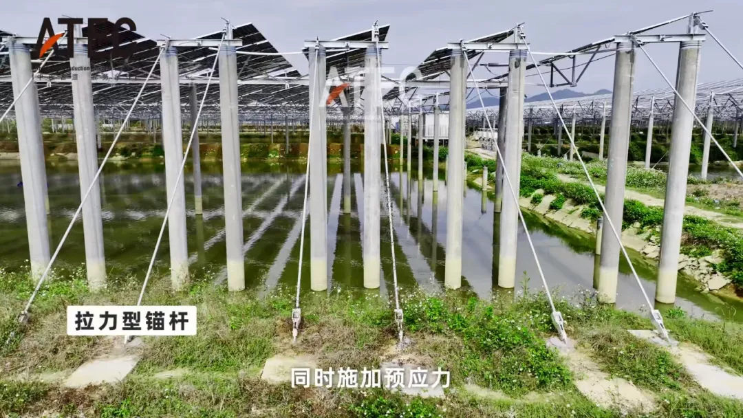 漁歌傳唱,看盡汝湖,這里是廣東惠州的東江明珠。春光里,聽水在唱一首“光之歌”。 汝湖以其得天獨厚的優(yōu)質(zhì)水資源,孕育出了享譽全國的鰻魚產(chǎn)業(yè)。如何高效利用漁場資源,創(chuàng)造更大的經(jīng)濟價值?深圳安泰科能源以新一代ATEC擎天晴索網(wǎng)柔性支架給出當(dāng)下最優(yōu)的解決方案。 01 喚醒土地價值 項目綜合利用魚塘、鰻魚棚上空環(huán)境,在不占用額外土地資源的前提下,實現(xiàn)一地兩用,平均12.5畝/MW,提高土地利用率20%-30%的同時,更增加了單位面積土地的經(jīng)濟價值。 組件距離地面4米凈空,東西方向最大跨度35米,南北中樁6.8米,南北中梁大空間桁架梁最大跨度150米,利用柔性支架大跨度高凈空的特點,在棚內(nèi)只打一排樁的情況下,橫跨東西長60米、南北長120米的鰻魚棚。 使用南北穩(wěn)定拉索,保證了在極限狀態(tài)下桁架的整體穩(wěn)定性,拉力型錨桿,抗拉能力強,同時施加預(yù)應(yīng)力,提高穩(wěn)定性,定長定尺,安裝方便。 02 收獲自然饋贈 生態(tài)漁業(yè)+光伏發(fā)電在產(chǎn)生效益的同時,也為魚苗提供了更好的生長環(huán)境。光伏陣列可以為養(yǎng)魚提供良好的遮擋作用,特別是在炎熱的夏天,有助于降低水面溫度、減少病害,對鰻魚的生長十分有利。 逢山開路 遇水架橋 和我們一起 看水光共舞 爭流向前