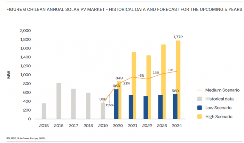 自Covid-19疫情爆發(fā)至今,光伏行業(yè)的表現(xiàn)不斷證明著其頑強的生命力和巨大的潛在需求。2020年,由于疫情影響,拉丁美洲很多光伏項目遭遇了延期和取消。隨著今年各國政府加快經(jīng)濟恢復和對新能源的支持力度加強,巴西、智利領(lǐng)銜的南美市場反彈明顯,2021年1-6月中國出口巴西4.16GW組件,較2020年有明顯增長。智利1-6月份組件出口市場中排名第八位,重回拉美第二大光伏市場,全年新增光伏裝機有望突破1GW,同時還有超過5GW的項目處于建設(shè)和評估階段。 開發(fā)商、制造商頻簽大單,智利大型項目“來勢洶洶” 近年來,得益于優(yōu)越的光照條件和政府對可再生能源的推動,智利吸引了眾多外資企業(yè)投資光伏電站。截止2020年底,光伏已占智利可再生能源裝機量的50%,領(lǐng)先于風能、水電及生物質(zhì)能等。 2020年7月,智利政府通過能源電價競標簽訂了11個公用事業(yè)規(guī)模的可再生能源項目的開發(fā)權(quán),總?cè)萘砍^2.6GW。這些項目的潛在投資總額超過25億美元,吸引了法國電力(EDF)、Engie、意大利電力公司(Enel)、SolarPack、Solarcentury、Sonnedix、Caldera Solar和CopiapoEnergiaSolar等全球性風力和太陽能發(fā)電站開發(fā)商參與投標。 今年上半年,全球風力和太陽能發(fā)電站開發(fā)商Mainstream Renewable宣布了由六個風電、光伏項目組成的投資計劃,總裝機容量超過1GW。此外,Engie智利公司也宣布將在智利開發(fā)兩個混合項目,包含光伏、風電和電池儲能,總?cè)萘繛?.5GW。西班牙投資公司AR Activos en Renta的子公司AR Energía還獲得了471.29MW的環(huán)評批準。這些項目雖然都在上半年發(fā)布,但是建設(shè)和并網(wǎng)周期則在未來三到五年內(nèi)完成。 2021需求和安裝量反彈,待并網(wǎng)項目超2.3GW 除了歐美投資商,中國的光伏企業(yè)在智利市場的參與度也是越來越高。CPIA近期公布的1-5月組件出口數(shù)據(jù)顯示,前五個月中國光伏產(chǎn)品出口金額98.6億美元,同比增長35.6%,組件出口36.9GW,同比增長35.1%。除了傳統(tǒng)的歐洲、日本、澳大利大等重點市場之外,包括巴西、智利在內(nèi)的新興市場增長明顯,這些受疫情影響較為嚴重的市場在今年加速反彈。 信息來源:CPIA 公開數(shù)據(jù)顯示,智利今年1-3月新增光伏裝機已經(jīng)超過1GW(包含去年延遲的項目),同時約有在建的光伏項目2.38GW,其中部分項目將在今年下半年并網(wǎng)。 智利市場迎來持續(xù)穩(wěn)步增長 根據(jù)分析機構(gòu)SPE在去年底發(fā)布的拉丁美洲投資報告顯示,智利是拉美地區(qū)經(jīng)濟最強勁、最穩(wěn)定的國家之一。憑借其穩(wěn)定的宏觀經(jīng)濟,智利獲得了標普A+信用評級,這是拉丁國家中最高的評級。世界銀行在2020年《營商環(huán)境報》中描述,在過去的幾年里,智利在多個領(lǐng)域?qū)嵤┝艘幌盗猩虡I(yè)監(jiān)管改革,不斷改善商業(yè)環(huán)境從而吸引更多的外商投資。同時,智利在執(zhí)行合同、解決破產(chǎn)問題和開辦企業(yè)的便捷性方面取得了改善。 在一系列利好政策的支持下,智利每年新增光伏裝機將有望實現(xiàn)持續(xù)穩(wěn)步增長。據(jù)預測,2021年按照最高預期光伏新增裝機將超過1.5GW(從目前已經(jīng)裝機和出口的數(shù)字來看,這一目標將極有可能實現(xiàn)),同時,未來三年,新增裝機容量范圍將在1.5GW-4.7GW之間。