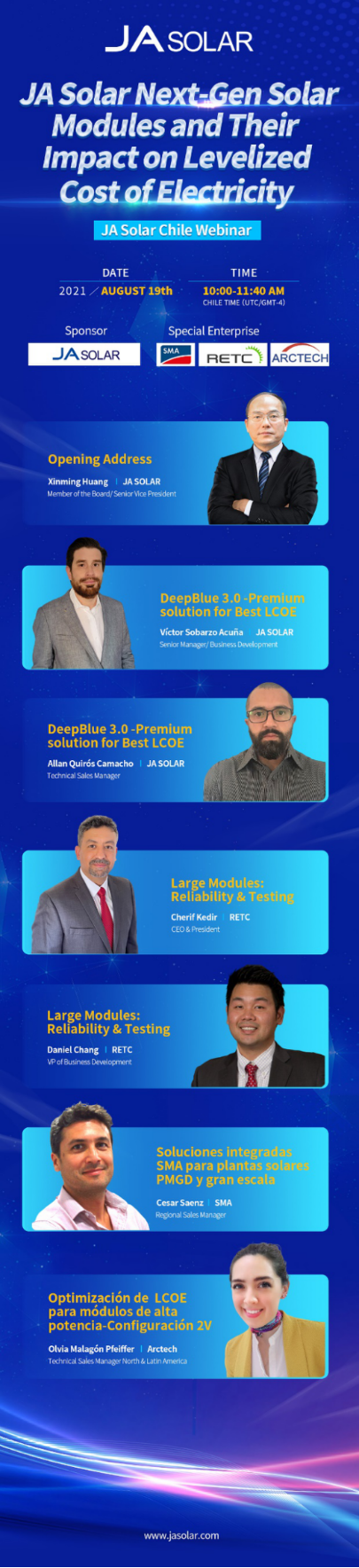 信息來源:Solar Power Europe 值得提出的是,隨著高功率組件和跟蹤支架的大面積應用,光伏度電成本LCOE不斷優(yōu)化,這將進一步推動光伏發(fā)電在智利可再生能源領(lǐng)域的優(yōu)勢占比。為了讓行業(yè)相關(guān)人士更好的了解大功率組件及其匹配的逆變器、跟蹤支架的設(shè)計、應用、測試和安裝經(jīng)驗,抓住智利光伏市場的發(fā)展機遇,晶澳科技、中信博、SMA、RETC將于8月19日攜手舉辦智利光伏市場線上研討會,會議議程如下: