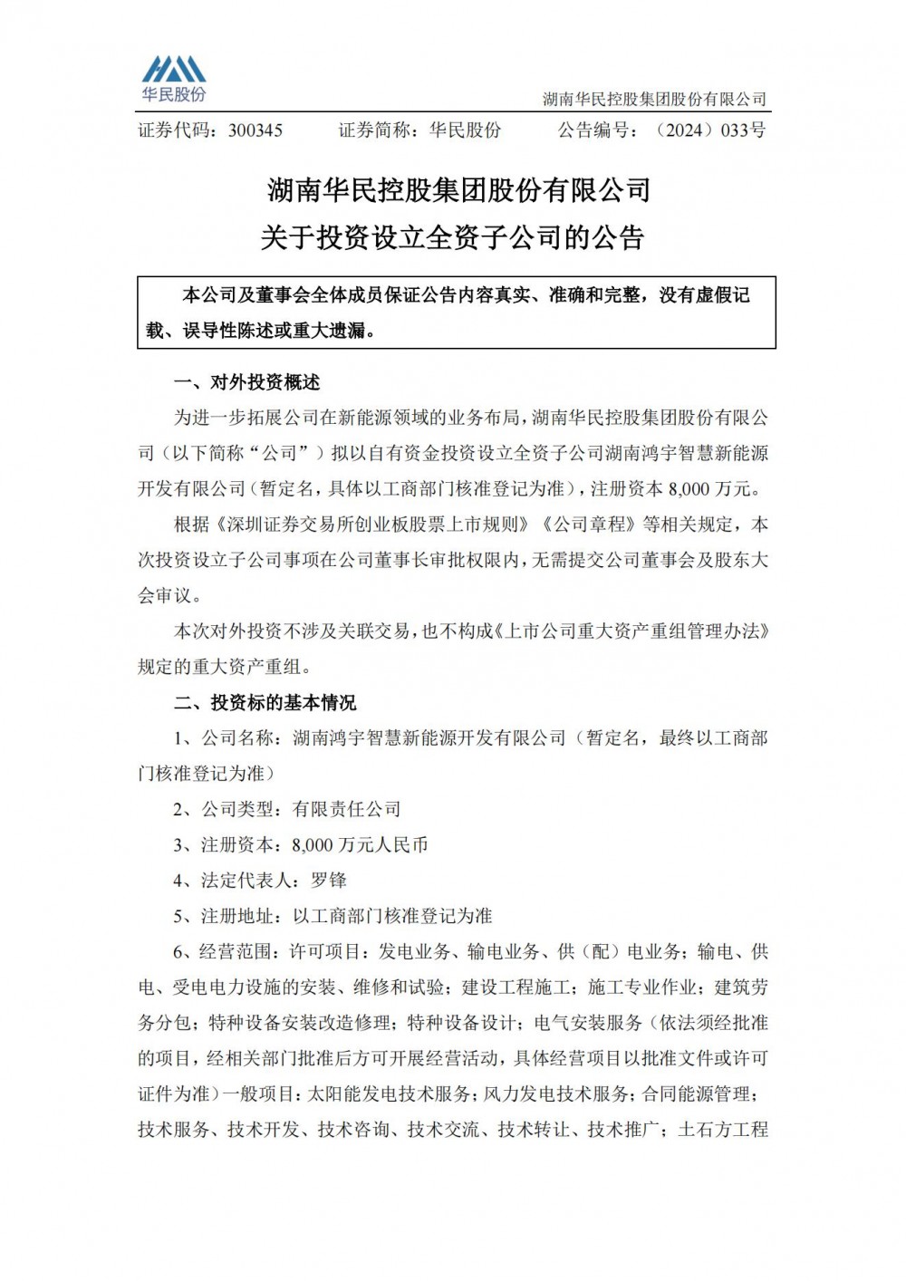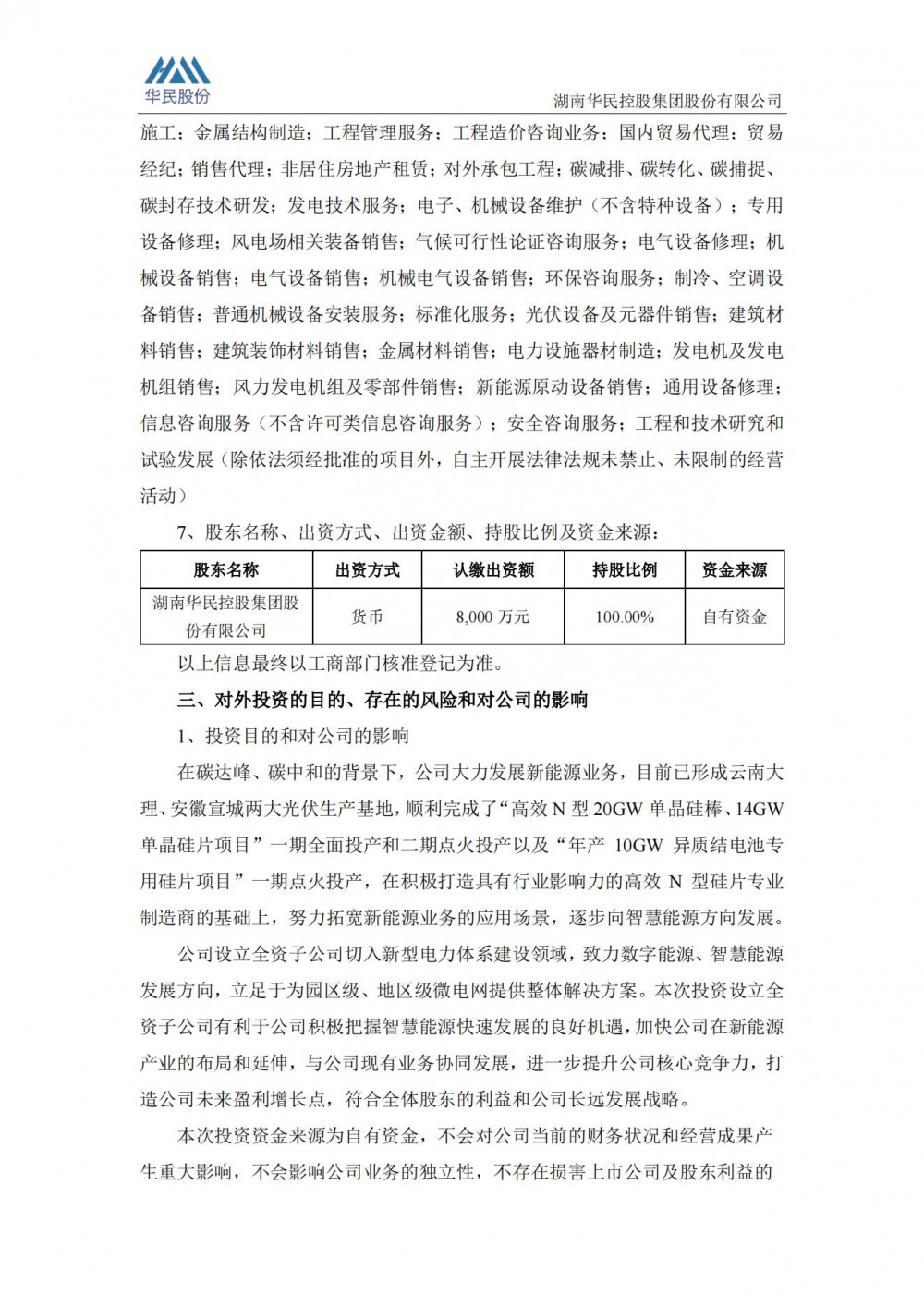 近日,湖南華民控股集團股份有限公司(簡稱:華民股份)稱,為進一步拓展公司在新能源領域的業(yè)務布局,華民股份擬以自有資金投資設立全資子公司湖南鴻宇智慧新能源開發(fā)有限公司(暫定名,具體以工商部門核準登記為準),注冊資本8000萬元。企業(yè)經(jīng)營范圍:許可項目:發(fā)電業(yè)務、輸電業(yè)務、供(配)電業(yè)務;輸電、供電、受電電力設施的安裝、維修和試驗;建設工程施工;施工專業(yè)作業(yè);建筑勞務分包;特種設備安裝改造修理;特種設備設計;電氣安裝服務(依法須經(jīng)批準的項目,經(jīng)相關(guān)部門批準后方可開展經(jīng)營活動,具體經(jīng)營項目以批準文件或許可證件為準)一般項目:太陽能發(fā)電技術(shù)服務;風力發(fā)電技術(shù)服務;合同能源管理;技術(shù)服務、技術(shù)開發(fā)、技術(shù)咨詢、技術(shù)交流、技術(shù)轉(zhuǎn)讓、技術(shù)推廣;土石方工程。 華民股份表示,在碳達峰、碳中和的背景下,公司大力發(fā)展新能源業(yè)務,目前已形成云南大理、安徽宣城兩大光伏生產(chǎn)基地,順利完成了“高效N型20GW單晶硅棒、14GW單晶硅片項目”一期全面投產(chǎn)和二期點火投產(chǎn)以及“年產(chǎn)10GW異質(zhì)結(jié)電池專用硅片項目”一期點火投產(chǎn),在積極打造具有行業(yè)影響力的高效N型硅片專業(yè)制造商的基礎上,努力拓寬新能源業(yè)務的應用場景,逐步向智慧能源方向發(fā)展。 公司設立全資子公司切入新型電力體系建設領域,致力數(shù)字能源、智慧能源發(fā)展方向,立足于為園區(qū)級、地區(qū)級微電網(wǎng)提供整體解決方案。本次投資設立全資子公司有利于公司積極把握智慧能源快速發(fā)展的良好機遇,加快公司在新能源產(chǎn)業(yè)的布局和延伸,與公司現(xiàn)有業(yè)務協(xié)同發(fā)展,進一步提升公司核心競爭力,打造公司未來盈利增長點,符合全體股東的利益和公司長遠發(fā)展戰(zhàn)略。 公告如下: