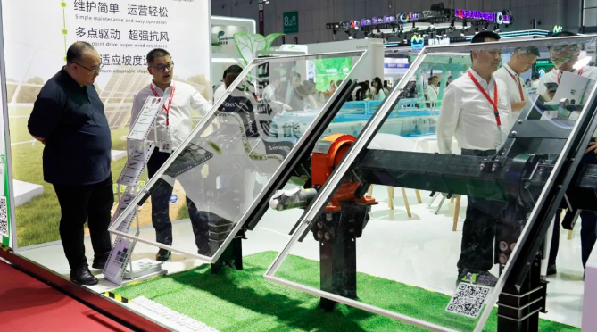 全面方案,適應(yīng)不同場景 邁貝特為SNEC上海展帶來了優(yōu)質(zhì)、安全、高效的全場景光伏系統(tǒng)解決方案,現(xiàn)場技術(shù)、銷售團(tuán)隊(duì)為來訪嘉賓提供了專業(yè)的解答和服務(wù)。 備受期待的新品跟蹤系統(tǒng)采用了“回轉(zhuǎn)+多推桿”的多點(diǎn)平行驅(qū)動設(shè)計(jì),解決了主軸不同步導(dǎo)致的扭曲和單邊懸臂過長造成的風(fēng)震現(xiàn)象問題。另外加入了領(lǐng)先的人工智能算法,對太陽能角度進(jìn)行有效追蹤,增加系統(tǒng)發(fā)電效率。