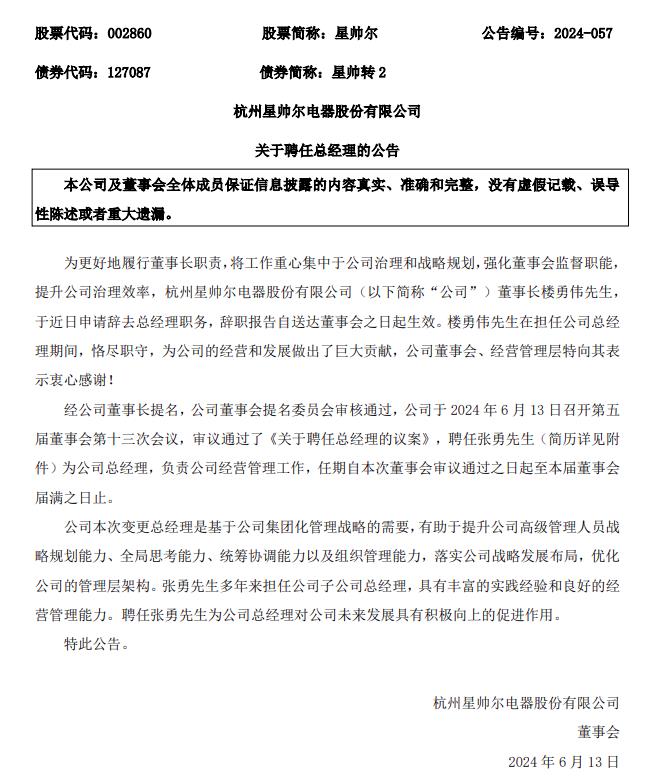 6月14日,星帥爾發(fā)布《關于聘任總經理的公告》,根據公告,星帥爾董事長樓勇偉先生,于近日申請辭去總經理職務,辭職報告自送達董事會之日起生效。經公司董事長提名,公司董事會提名委員會審核通過,聘任張勇先生為公司總經理,負責公司經營管理工作,任期自本次董事會審議通過之日起至本屆董事會屆滿之日止。
