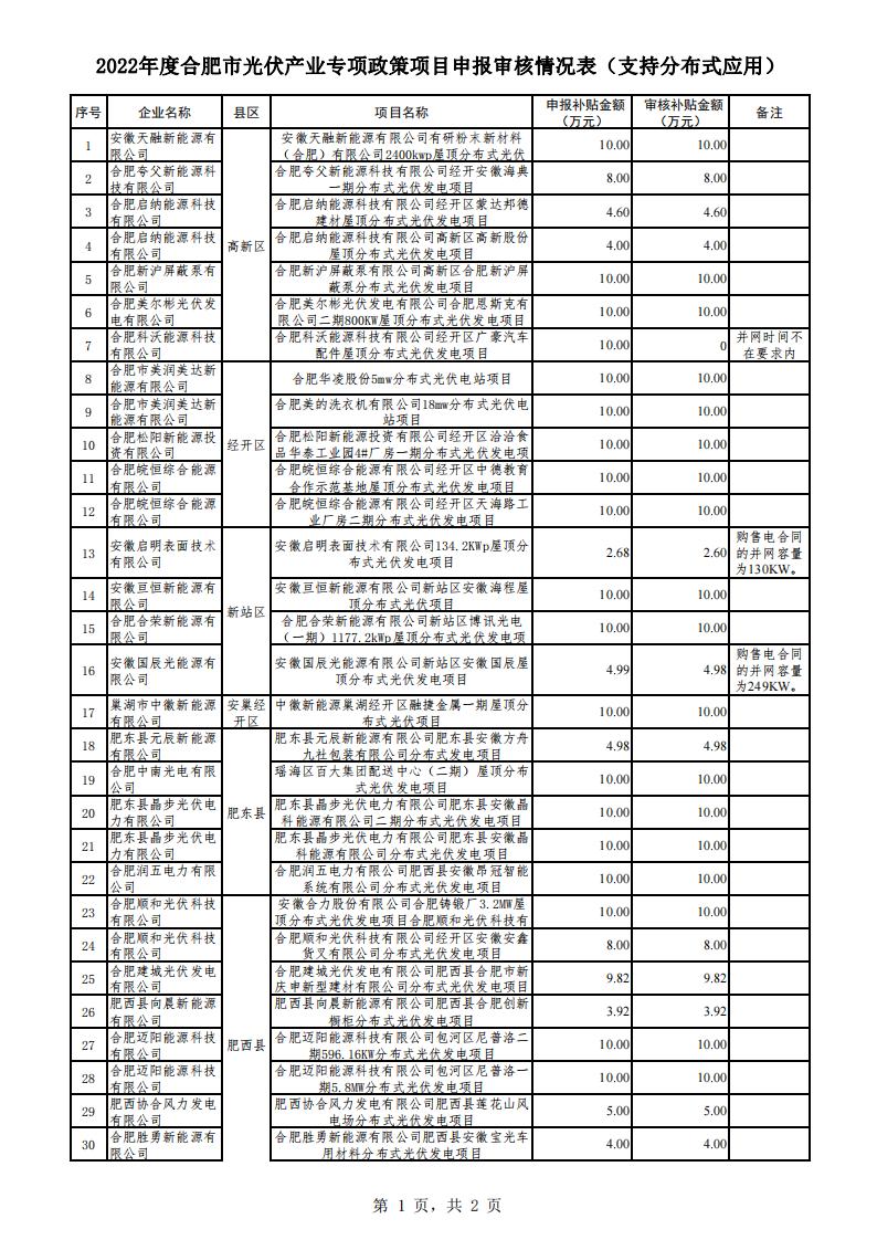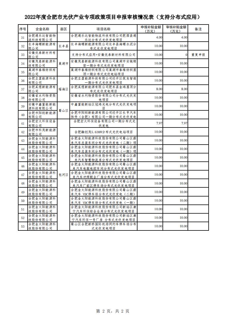 6月20日,安徽合肥市工業(yè)和信息化局發(fā)布關(guān)于2022年度合肥市進(jìn)一步促進(jìn)光伏產(chǎn)業(yè)高質(zhì)量發(fā)展若干政策支持分布式應(yīng)用項(xiàng)目補(bǔ)充申報獎補(bǔ)資金的公示。 根據(jù)公示文件,2022年度合肥市進(jìn)一步促進(jìn)光伏產(chǎn)業(yè)高質(zhì)量發(fā)展若干政策支持分布式應(yīng)用項(xiàng)目共計(jì)53個項(xiàng)目入選。其中,合肥科沃能源科技有限公司經(jīng)開區(qū)廣豪汽車配件屋頂分布式光伏發(fā)電項(xiàng)目申報補(bǔ)貼金額10萬元,由于并網(wǎng)時間不在要求內(nèi)并未通過;安徽優(yōu)泰新材料有限公司支持分布式應(yīng)用+安徽優(yōu)泰新材料有限公司項(xiàng)目因?yàn)橹貜?fù)申報并未通過。其余項(xiàng)目則獲得了合肥市進(jìn)一步促進(jìn)光伏產(chǎn)業(yè)高質(zhì)量發(fā)展若干政策支持分布式應(yīng)用項(xiàng)目補(bǔ)充申報獎補(bǔ)資金。 詳情如下: 關(guān)于2022年度合肥市進(jìn)一步促進(jìn)光伏產(chǎn)業(yè)高質(zhì)量發(fā)展若干政策 支持分布式應(yīng)用項(xiàng)目補(bǔ)充申報獎補(bǔ)資金的公示 根據(jù)《合肥市人民政府辦公室關(guān)于印發(fā)合肥市進(jìn)一步促進(jìn)光伏產(chǎn)業(yè)高質(zhì)量發(fā)展若干政策的通知》(合政辦秘〔2022〕30號)、《合肥市進(jìn)一步促進(jìn)光伏產(chǎn)業(yè)高質(zhì)量發(fā)展若干政策實(shí)施細(xì)則》(合經(jīng)信電子〔2022〕277號)等要求,現(xiàn)將2022年度合肥市進(jìn)一步促進(jìn)光伏產(chǎn)業(yè)高質(zhì)量發(fā)展若干政策支持分布式應(yīng)用項(xiàng)目補(bǔ)充申報獎補(bǔ)資金予以公示。公示期5天(2024年6月20日到6月24日),如有意見建議,請實(shí)名反饋。 業(yè)務(wù)咨詢:市工信局新能源產(chǎn)業(yè)處 63537880 反饋電話:市工信局機(jī)關(guān)黨委 63538563