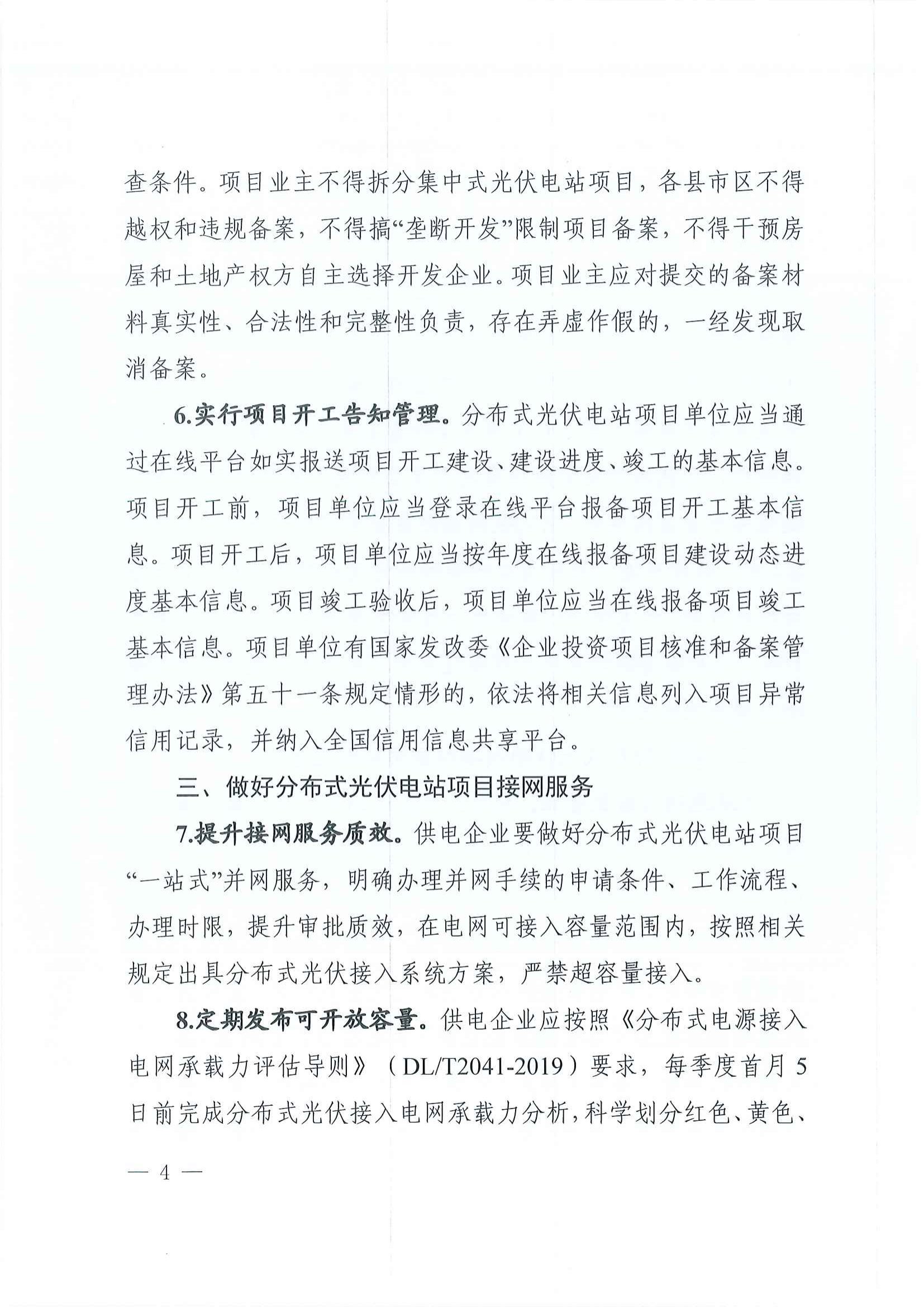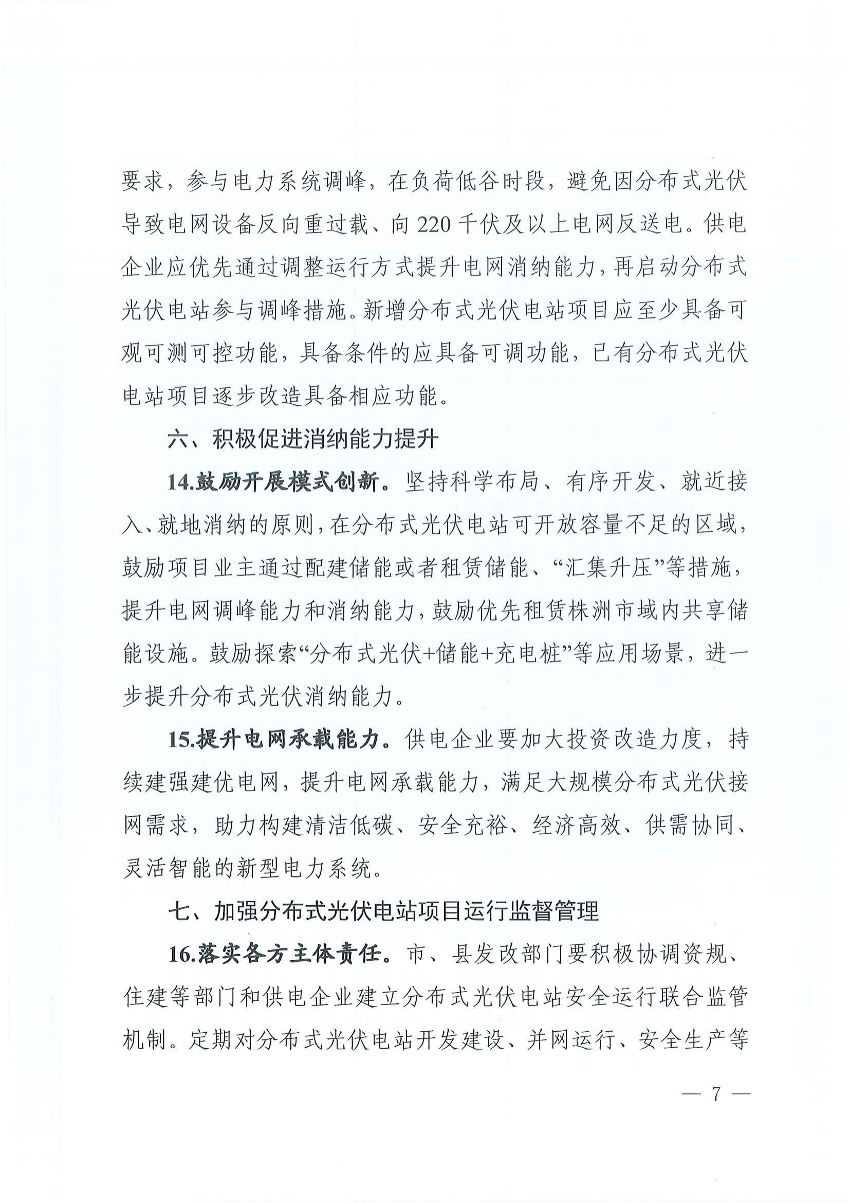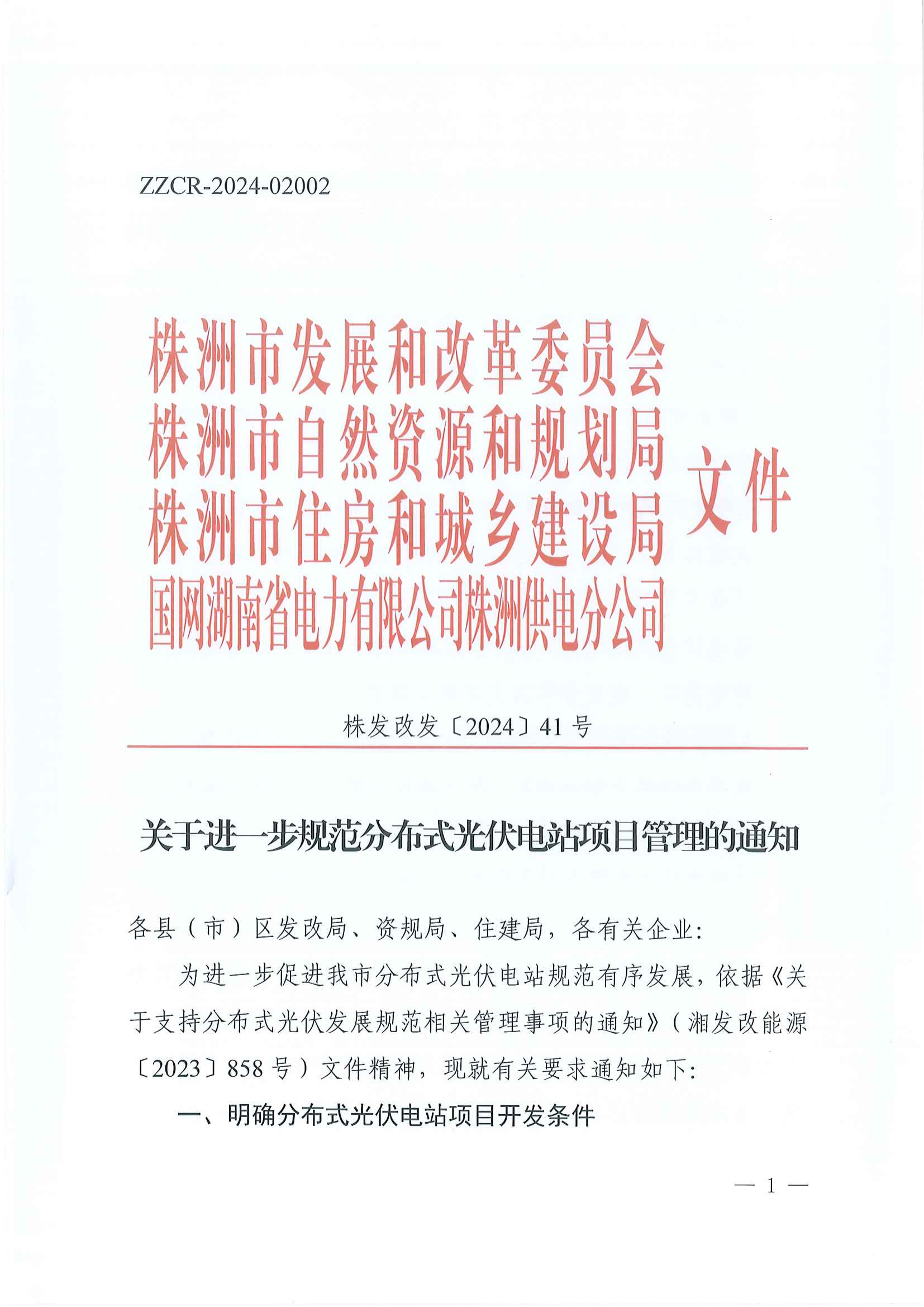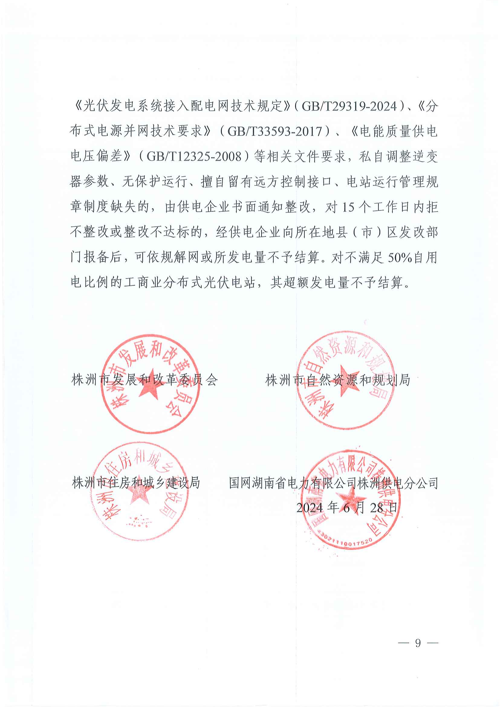 7月1日,株洲市發(fā)展和改革委員會、株洲市自然資源和規(guī)劃局、株洲市住房和城鄉(xiāng)建設(shè)局、國網(wǎng)湖南省電力有限公司株洲供電分公司聯(lián)合發(fā)布關(guān)于進一步規(guī)范分布式光伏電站項目管理的通知。 文件指出,株洲市分布式光伏電站分為戶用自然人光伏、工商業(yè)屋頂分布式光伏、工商業(yè)地面分布式光伏、戶用非自然人分布式光伏電站四類,除此之外的均為集中式光伏電站。 文件明確,優(yōu)先支持在綠色區(qū)域開發(fā)分布式光伏電站,確需在黃色區(qū)域開發(fā)分布式光伏電站,應(yīng)開展專項分析,落實消納和接入條件后,再行開發(fā),暫停在紅色區(qū)域新增分布式光伏電站接入。 文件提出,鼓勵開展模式創(chuàng)新。堅持科學(xué)布局、有序開發(fā)、就近接入、就地消納的原則,在分布式光伏電站可開放容量不足的區(qū)域鼓勵項目業(yè)主通過配建儲能或者租賃儲能、“匯集升壓”等措施,提升電網(wǎng)調(diào)峰能力和消納能力,鼓勵優(yōu)先租賃株洲市域內(nèi)共享儲能設(shè)施。鼓勵探索“分布式光伏+儲能+充電樁”等應(yīng)用場景,進一步提升分布式光伏消納能力。 提升電網(wǎng)承載能力。供電企業(yè)要加大投資改造力度,持續(xù)建強建優(yōu)電網(wǎng),提升電網(wǎng)承載能力,滿足大規(guī)模分布式光伏接網(wǎng)需求,助力構(gòu)建清潔低碳、安全充裕、經(jīng)濟高效、供需協(xié)同靈活智能的新型電力系統(tǒng)。 原文如下: