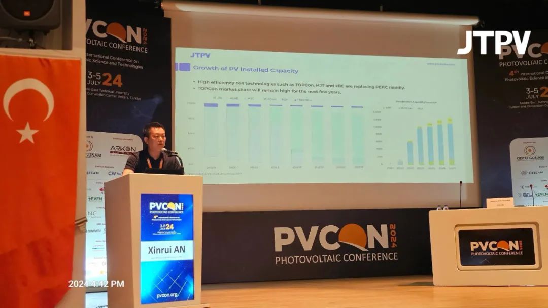 當(dāng)?shù)貢r間7月3日-5日,由ODTü-GüNAM主辦的第四屆國際光伏科學(xué)與技術(shù)會議(PVCON 2024)在土耳其中東技術(shù)大學(xué)文化與會議中心隆重舉辦。作為土耳其光伏科技領(lǐng)域最具權(quán)威性的學(xué)術(shù)盛會之一,PVCON 2024吸引了眾多國際學(xué)者、行業(yè)領(lǐng)袖及企業(yè)代表,共同聚焦光伏技術(shù)的最新進(jìn)展及未來趨勢。 國際視野:土耳其光伏市場前景廣闊 土耳其地區(qū)太陽能資源豐富,平均每日日照時間為7.5小時,具備安裝太陽能和光伏系統(tǒng)的最佳條件。近年來,中土經(jīng)貿(mào)關(guān)系實現(xiàn)穩(wěn)定發(fā)展,中國已成為土耳其在亞洲地區(qū)的第一大貿(mào)易伙伴。在能源轉(zhuǎn)型需求與日俱增的背景下,中國先進(jìn)光伏產(chǎn)品在土耳其市場出口呈現(xiàn)出明顯的增長趨勢。從需求端來看,土耳其作為全球第四大組件生產(chǎn)國,其制造模式以進(jìn)口電池為主,是海外電池需求最大的市場之一。 中國海關(guān)出口數(shù)據(jù)顯示,2023年,我國電池片出口土耳其10.11GW,同比增長77%。據(jù)統(tǒng)計,中國供應(yīng)的電池片占該國進(jìn)口電池片總量的95%以上,去年出口總額高達(dá)11.6億美元,市場發(fā)展前景廣闊。 同時,土耳其政府高度重視可再生能源產(chǎn)業(yè)發(fā)展,積極出臺光伏產(chǎn)業(yè)利好政策,并加速擴(kuò)大光伏發(fā)電裝機(jī)容量。土耳其國家能源規(guī)劃指出,在2035年之前,土耳其每年將需要5GW的太陽能和風(fēng)電容量,目標(biāo)至2035年光伏裝機(jī)容量達(dá)到52.9GW。種種數(shù)據(jù)表明,該地區(qū)光伏市場已進(jìn)入快速發(fā)展階段且未來市場發(fā)展?jié)摿捎^。 著眼于全球戰(zhàn)略和長遠(yuǎn)發(fā)展,捷泰科技高度重視海外市場,大力推動土耳其市場布局。捷泰科技產(chǎn)品研發(fā)經(jīng)理安欣睿博士出席此次PVCON 2024大會,就“High Efficiency N-type Cell and Module Technologies”發(fā)表主題演講。 在報告中,安博從“全球光伏市場前景”、“捷泰科技電池技術(shù)成果”、“組件發(fā)展趨勢展望”及“半片邊緣鈍化技術(shù)突破”等方面與在場行業(yè)代表展開了深度探討。 科技賦能:捷泰N型技術(shù)創(chuàng)新里程碑 安博指出,光伏行業(yè)已經(jīng)跨越了一個又一個技術(shù)里程碑。從PERC到N型TOPCon、異質(zhì)結(jié)的演變,從小尺寸到182/210大尺寸電池片的升級,以及從MBB(多主柵)到SMBB(超多主柵)再到0BB(無主柵)技術(shù)的革新,每一個轉(zhuǎn)變都標(biāo)志著光伏產(chǎn)業(yè)在提升效率、降低成本、增強(qiáng)產(chǎn)品競爭力方面的堅定步伐。 作為最早布局TOPCon路線的廠商之一,捷泰科技憑借深厚的技術(shù)積累,在2023年,先后完成了雙插、漸變膜、J-SE、J-SE+、J-STF等多項技術(shù)開發(fā),顯著降低了N型電池的工藝成本,大幅度提升了電池電性能。目前,公司已成功將Voc提升了12mV,最高電池開壓達(dá)到732 mV,TOPCon轉(zhuǎn)換效率突破26+%。 前沿布局:半片邊緣鈍化技術(shù)全新突破 為進(jìn)一步提升組件輸出功率,捷泰科技積極開展半片鈍化技術(shù)(Half-cut Edge Passivation/J-HEP)研發(fā),以先進(jìn)技術(shù)成果為下游客戶賦能。安博在報告中詳細(xì)分享了公司研發(fā)團(tuán)隊在J-HEP技術(shù)方面的最新進(jìn)展和顯著成果。 安博指出,該技術(shù)的全面導(dǎo)入,能夠有效修復(fù)激光切割過程中可能產(chǎn)生的邊緣損傷,并且同時降低了組件端碎片率以及因局部缺陷導(dǎo)致的EL不良比例。將HEP后的半片進(jìn)行測試和分選,可以使得電池片效率分布更加集中,從而進(jìn)一步提升填充因子(FF)及組件功率。 以標(biāo)準(zhǔn)72片182版型組件為例,無論是單玻組件還是雙玻組件,經(jīng)半片鈍化技術(shù)處理,疊加重新測試分檔,其最大輸出功率均可提高6W以上。 最新測試數(shù)據(jù)顯示,采用搭載該項技術(shù)的新一代“MoNo 2”電池片,182*72版型組件功率范圍可達(dá)585-600W;210*66和210R*66版型組件,最高功率可分別達(dá)到730W和635W,彰顯了捷泰科技新一代產(chǎn)品的卓越性能和強(qiáng)大市場競爭力。 此外,鈍化膜在組件層壓后不影響產(chǎn)品外觀,確保了產(chǎn)品的一致性和美觀度,這在未來競爭激烈的高效組件市場中具有重要的應(yīng)用價值和市場潛力。這一技術(shù)突破不僅為下游客戶帶來了實際效益,也展現(xiàn)了捷泰科技在光伏技術(shù)領(lǐng)域的專業(yè)實力和創(chuàng)新能力。 展望未來,捷泰科技將繼續(xù)秉承創(chuàng)新驅(qū)動的發(fā)展戰(zhàn)略,深化國際合作,推動光伏技術(shù)的持續(xù)進(jìn)步,為實現(xiàn)全球可持續(xù)發(fā)展目標(biāo)貢獻(xiàn)更多的中國智慧和中國力量。
