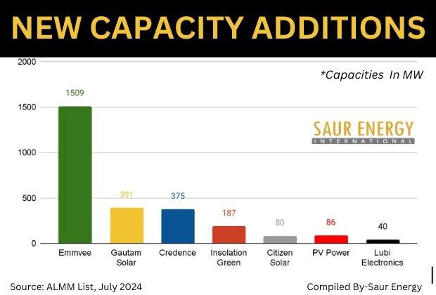 圖2 ALMM清單中光伏組件制造公司最新增加的產(chǎn)能 來自馬哈拉施特拉邦的光伏組件制造商PV Power公司和來自古吉拉特邦的Lubi Electronics公司也分別以86MW和40MW的產(chǎn)能進(jìn)入榜單。 此外,還有幾家光伏組件制造商也增加了產(chǎn)能。最新的ALMM清單表明,Citizen Solar公司在ALMM清單中的產(chǎn)能從70MW增加到150MW。Credence Solar公司也將其產(chǎn)能從125MW增加到500MW。Insolation Solar公司的產(chǎn)能從430MW增加到617MW。Gautam Solar將其產(chǎn)能從319MW增加到710MW。 就最高的光伏組件產(chǎn)能來說,Waaree公司在ALMM清單中繼續(xù)領(lǐng)先,其產(chǎn)能為10.77GW。緊隨其后的是Mundra Solar 公司(Adani),產(chǎn)能為4.1GW,緊隨其后的依次為ReNew公司(3.6GW)、First Solar公司(3.2GW)、Tata公司(3.19GW)、Emmvee公司(2.69GW)、Goldi Solar公司(2.60GW)以及Vikram Solar公司(2.4GW)。