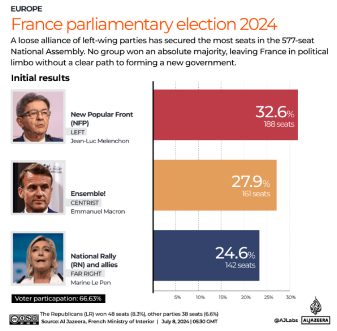 法國(guó):政策不確定性增加,光伏前景喜憂參半 相比之下,法國(guó)的政治局勢(shì)則顯得更為復(fù)雜多變,對(duì)光伏產(chǎn)業(yè)的影響也呈現(xiàn)出兩面性。 法國(guó)國(guó)民議會(huì)選舉的結(jié)果直接觸及了未來政府構(gòu)成與政策導(dǎo)向的核心,這一變動(dòng)不僅深刻重塑了法國(guó)的政治格局,還對(duì)能源戰(zhàn)略及光伏產(chǎn)業(yè)產(chǎn)生了深遠(yuǎn)影響。 在選舉初期,極右翼政黨“國(guó)民陣線”因其對(duì)新能源的打壓態(tài)度而備受關(guān)注,其首輪投票中意外獲得高票,一度讓新能源產(chǎn)業(yè)界憂心忡忡。然而,隨著第二輪投票的塵埃落定,“國(guó)民陣線”未能如愿掌控政權(quán),為光伏產(chǎn)業(yè)帶來了一絲慰藉。 然而,選舉的波瀾并未完全平息,政治暗流依舊涌動(dòng),法國(guó)政治格局的未來走向依然籠罩在不確定性之中。 根據(jù)法國(guó)內(nèi)政部公布的最終選舉結(jié)果,三大政治派別均未能取得絕對(duì)多數(shù)席位(即289席),馬克龍所在的執(zhí)政黨陣營(yíng)僅獲得161個(gè)席位,位居第二。