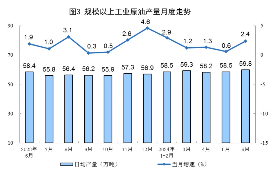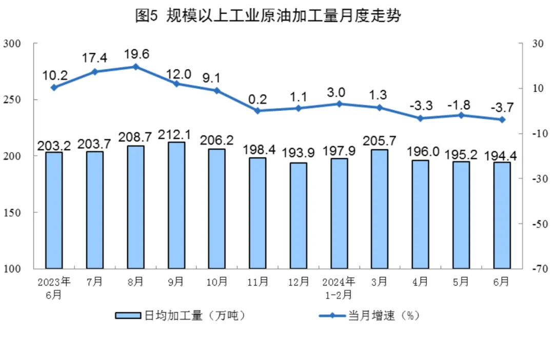 原油生產增速加快。6月份,規(guī)上工業(yè)原油產量1795萬噸,同比增長2.4%,增速比5月份加快1.8個百分點;日均產量59.8萬噸。進口原油4645萬噸,同比下降10.7%。 1—6月份,規(guī)上工業(yè)原油產量10705萬噸,同比增長1.9%。進口原油27548萬噸,同比下降2.3%。 原油加工有所下降。6月份,規(guī)上工業(yè)原油加工量5832萬噸,同比下降3.7%,降幅比5月份擴大1.9個百分點;日均加工194.4萬噸。1—6月份,規(guī)上工業(yè)原油加工量36009萬噸,同比下降0.4%。