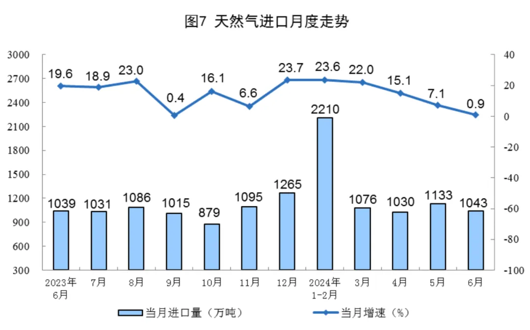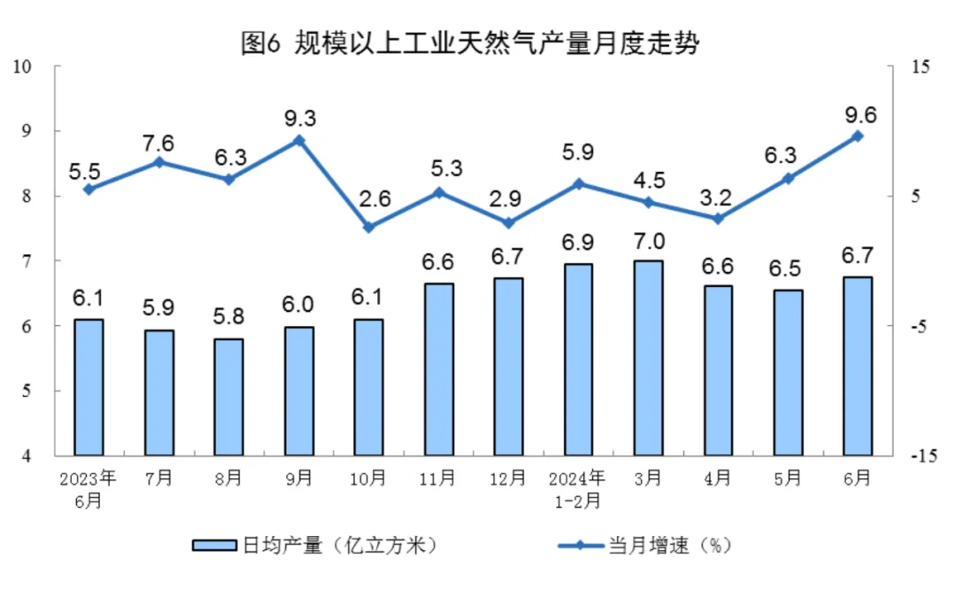 天然氣生產加快。6月份,規(guī)上工業(yè)天然氣產量202億立方米,同比增長9.6%,增速比5月份加快3.3個百分點;日均產量6.7億立方米。進口天然氣1043萬噸,同比增長0.9%。 1—6月份,規(guī)上工業(yè)天然氣產量1236億立方米,同比增長6.0%。進口天然氣6465萬噸,同比增長14.3%。