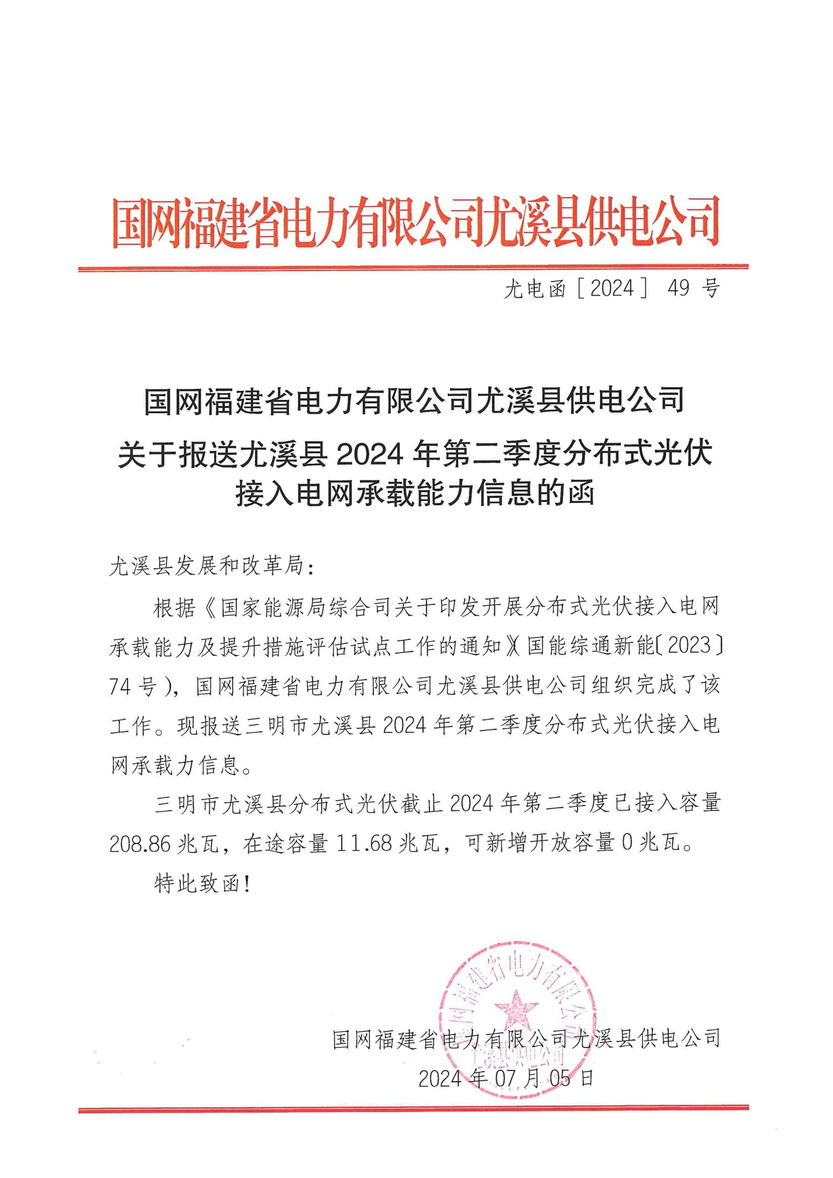 7月23日,尤溪縣發(fā)改局發(fā)布關(guān)于尤溪縣2024年第二季度分布式光伏接入電網(wǎng)承載力信息的復(fù)函,原則同意國網(wǎng)福建省電力有限公司尤溪縣供電公司測(cè)算匯總的尤溪縣供電區(qū)域內(nèi)截至2024年第二季度分布式光伏接入可新增開放容量為0兆瓦。在后續(xù)分布式光伏發(fā)電項(xiàng)目備案時(shí),尤溪縣發(fā)展和改革局將加強(qiáng)與貴公司信息溝通,有序引導(dǎo)項(xiàng)目單位開展分布式光伏接入申請(qǐng)有關(guān)事宜。 三明市尤溪縣分布式光伏截止2024年第二季度已接入容量208.86兆瓦,在途容量11.68兆瓦,可新增開放容量0兆瓦。 原文如下: 關(guān)于尤溪縣2024年第二季度分布式光伏接入電網(wǎng)承載力信息的復(fù)函 國網(wǎng)福建省電力有限公司尤溪縣供電公司: 貴公司《關(guān)于報(bào)送尤溪縣2024年第二季度分布式光伏接入電網(wǎng)承載力信息的函》收悉,經(jīng)研究,原則同意貴公司測(cè)算匯總的尤溪縣供電區(qū)域內(nèi)截至2024年第二季度分布式光伏接入可新增開放容量為0兆瓦。在后續(xù)分布式光伏發(fā)電項(xiàng)目備案時(shí),我局將加強(qiáng)與貴公司信息溝通,有序引導(dǎo)項(xiàng)目單位開展分布式光伏接入申請(qǐng)有關(guān)事宜。 下一步,我局將按照省、市的統(tǒng)一工作安排,會(huì)同貴公司做好分布式光伏可開放容量信息公開等相關(guān)工作。 特此函復(fù)。 附件:國網(wǎng)福建省電力有限公司尤溪縣供電公司關(guān)于報(bào)送尤溪縣2024年第二季度分布式光伏接入電網(wǎng)承載力信息的函(尤電函〔2024〕49號(hào)) 尤溪縣發(fā)展和改革局 2024年7月23日