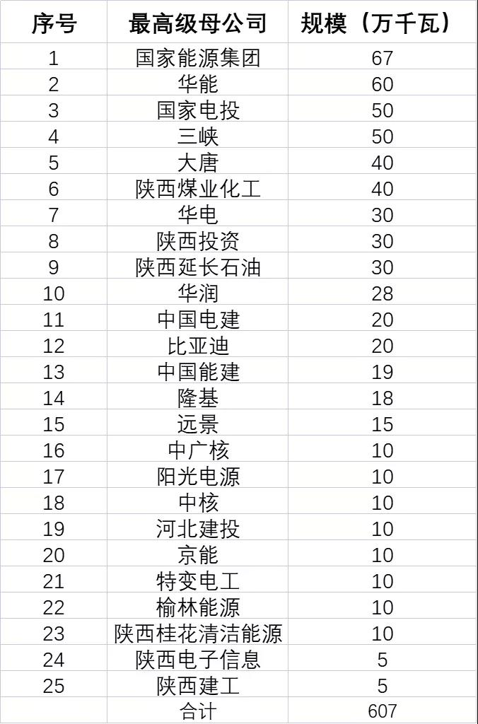 陜西6.07GW光伏、風(fēng)電項(xiàng)目名單公布:國家能投、華能、國家電投、三峽領(lǐng)銜9月7日,陜西能源局公布2021年風(fēng)電、光伏發(fā)電保障性并網(wǎng)項(xiàng)目競(jìng)爭(zhēng)性配置結(jié)果,確定了55個(gè)項(xiàng)目共計(jì)607萬千瓦納入2021年陜西省風(fēng)電、光伏發(fā)電項(xiàng)目保障性并網(wǎng)規(guī)模(其中風(fēng)電9個(gè)88萬千瓦,光伏46個(gè)519萬千瓦)。 從最高級(jí)母公司統(tǒng)計(jì)來看,國家能源投資集團(tuán)、華能、國家電投、三峽、大唐位列TOP 5,詳情如下: