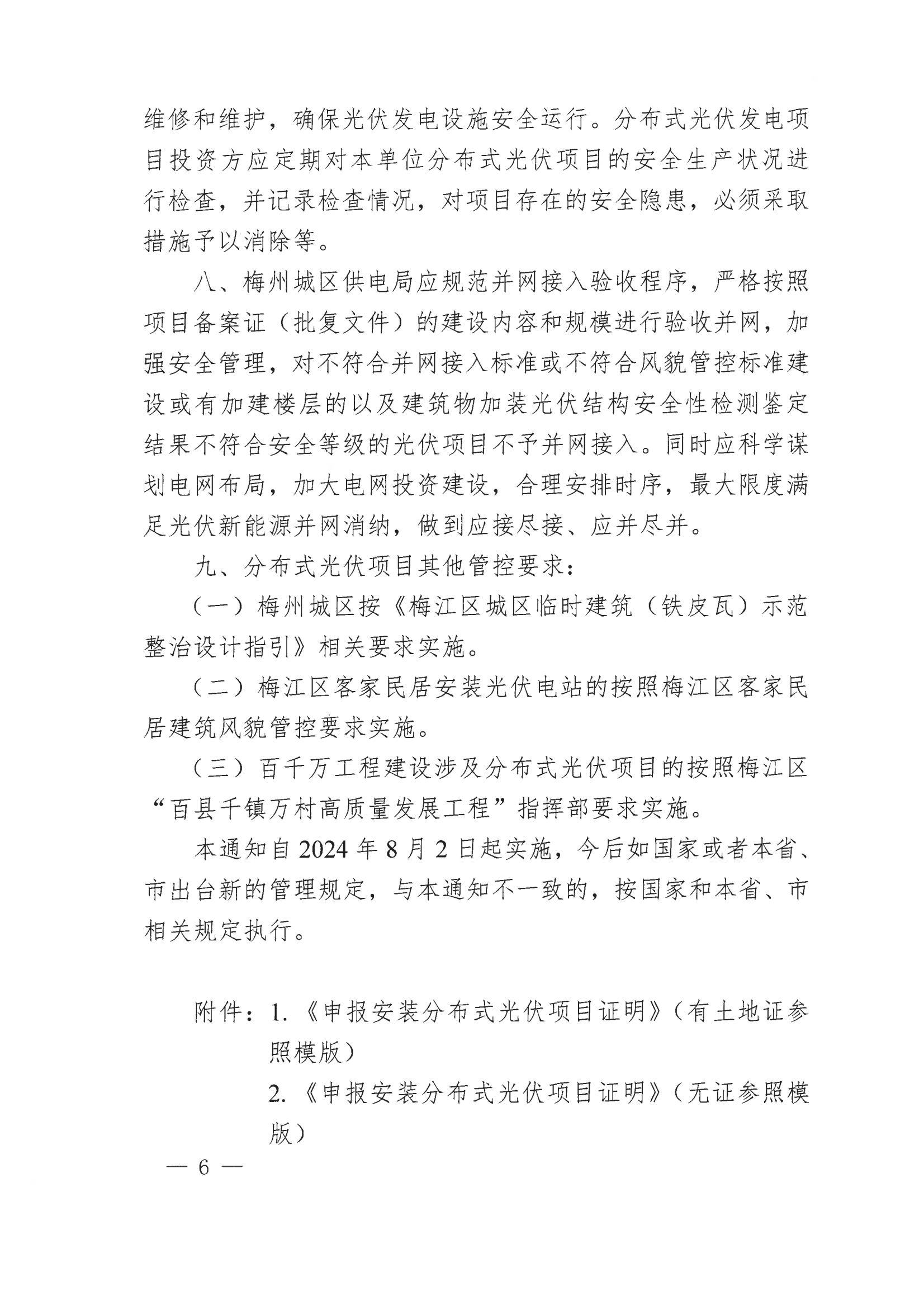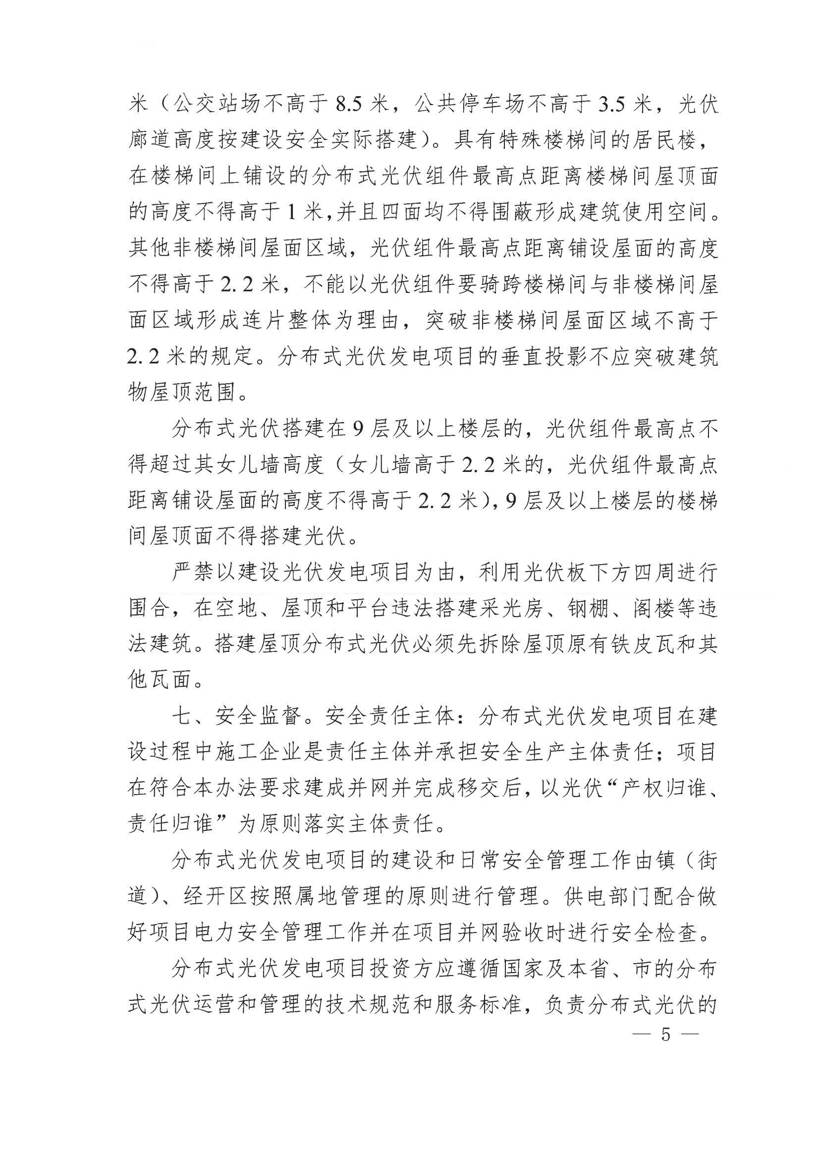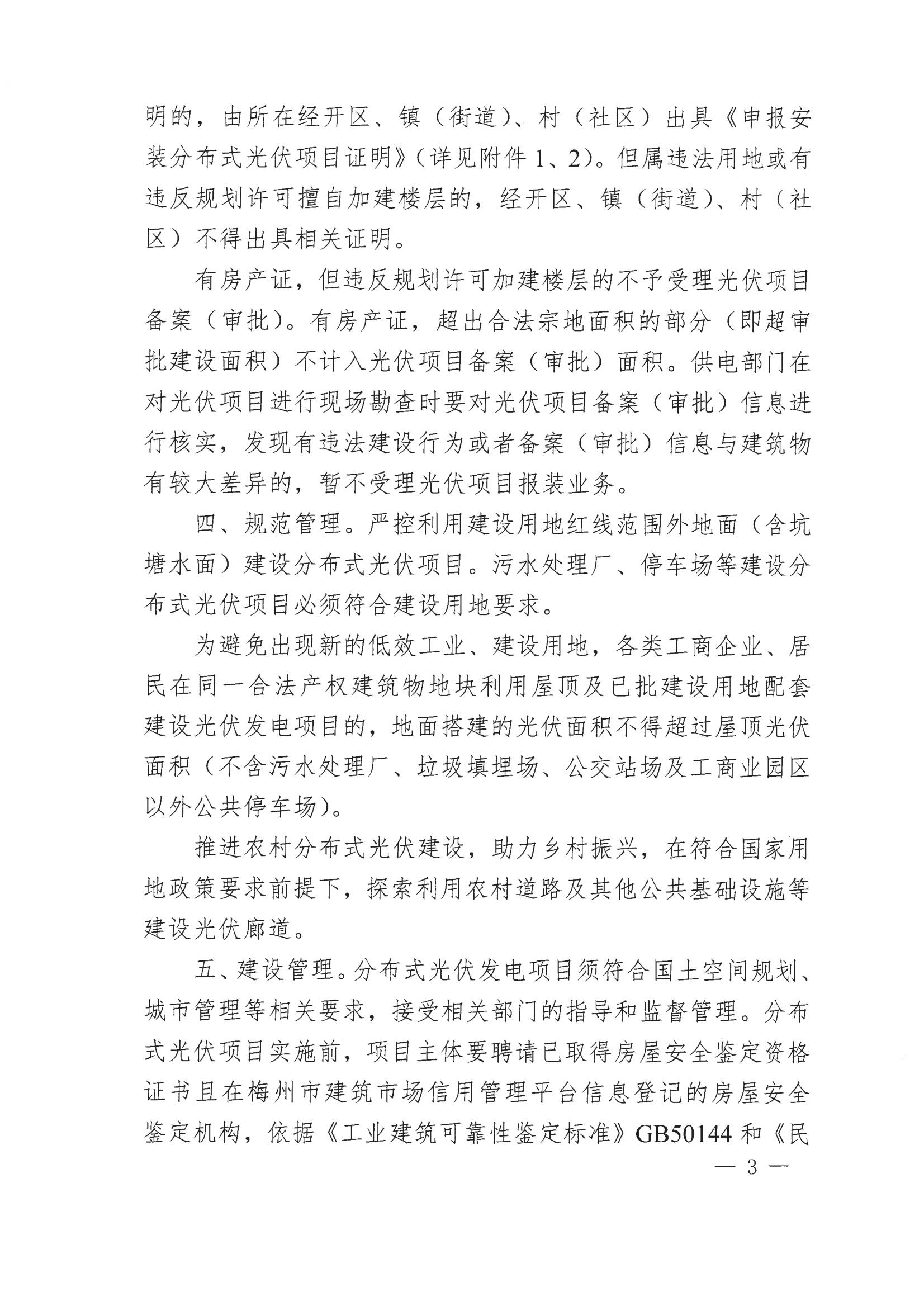 8月6日,廣東省梅州市梅江區(qū)發(fā)改局發(fā)布《關(guān)于加強分布式光伏發(fā)電項目管理的通知》,《通知》要求,分布式光伏項目建設(shè)前應(yīng)履行項目備案(審批)手續(xù),并取得發(fā)改部門的備案證(批復(fù)文件)后方可進行項目建設(shè)。其中非居民分布式光伏項目還需通過電網(wǎng)公司組織的接入系統(tǒng)資料審查并經(jīng)審查通過后方可進行項目建設(shè)。分布式光伏組件最高點距離鋪設(shè)屋面(地面)的高度不得高于2.2米(公交站場不高于8.5米,公共停車場不高于3.5 米,光伏廊道高度按建設(shè)安全實際搭建)。具有特殊樓梯間的居民樓,在樓梯間上鋪設(shè)的分布式光伏組件最高點距離樓梯間屋頂面的高度不得高于1米,并且四面均不得圍蔽形成建筑使用空間。 其他非樓梯間屋面區(qū)域,光伏組件最高點距離鋪設(shè)屋面的高度不得高于2.2米,不能以光伏組件要騎跨樓梯間與非樓梯間屋面區(qū)域形成連片整體為理由,突破非樓梯間屋面區(qū)域不高于2.2米的規(guī)定。分布式光優(yōu)發(fā)電項目的垂直投影不應(yīng)突破建筑物屋頂范圍。 分布式光伏搭建在9層及以上樓層的,光伏組件最高點不得超過其女兒墻高度(女兒墻高于2.2米的,光伏組件最高點距離鋪設(shè)屋面的高度不得高于2.2米),9層及以上樓層的樓梯間屋頂面不得搭建光伏。 嚴禁以建設(shè)光伏發(fā)電項目為由,利用光伏板下方四周進行圍合,在空地、屋頂和平臺違法搭建采光房、鋼棚、閣樓等違法建筑。搭建屋頂分布式光伏必須先拆除屋頂原有鐵皮瓦和其他瓦面。 全文如下: