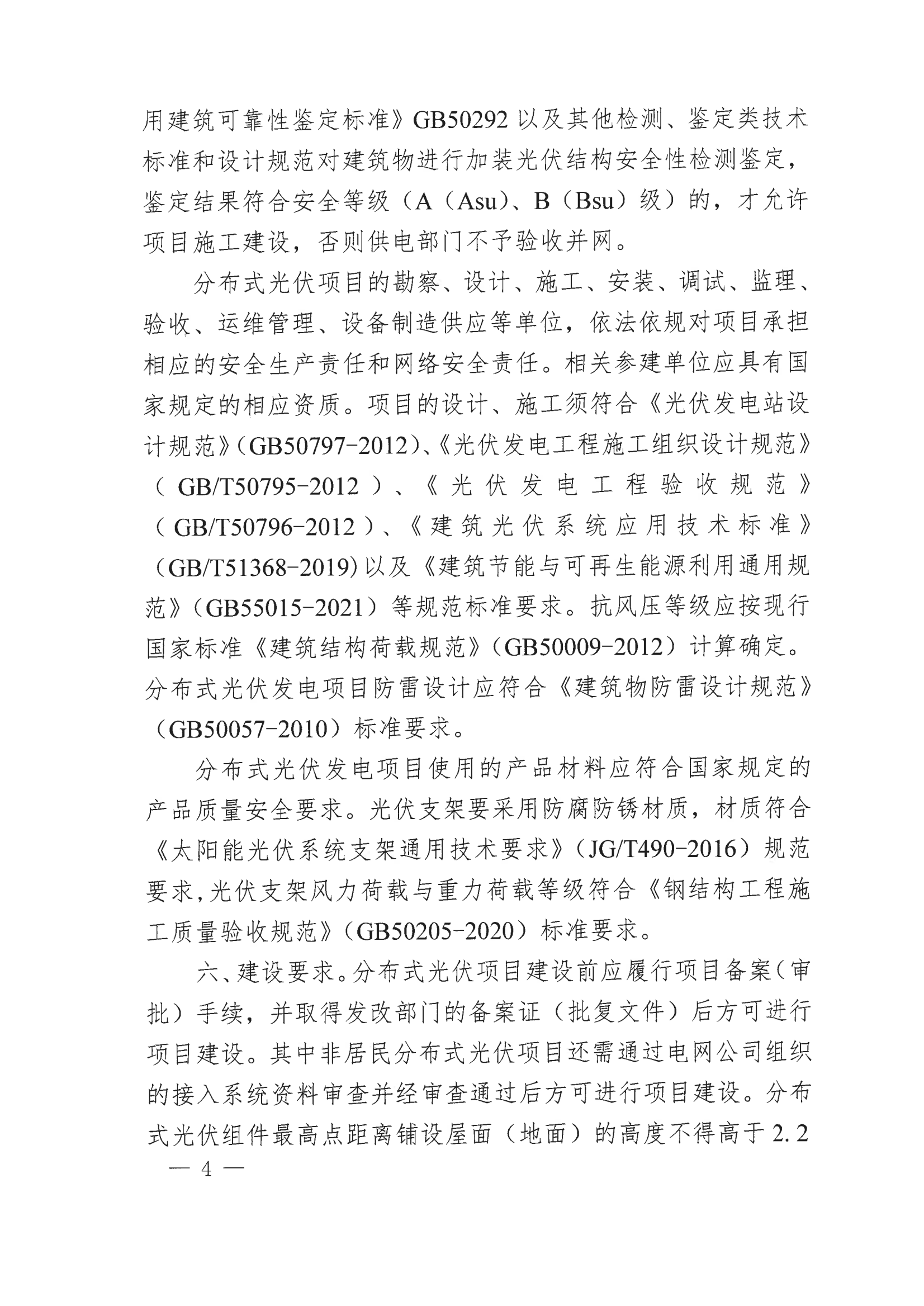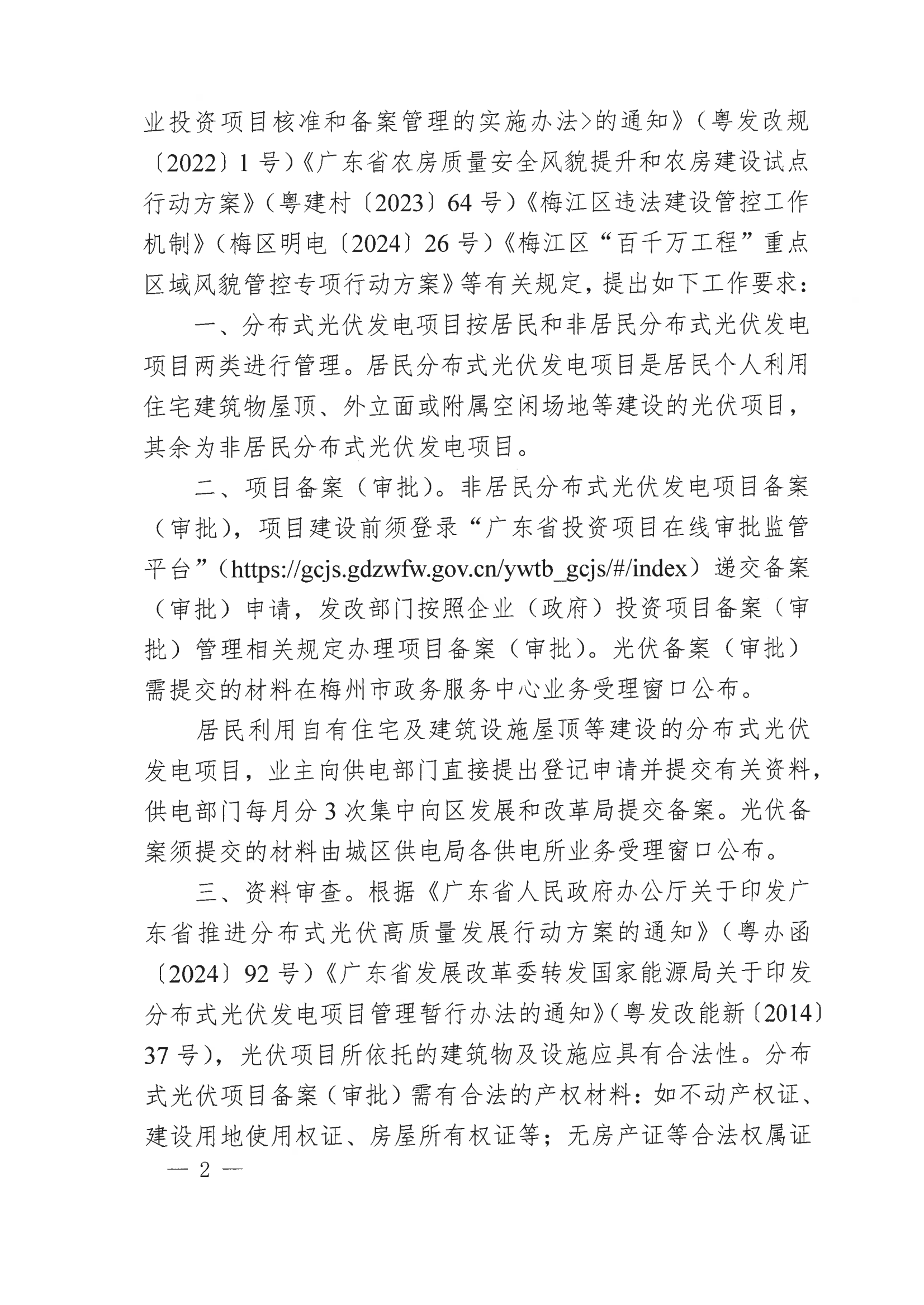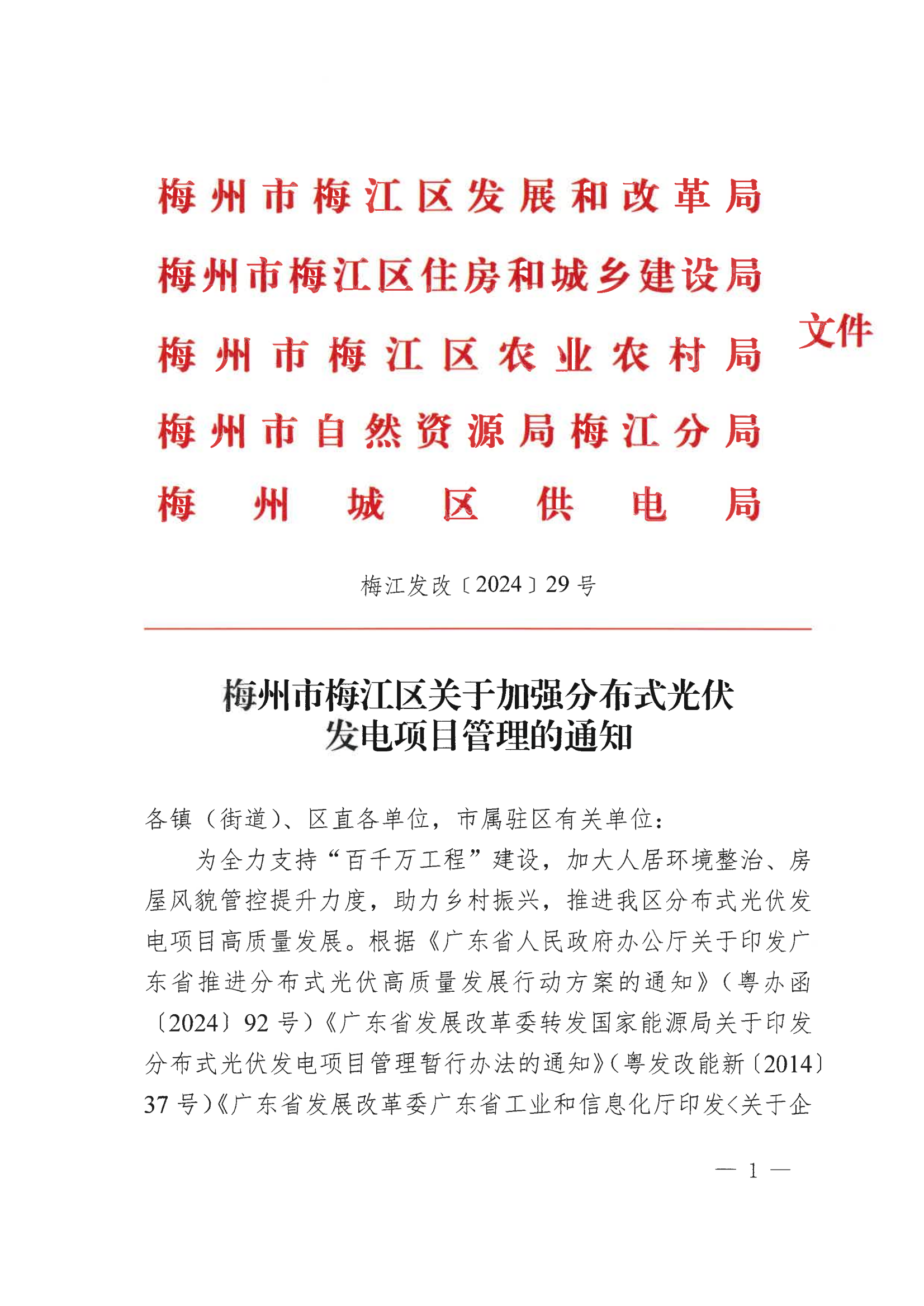 8月6日,廣東省梅州市梅江區(qū)發(fā)改局發(fā)布《關(guān)于加強分布式光伏發(fā)電項目管理的通知》,《通知》要求,分布式光伏項目建設(shè)前應(yīng)履行項目備案(審批)手續(xù),并取得發(fā)改部門的備案證(批復(fù)文件)后方可進行項目建設(shè)。其中非居民分布式光伏項目還需通過電網(wǎng)公司組織的接入系統(tǒng)資料審查并經(jīng)審查通過后方可進行項目建設(shè)。分布式光伏組件最高點距離鋪設(shè)屋面(地面)的高度不得高于2.2米(公交站場不高于8.5米,公共停車場不高于3.5 米,光伏廊道高度按建設(shè)安全實際搭建)。具有特殊樓梯間的居民樓,在樓梯間上鋪設(shè)的分布式光伏組件最高點距離樓梯間屋頂面的高度不得高于1米,并且四面均不得圍蔽形成建筑使用空間。 其他非樓梯間屋面區(qū)域,光伏組件最高點距離鋪設(shè)屋面的高度不得高于2.2米,不能以光伏組件要騎跨樓梯間與非樓梯間屋面區(qū)域形成連片整體為理由,突破非樓梯間屋面區(qū)域不高于2.2米的規(guī)定。分布式光優(yōu)發(fā)電項目的垂直投影不應(yīng)突破建筑物屋頂范圍。 分布式光伏搭建在9層及以上樓層的,光伏組件最高點不得超過其女兒墻高度(女兒墻高于2.2米的,光伏組件最高點距離鋪設(shè)屋面的高度不得高于2.2米),9層及以上樓層的樓梯間屋頂面不得搭建光伏。 嚴禁以建設(shè)光伏發(fā)電項目為由,利用光伏板下方四周進行圍合,在空地、屋頂和平臺違法搭建采光房、鋼棚、閣樓等違法建筑。搭建屋頂分布式光伏必須先拆除屋頂原有鐵皮瓦和其他瓦面。 全文如下:
