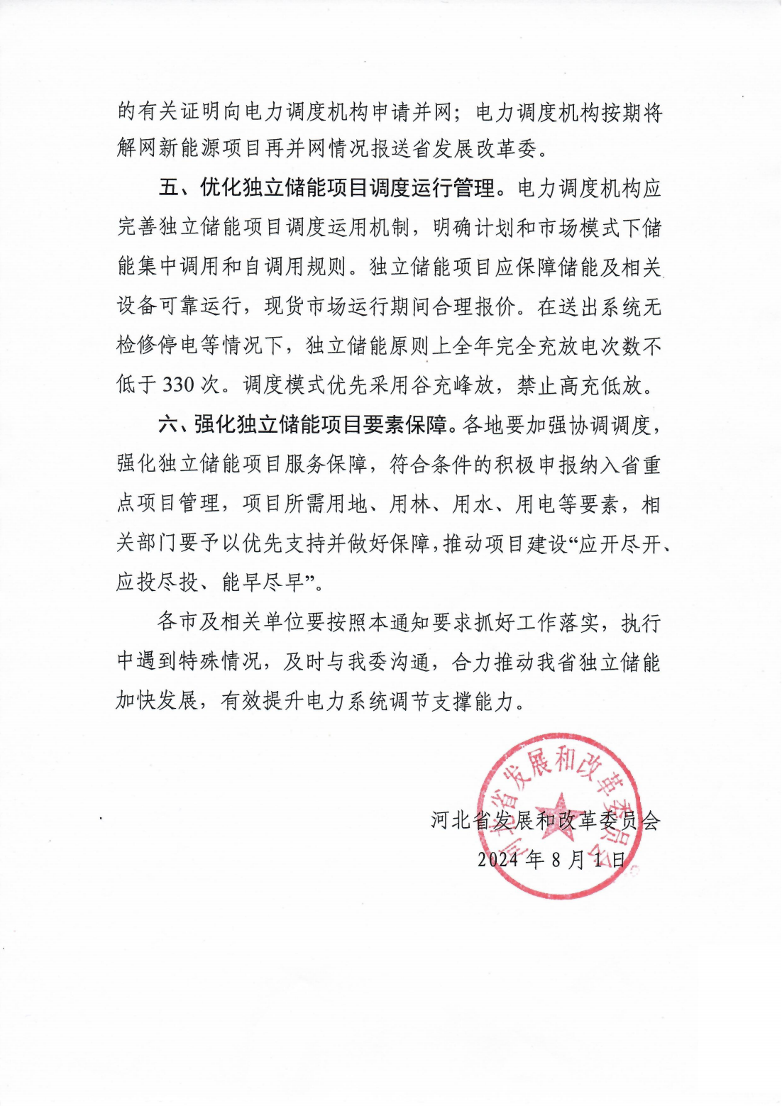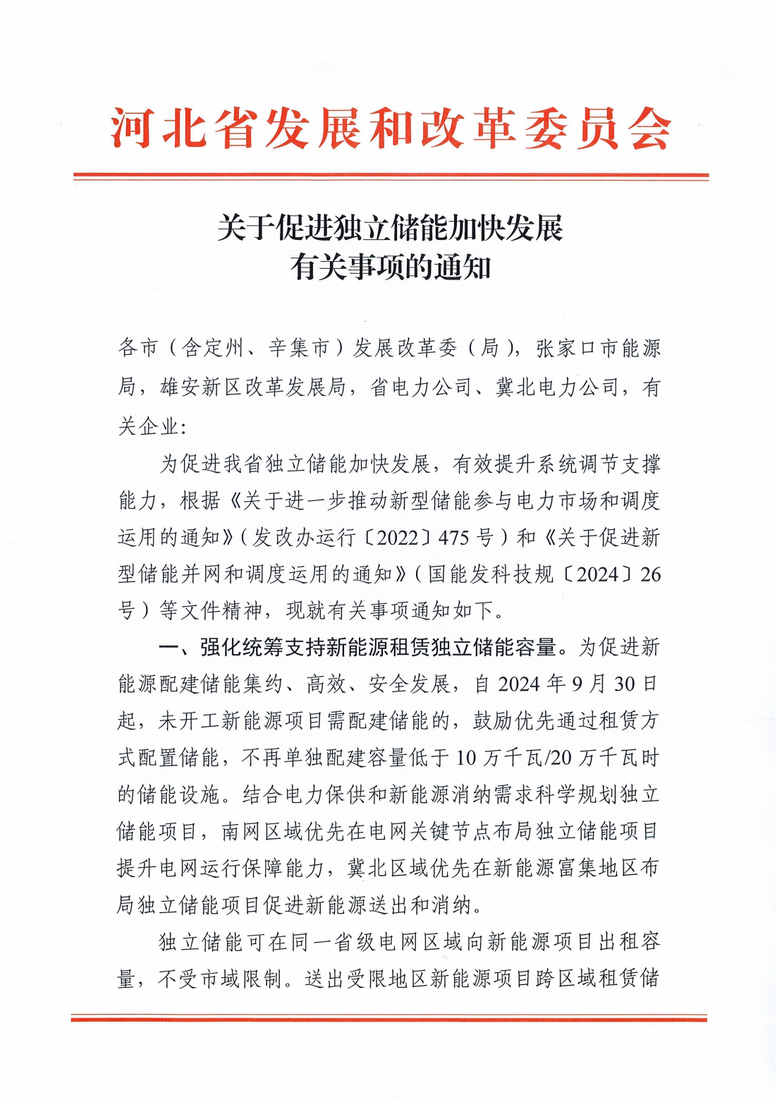 8月1日,河北省發(fā)改委發(fā)布《關(guān)于促進(jìn)獨(dú)立儲(chǔ)能加快發(fā)展有關(guān)事項(xiàng)的通知》,通知指出: 強(qiáng)化統(tǒng)籌支持新能源租賃獨(dú)立儲(chǔ)能容量。為促進(jìn)新能源配建儲(chǔ)能集約、高效、安全發(fā)展,自2024年9月30日起,未開(kāi)工新能源項(xiàng)目需配建儲(chǔ)能的,鼓勵(lì)優(yōu)先通過(guò)租賃方式配置儲(chǔ)能,不再單獨(dú)配建容量低于10萬(wàn)千瓦/20萬(wàn)千瓦時(shí)的儲(chǔ)能設(shè)施。 獨(dú)立儲(chǔ)能可在同一省級(jí)電網(wǎng)區(qū)域向新能源項(xiàng)目出租容量,不受市域限制。送出受限地區(qū)新能源項(xiàng)目跨區(qū)域租賃儲(chǔ)能容量的,電網(wǎng)公司要做好棄電風(fēng)險(xiǎn)增大提示,新能源項(xiàng)目自愿承擔(dān)風(fēng)險(xiǎn)。 完善儲(chǔ)能容量租賃匹配管理。優(yōu)先支持新能源項(xiàng)目租賃相應(yīng)時(shí)長(zhǎng)的獨(dú)立儲(chǔ)能電站容量。租賃時(shí)長(zhǎng)不一致的,可租賃一家或多家獨(dú)立儲(chǔ)能項(xiàng)目滿(mǎn)足配儲(chǔ)功率和電能量要求。電能量不滿(mǎn)足要求的,按比例折算容量差額。 明確考核措施促進(jìn)儲(chǔ)能容量租賃。新建新能源項(xiàng)目未完成配建儲(chǔ)能建設(shè)或租賃儲(chǔ)能容量的,不得并網(wǎng)發(fā)電。已并網(wǎng)新能源項(xiàng)目未足額租賃儲(chǔ)能容量的,其容量差額部分按照全網(wǎng)當(dāng)月容量租賃均價(jià)的1.2倍支付相應(yīng)容量租賃費(fèi)用。 優(yōu)化獨(dú)立儲(chǔ)能項(xiàng)目調(diào)度運(yùn)行管理。獨(dú)立儲(chǔ)能項(xiàng)目應(yīng)保障儲(chǔ)能及相關(guān)設(shè)備可靠運(yùn)行,現(xiàn)貨市場(chǎng)運(yùn)行期間合理報(bào)價(jià)。在送出系統(tǒng)無(wú)檢修停電等情況下,獨(dú)立儲(chǔ)能原則上全年完全充放電次數(shù)不低于330次。調(diào)度模式優(yōu)先采用谷充峰放,禁止高充低放。 強(qiáng)化獨(dú)立儲(chǔ)能項(xiàng)目要素保障。獨(dú)立儲(chǔ)能項(xiàng)目所需用地、用林、用水、用電等要素,相關(guān)部門(mén)要予以?xún)?yōu)先支持并做好保障,推動(dòng)項(xiàng)目建設(shè)“應(yīng)開(kāi)盡開(kāi)、應(yīng)投盡投、能早盡早”。 原文如下: