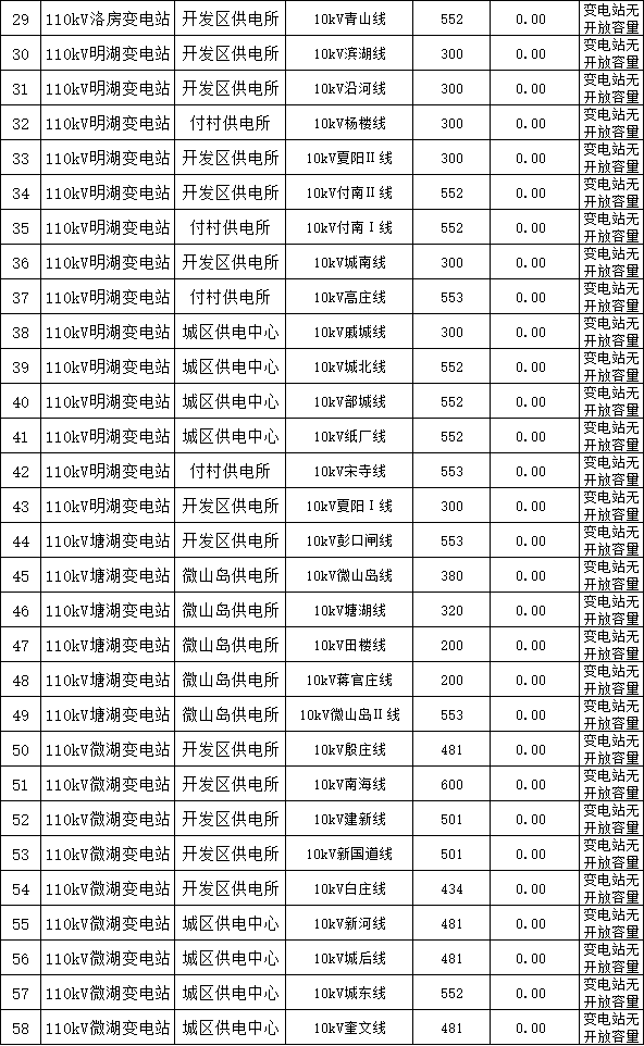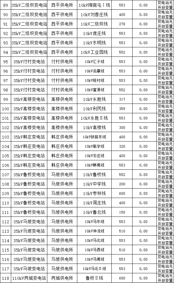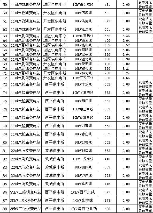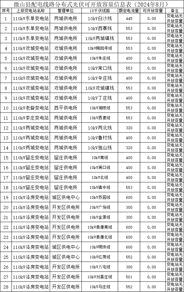 8月19日,山東省濟(jì)寧市微山縣人民政府公布2024年8月微山縣配電線路分布式光伏可開(kāi)放容量信息表。信息表顯示,8月份微山縣108處10千伏配電線路已無(wú)可接入分布式光伏容量,10處配電線路可接入分布式光伏新增容量合計(jì)約40.14千伏安。 信息表詳情如下: