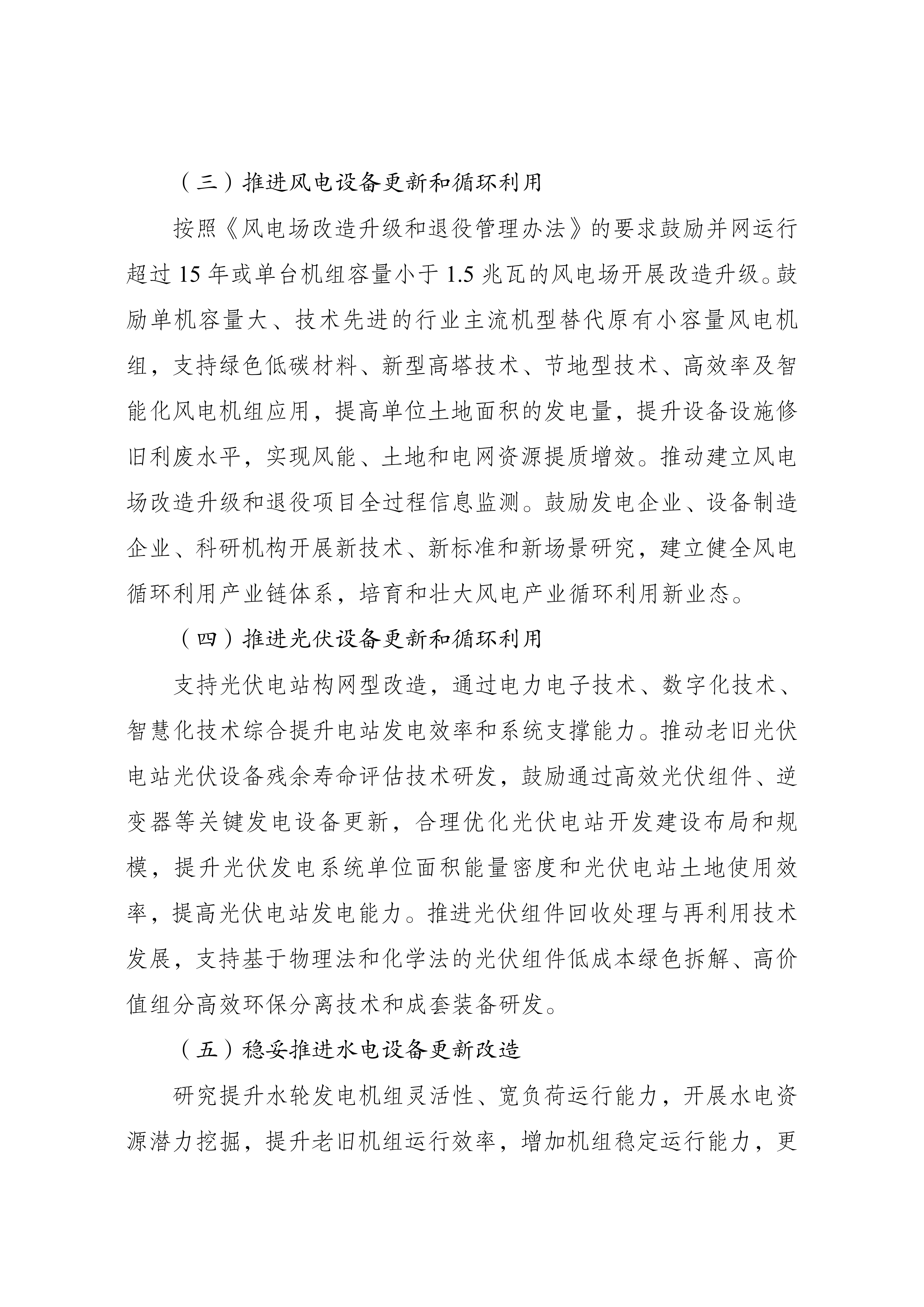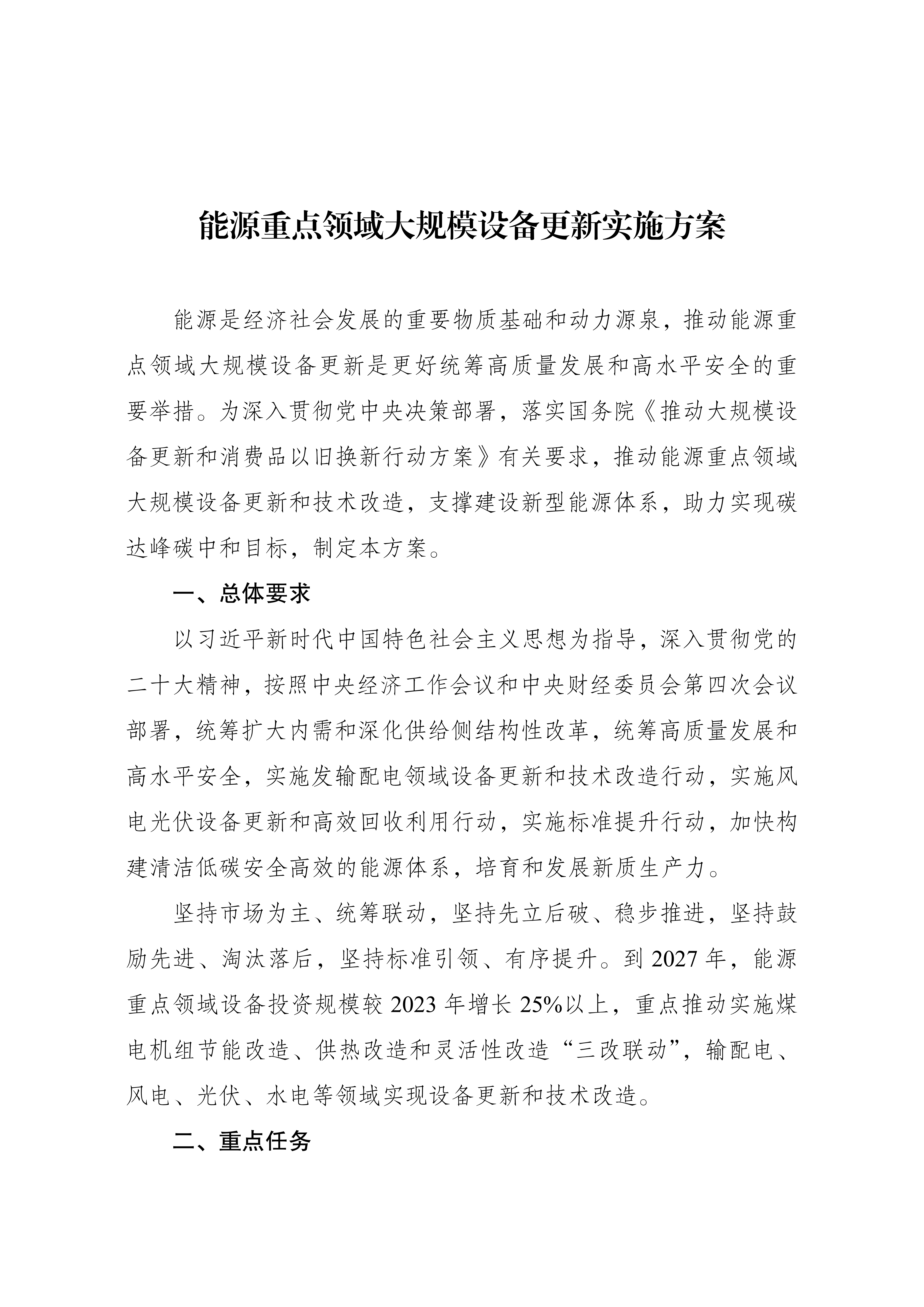 8月21日,國家發(fā)展改革委辦公廳、國家能源局綜合司印發(fā)《能源重點領域大規(guī)模設備更新實施方案》,方案提出,堅持市場為主、統(tǒng)籌聯(lián)動,堅持先立后破、穩(wěn)步推進,堅持鼓勵先進、淘汰落后,堅持標準引領、有序提升。到2027年,能源重點領域設備投資規(guī)模較2023年增長25%以上,重點推動實施煤電機組節(jié)能改造、供熱改造和靈活性改造“三改聯(lián)動”,輸配電、風電、光伏、水電等領域?qū)崿F(xiàn)設備更新和技術改造。 推進光伏設備更新和循環(huán)利用。支持光伏電站構網(wǎng)型改造,通過電力電子技術、數(shù)字化技術、智慧化技術綜合提升電站發(fā)電效率和系統(tǒng)支撐能力。推動老舊光伏電站光伏設備殘余壽命評估技術研發(fā),鼓勵通過高效光伏組件、逆變器等關鍵發(fā)電設備更新,合理優(yōu)化光伏電站開發(fā)建設布局和規(guī)模,提升光伏發(fā)電系統(tǒng)單位面積能量密度和光伏電站土地使用效率,提高光伏電站發(fā)電能力。推進光伏組件回收處理與再利用技術發(fā)展,支持基于物理法和化學法的光伏組件低成本綠色拆解、高價值組分高效環(huán)保分離技術和成套裝備研發(fā)。 推進風電設備更新和循環(huán)利用。按照《風電場改造升級和退役管理辦法》的要求鼓勵并網(wǎng)運行超過15年或單臺機組容量小于1.5兆瓦的風電場開展改造升級。鼓勵單機容量大、技術先進的行業(yè)主流機型替代原有小容量風電機組,支持綠色低碳材料、新型高塔技術、節(jié)地型技術、高效率及智能化風電機組應用,提高單位土地面積的發(fā)電量,提升設備設施修舊利廢水平,實現(xiàn)風能、土地和電網(wǎng)資源提質(zhì)增效。推動建立風電場改造升級和退役項目全過程信息監(jiān)測。鼓勵發(fā)電企業(yè)、設備制造企業(yè)、科研機構開展新技術、新標準和新場景研究,建立健全風電循環(huán)利用產(chǎn)業(yè)鏈體系,培育和壯大風電產(chǎn)業(yè)循環(huán)利用新業(yè)態(tài)。 原文見下: