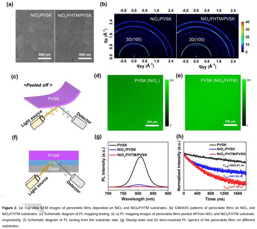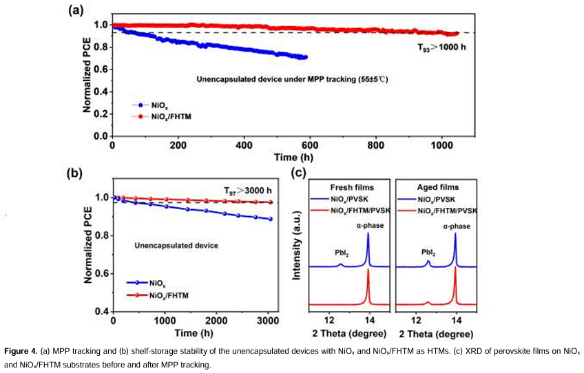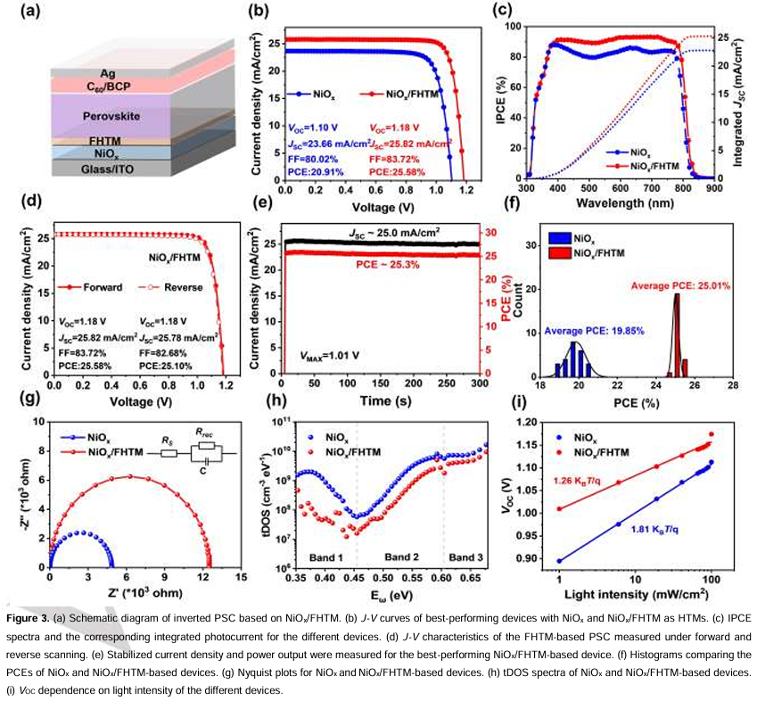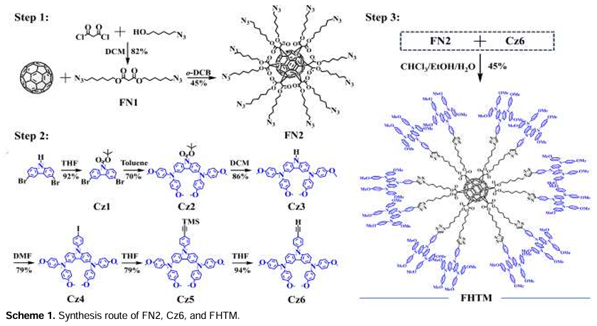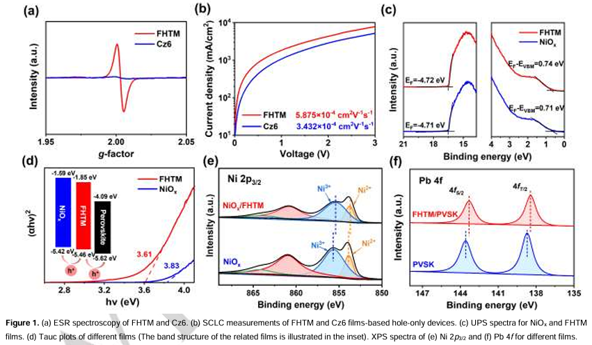設(shè)計(jì)一種有效的修飾分子來(lái)減輕NiOx/鈣鈦礦界面的非輻射復(fù)合并提高鈣鈦礦質(zhì)量是實(shí)現(xiàn)高性能反式鈣鈦礦太陽(yáng)能電池的一項(xiàng)具有挑戰(zhàn)性但至關(guān)重要的努力。鑒于此,2024年8月16日華僑大學(xué)田成波&魏展畫(huà)于Angew刊發(fā)基于富勒烯空穴傳輸分子的高效穩(wěn)定反式鈣鈦礦太陽(yáng)能電池的研究成果,通過(guò)將C60與12個(gè)咔唑基部分整合在一起,合成了一種新型富勒烯基空穴傳輸分子FHTM,并將其用作NiOx/鈣鈦礦界面的修飾分子。FHTM分子內(nèi)咔唑基部分和C60之間的電子轉(zhuǎn)移引發(fā)的原位自摻雜效應(yīng),以及咔唑基團(tuán)擴(kuò)展的π共軛部分,顯著提高了FHTM的空穴遷移率。再加上優(yōu)化的能級(jí)排列和增強(qiáng)的界面相互作用,F(xiàn)HTM顯著增強(qiáng)了相應(yīng)器件中的空穴提取和傳輸。此外,引入的FHTM可有效促進(jìn)鈣鈦礦的均勻成核,從而形成高質(zhì)量的鈣鈦礦薄膜。這些綜合改進(jìn)使基于FHTM的鈣鈦礦太陽(yáng)能電池實(shí)現(xiàn)了25.58%的冠軍效率(認(rèn)證:25.04%),顯著超過(guò)了對(duì)照器件(20.91%)。此外,在連續(xù)一個(gè)太陽(yáng)照射下進(jìn)行1000小時(shí)的最大功率點(diǎn)跟蹤后,未封裝的設(shè)備仍保持了其初始效率的93%。這項(xiàng)研究突出了功能化富勒烯作為空穴傳輸材料的潛力,為其在鈣鈦礦太陽(yáng)能電池領(lǐng)域的應(yīng)用開(kāi)辟了新途徑。