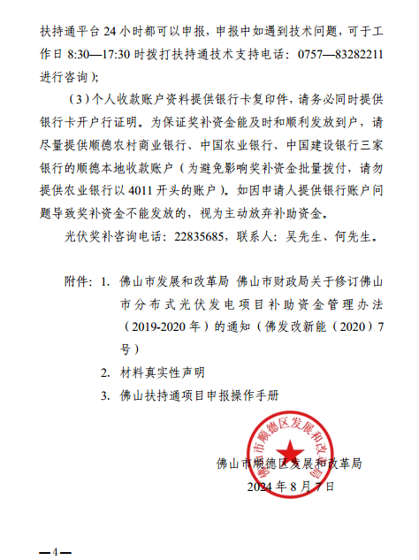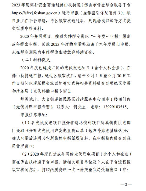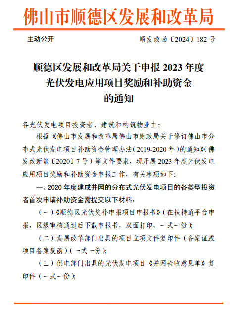 8月7日,順德區(qū)發(fā)展和改革局發(fā)布關(guān)于組織申報(bào)2023年度光伏發(fā)電應(yīng)用項(xiàng)目獎(jiǎng)勵(lì)和補(bǔ)助資金的通知,通知指出,順德區(qū)分布式光伏發(fā)電項(xiàng)目按實(shí)際發(fā)電量補(bǔ)助0.3元/千瓦時(shí)(其中市級(jí)補(bǔ)助 0.06元/千瓦時(shí)、區(qū)級(jí)補(bǔ)助0.24元/千瓦時(shí)),自項(xiàng)目建成的次月1日起計(jì)算補(bǔ)助金額,連續(xù)補(bǔ)助3年。