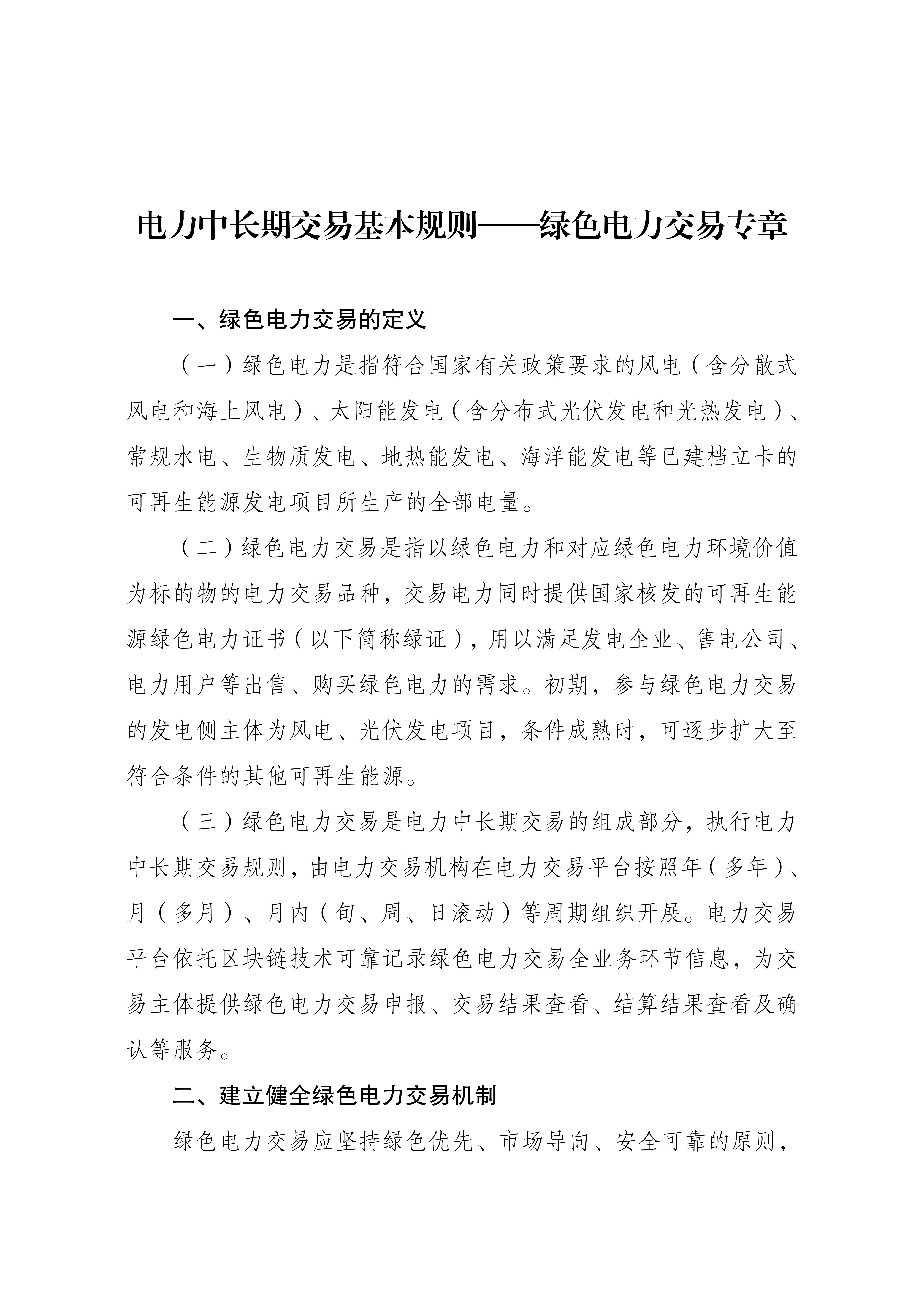 8月23日,國(guó)家發(fā)展改革委 國(guó)家能源局印發(fā)《電力中長(zhǎng)期交易基本規(guī)則—綠色電力交易專章》的通知。通知指出,電網(wǎng)企業(yè)切實(shí)履行電量計(jì)量、電費(fèi)結(jié)算責(zé)任,保障綠色電力交易合同執(zhí)行。電力交易機(jī)構(gòu)要不斷優(yōu)化提升綠電交易組織、交易結(jié)算、信息披露、平臺(tái)建設(shè)等全方位準(zhǔn)備工作,做好綠電交易及綠色電力消費(fèi)情況匯總分析,為發(fā)電企業(yè)、電力用戶和售電公司等提供綠色電力交易便捷服務(wù)。 原文如下: 國(guó)家發(fā)展改革委 國(guó)家能源局關(guān)于印發(fā)《電力中長(zhǎng) 期交易基本規(guī)則—綠色電力交易專章》的通知 發(fā)改能源〔2024〕1123號(hào) 各省、自治區(qū)、直轄市、新疆生產(chǎn)建設(shè)兵團(tuán)發(fā)展改革委、能源局,國(guó)家能源局各派出機(jī)構(gòu),國(guó)家電網(wǎng)有限公司、中國(guó)南方電網(wǎng)有限責(zé)任公司、中國(guó)華能集團(tuán)有限公司、中國(guó)大唐集團(tuán)有限公司、中國(guó)華電集團(tuán)有限公司、國(guó)家能源投資集團(tuán)有限責(zé)任公司、國(guó)家電力投資集團(tuán)公司、中國(guó)節(jié)能環(huán)保集團(tuán)有限公司、中國(guó)長(zhǎng)江三峽集團(tuán)有限公司、國(guó)家開發(fā)投資集團(tuán)有限公司、中國(guó)核工業(yè)集團(tuán)有限公司、中國(guó)廣核集團(tuán)有限公司、華潤(rùn)(集團(tuán))有限公司、內(nèi)蒙古電力(集團(tuán))有限責(zé)任公司、北京電力交易中心有限公司、廣州電力交易中心有限責(zé)任公司、內(nèi)蒙古電力交易中心有限公司: 為深入學(xué)習(xí)貫徹黨的二十大和中央經(jīng)濟(jì)工作會(huì)議精神,落實(shí)《國(guó)家發(fā)展改革委、國(guó)家能源局關(guān)于加快建設(shè)全國(guó)統(tǒng)一電力市場(chǎng)體系的指導(dǎo)意見》(發(fā)改體改〔2022〕118號(hào))等文件要求,加快建立有利于促進(jìn)綠色能源生產(chǎn)消費(fèi)的市場(chǎng)體系和長(zhǎng)效機(jī)制,推動(dòng)綠色電力交易融入電力中長(zhǎng)期交易,滿足電力用戶購買綠色電力需求,我們制定了《電力中長(zhǎng)期交易基本規(guī)則—綠色電力交易專章》,現(xiàn)印發(fā)給你們,并就有關(guān)事項(xiàng)通知如下。 一、國(guó)家發(fā)展改革委、國(guó)家能源局加強(qiáng)對(duì)各地綠色電力交易工作指導(dǎo)。國(guó)家能源局負(fù)責(zé)推動(dòng)綠證核發(fā)全覆蓋,拓展綠證應(yīng)用場(chǎng)景,國(guó)家能源局及派出機(jī)構(gòu)加強(qiáng)對(duì)綠色電力交易監(jiān)管。地方政府主管部門要積極推動(dòng)新能源參與電力市場(chǎng),指導(dǎo)經(jīng)營(yíng)主體積極參與綠色電力交易,按照“省內(nèi)為主、跨省區(qū)為輔”的原則,推動(dòng)綠色電力交易有序開展,滿足電力用戶綠色電力購買需求。 二、國(guó)家能源局電力業(yè)務(wù)資質(zhì)管理中心負(fù)責(zé)按有關(guān)要求完善綠證核發(fā)機(jī)制,配合做好綠色電力交易相關(guān)工作。國(guó)家可再生能源信息管理中心進(jìn)一步優(yōu)化工作流程,提升建檔立卡時(shí)效,支撐綠證核發(fā)全覆蓋工作。 三、電網(wǎng)企業(yè)切實(shí)履行電量計(jì)量、電費(fèi)結(jié)算責(zé)任,保障綠色電力交易合同執(zhí)行。電力交易機(jī)構(gòu)要不斷優(yōu)化提升綠電交易組織、交易結(jié)算、信息披露、平臺(tái)建設(shè)等全方位準(zhǔn)備工作,做好綠電交易及綠色電力消費(fèi)情況匯總分析,為發(fā)電企業(yè)、電力用戶和售電公司等提供綠色電力交易便捷服務(wù)。 四、加強(qiáng)宣傳推廣。地方政府主管部門通過組織政策宣貫、媒體宣傳、洽談會(huì)商等方式增進(jìn)各類經(jīng)營(yíng)主體對(duì)綠色電力交易的認(rèn)識(shí),逐步形成主動(dòng)消費(fèi)綠色電力的良好氛圍。 通知未盡事項(xiàng),遵照電力中長(zhǎng)期交易、現(xiàn)貨交易基本規(guī)則執(zhí)行。與港澳地區(qū)等跨境綠電交易參照本通知明確的原則執(zhí)行。 國(guó)家發(fā)展改革委 國(guó) 家 能 源 局 2024年7月24日