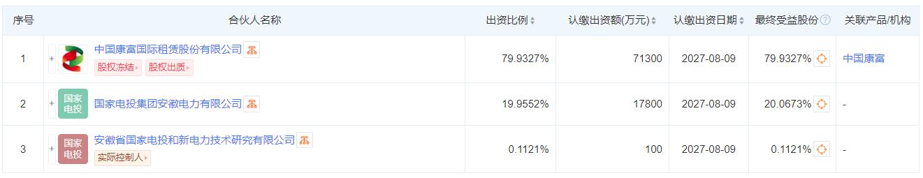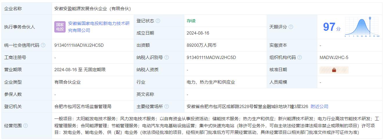 8月16日,安徽安盈能源發(fā)展合伙企業(yè)(有限合伙)正式注冊(cè)成立,執(zhí)行事務(wù)合伙人為安徽省國家電投和新電力技術(shù)研究有限公司,出資額8.92億人民幣,經(jīng)營范圍含太陽能發(fā)電技術(shù)服務(wù)、風(fēng)力發(fā)電技術(shù)服務(wù)、以自有資金從事投資活動(dòng)、儲(chǔ)能技術(shù)服務(wù)、熱力生產(chǎn)和供應(yīng)、新興能源技術(shù)研發(fā)等。 合伙人信息顯示,該合伙企業(yè)由中國康富、國家電投集團(tuán)安徽電力有限公司以及安徽省國家電投和新電力技術(shù)研究有限公司共同出資成立,三家企業(yè)均由國家電投集團(tuán)控股或全資持股。