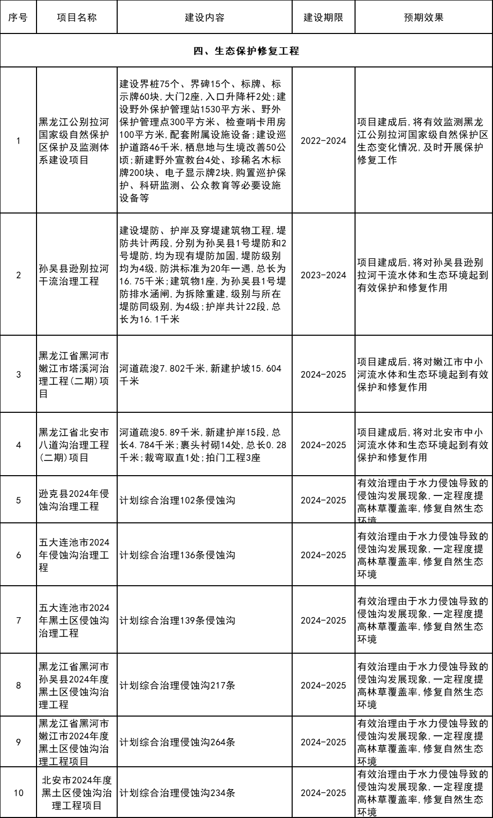 7.筑牢生態(tài)安全屏障。生態(tài)環(huán)境質量明顯改善。統(tǒng)籌推進藍天、碧水、凈土、美麗鄉(xiāng)村、原生態(tài)五大保衛(wèi)戰(zhàn)和13場標志性戰(zhàn)役,污染防治攻堅戰(zhàn)136項具體任務全部完成。生態(tài)保護與修復扎實推進。開展“綠盾”自然保護區(qū)監(jiān)督檢查專項行動,加大自然保護區(qū)內環(huán)境問題整改力度。劃定并嚴守生態(tài)保護紅線。創(chuàng)新生態(tài)修復治理模式。黑河市歷史遺留礦山面積8340.87公頃。2022—2023年,通過自然恢復、轉型利用和工程恢復,共完成歷史遺留礦山生態(tài)修復面積2459.70公頃。