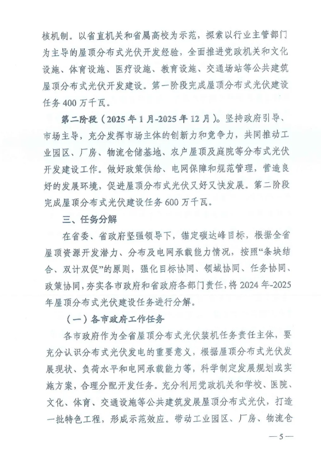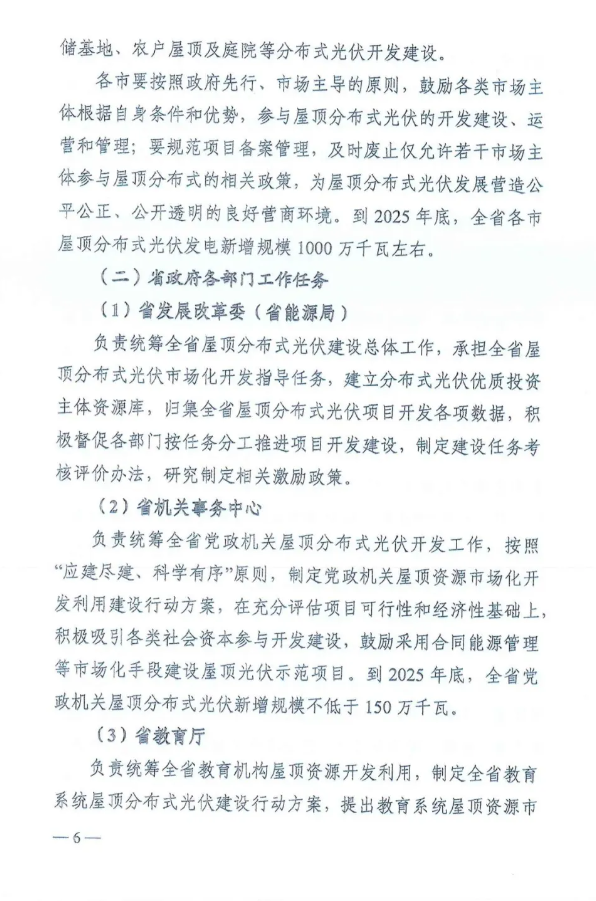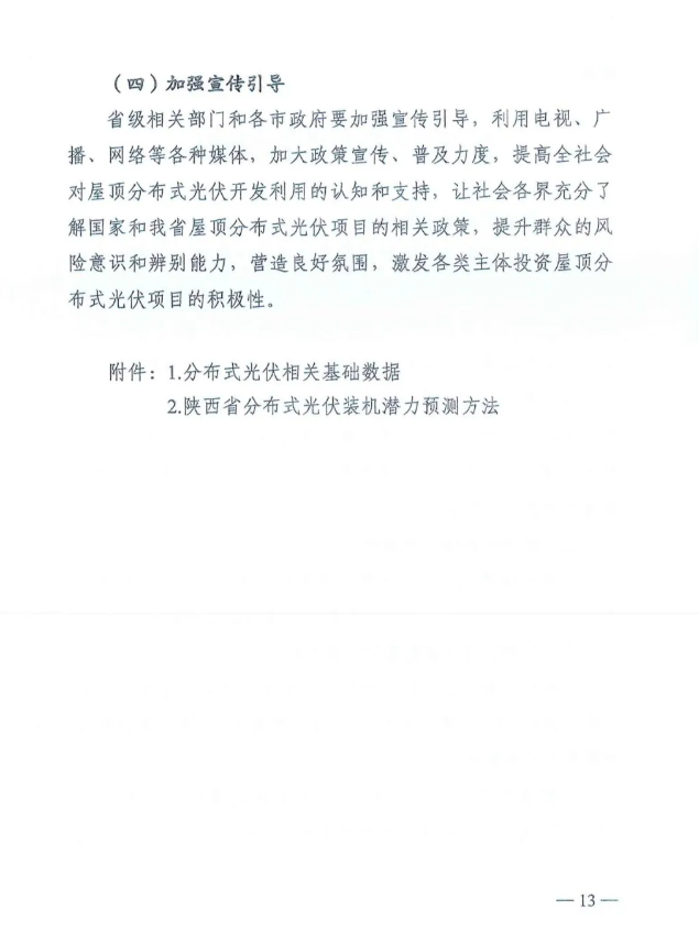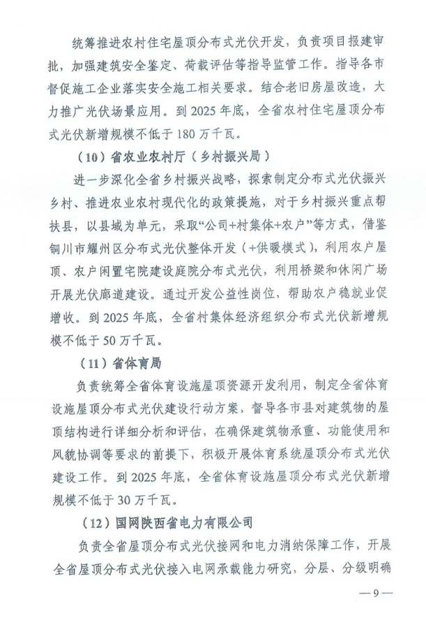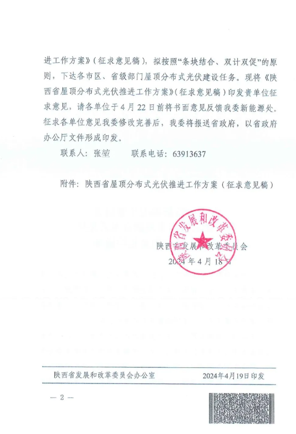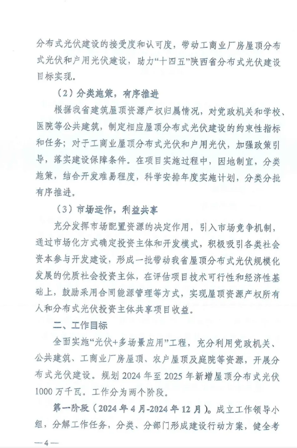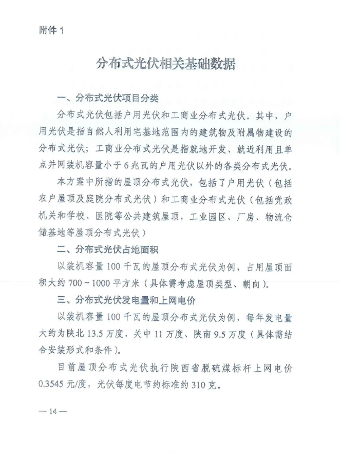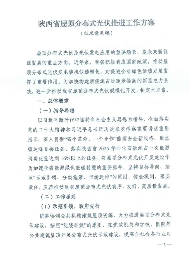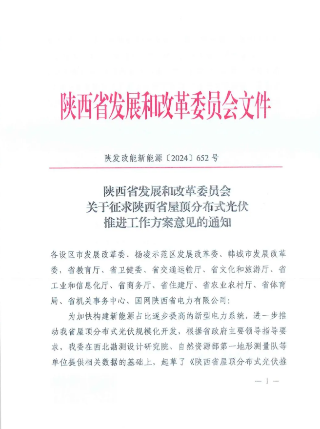 日前,陜西發(fā)改委印發(fā)《關(guān)于征求陜西省屋頂分布式推進工作方案意見的通知》(征求意見稿)。文件指出,全面實施“光伏+多場景應(yīng)用”工程,充分利用黨政機關(guān)、公共建筑、工商業(yè)廠房屋頂、農(nóng)戶屋頂及庭院等資源,開展分布式光伏建設(shè)。規(guī)劃2024年至2025年新增屋頂分布式光伏1000萬千瓦。