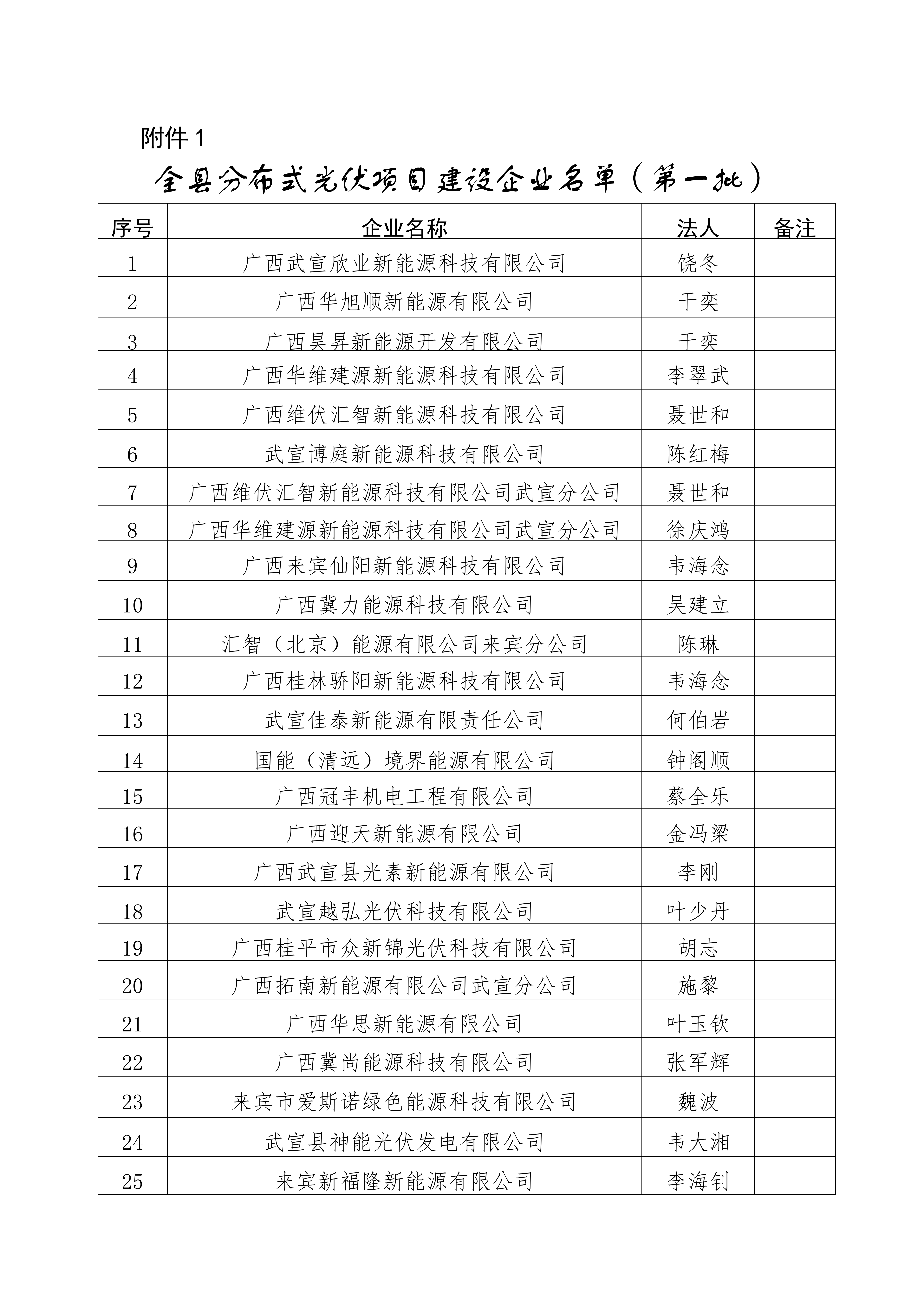 8月30日,廣西來(lái)賓市省武宣縣整縣分布式光伏項(xiàng)目領(lǐng)導(dǎo)小組辦公室發(fā)布關(guān)于公布全縣分布式光伏項(xiàng)目建設(shè)企業(yè)名單的通知。 根據(jù)通知文件,本次入選全縣分布式光伏項(xiàng)目建設(shè)企業(yè)名單共有29家企業(yè)。文件明確,分布式光伏建設(shè)企業(yè)名單實(shí)行動(dòng)態(tài)更新,原則是一個(gè)月(月底)更新一次名單。后續(xù)有企業(yè)申請(qǐng),按照《武宣縣整縣分布式光伏項(xiàng)目領(lǐng)導(dǎo)小組辦公室關(guān)于暫停全縣分布式光伏項(xiàng)目建設(shè)的通知》文件要求,報(bào)送相關(guān)材料到縣發(fā)改局進(jìn)行報(bào)備。 文件詳情如下: 武宣縣整縣分布式光伏項(xiàng)目領(lǐng)導(dǎo)小組辦公室關(guān)于公布全縣分布式光伏項(xiàng)目建設(shè)企業(yè)名單的通知 各鄉(xiāng)(鎮(zhèn))人民政府,來(lái)賓武宣供電局,各光伏企業(yè): 根據(jù)《武宣縣整縣分布式光伏項(xiàng)目領(lǐng)導(dǎo)小組辦公室關(guān)于暫停全縣分布式光伏項(xiàng)目建設(shè)的通知》文件要求,對(duì)申請(qǐng)企業(yè)的材料進(jìn)行收集審核,現(xiàn)將審核通過(guò)的企業(yè)名單發(fā)給你們。請(qǐng)各鄉(xiāng)鎮(zhèn)政府、來(lái)賓武宣供電局根據(jù)全縣分布式光伏建設(shè)企業(yè)名單(第一批)(附件1),受理分布式光伏項(xiàng)目安裝申請(qǐng)、報(bào)裝和并網(wǎng)接入等手續(xù)。各光伏企業(yè)嚴(yán)格按照申報(bào)流程申報(bào)建設(shè)。請(qǐng)各鄉(xiāng)鎮(zhèn)政府、來(lái)賓武宣供電局、企業(yè)注意保留存檔《武宣縣戶(hù)用屋頂光伏發(fā)電項(xiàng)目安裝申請(qǐng)表》(附件2)。 分布式光伏建設(shè)企業(yè)名單實(shí)行動(dòng)態(tài)更新,原則是一個(gè)月(月底)更新一次名單。后續(xù)有企業(yè)申請(qǐng),按照《武宣縣整縣分布式光伏項(xiàng)目領(lǐng)導(dǎo)小組辦公室關(guān)于暫停全縣分布式光伏項(xiàng)目建設(shè)的通知》文件要求,報(bào)送相關(guān)材料到縣發(fā)改局進(jìn)行報(bào)備。 附件:1.全縣分布式光伏項(xiàng)目建設(shè)企業(yè)名單(第一批) 2.武宣縣戶(hù)用屋頂光伏發(fā)電項(xiàng)目安裝申請(qǐng)表 武宣縣整縣分布式光伏項(xiàng)目領(lǐng)導(dǎo)小組辦公室(代) 2024年8月30日