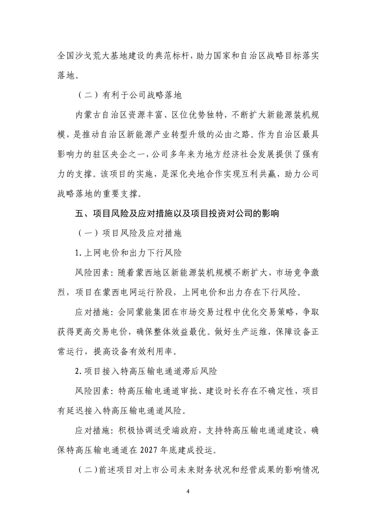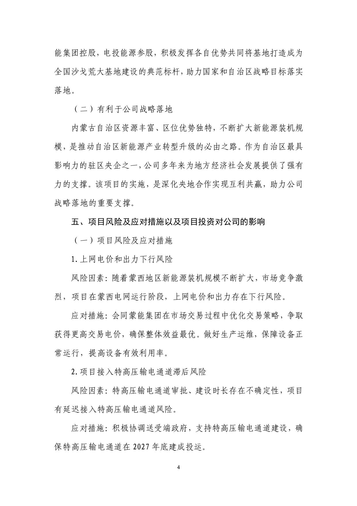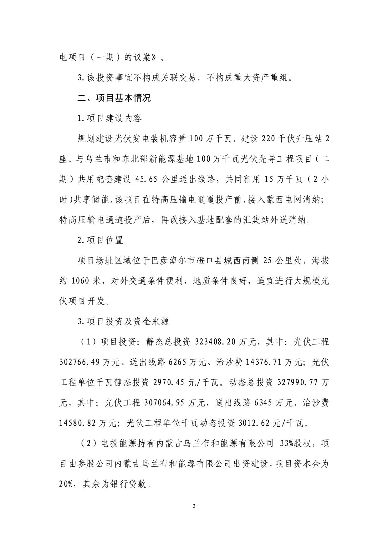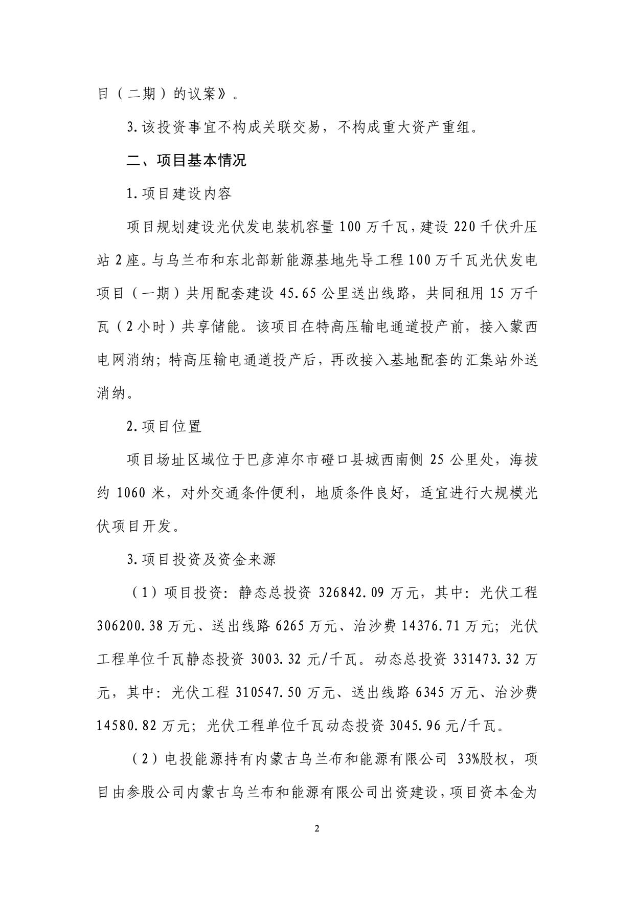 9月4日,內(nèi)蒙古電投能源股份有限公司發(fā)布關(guān)于參股投資建設(shè)烏蘭布和東北部新能源基地先導(dǎo)工程100萬(wàn)千瓦光伏發(fā)電項(xiàng)目(一期)以及(二期)公告。 公告稱(chēng),規(guī)劃建設(shè)以沙漠、戈壁、荒漠地區(qū)為重點(diǎn)的大型風(fēng)電光伏基地,是助力“碳達(dá)峰、碳中和”目標(biāo)實(shí)現(xiàn)的重要舉措。為加快構(gòu)建以新能源為主體的新型電力系統(tǒng),在統(tǒng)籌規(guī)劃、整體布局的前提下,擬建設(shè)200 萬(wàn)千瓦光伏先導(dǎo)工程,分兩期實(shí)施,每期 100 萬(wàn)千瓦,特高壓輸電通道投產(chǎn)前,接入蒙西電網(wǎng)消納;特高壓輸電通道投產(chǎn)后,再改接入基地配套的匯集站外送消納。烏蘭布和沙漠東北部新能源基地先導(dǎo)工程由電投能源與內(nèi)蒙古能源集團(tuán)有限公司開(kāi)發(fā)建設(shè),是助力國(guó)家和自治區(qū)戰(zhàn)略目標(biāo)落實(shí)落地的重要舉措。 規(guī)劃建設(shè)內(nèi)容包括:光伏發(fā)電裝機(jī)容量 100 萬(wàn)千瓦,建設(shè) 220 千伏升壓站 2座。與烏蘭布和東北部新能源基地 100 萬(wàn)千瓦光伏先導(dǎo)工程項(xiàng)目(二期)共用配套建設(shè) 45.65 公里送出線(xiàn)路,共同租用 15 萬(wàn)千瓦(2 小時(shí))共享儲(chǔ)能。該項(xiàng)目在特高壓輸電通道投產(chǎn)前,接入蒙西電網(wǎng)消納;特高壓輸電通道投產(chǎn)后,再改接入基地配套的匯集站外送消納。 在項(xiàng)目經(jīng)濟(jì)性上,一期項(xiàng)目全投資財(cái)務(wù)內(nèi)部收益率 5.72%(所得稅后)、資本金財(cái)務(wù)內(nèi)部收益率為 8.68%,投資回收期為 12.94 年(所得稅后)。 二期項(xiàng)目全投資財(cái)務(wù)內(nèi)部收益率 5.62%(所得稅后)、資本金財(cái)務(wù)內(nèi)部收益率為 8.43%,投資回收期為 13.06 年(所得稅后)。 資料顯示,國(guó)家電投集團(tuán)內(nèi)蒙古能源有限公司是國(guó)家電力投資集團(tuán)公司在內(nèi)蒙古的全資子公司,與國(guó)家電投集團(tuán)蒙東能源有限責(zé)任公司、內(nèi)蒙古電投能源股份有限公司(股票代碼002128)一體化運(yùn)作。公司是集煤炭、火電、新能源、電解鋁、鐵路、港口等產(chǎn)業(yè)一體化協(xié)同發(fā)展的大型綜合能源企業(yè)。現(xiàn)有煤炭產(chǎn)能8300萬(wàn)噸/年;火電裝機(jī)882萬(wàn)千瓦,在建70萬(wàn)千瓦;新能源裝機(jī)711萬(wàn)千瓦;電解鋁產(chǎn)能161萬(wàn)噸/年;鐵路運(yùn)營(yíng)里程627公里,港口規(guī)模1800萬(wàn)噸/年。資產(chǎn)總額1350多億元,員工16000人,擁有43家所屬單位,分布在內(nèi)蒙古的通遼、赤峰、錫盟等12個(gè)盟市,以及湖南、湖北、河南、山西、遼寧、山東、陜西等省份。