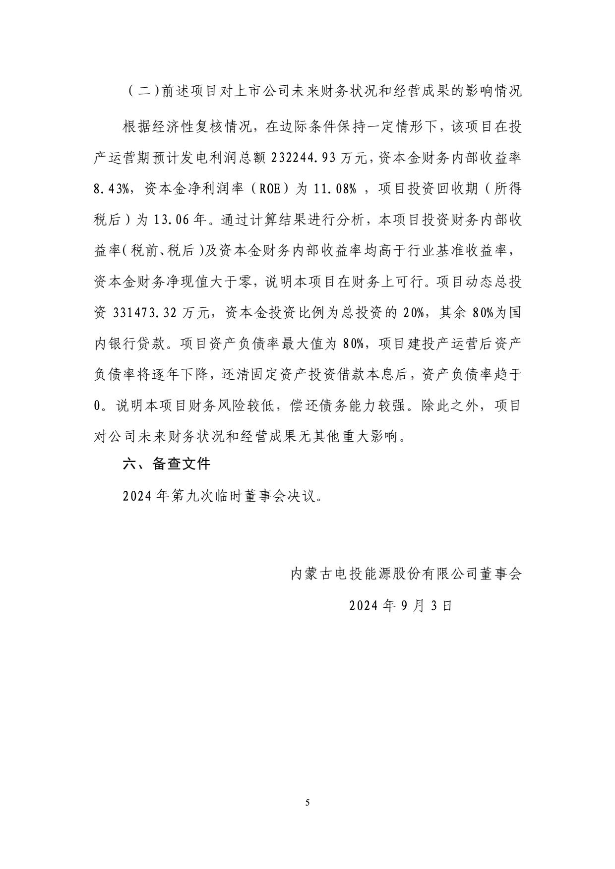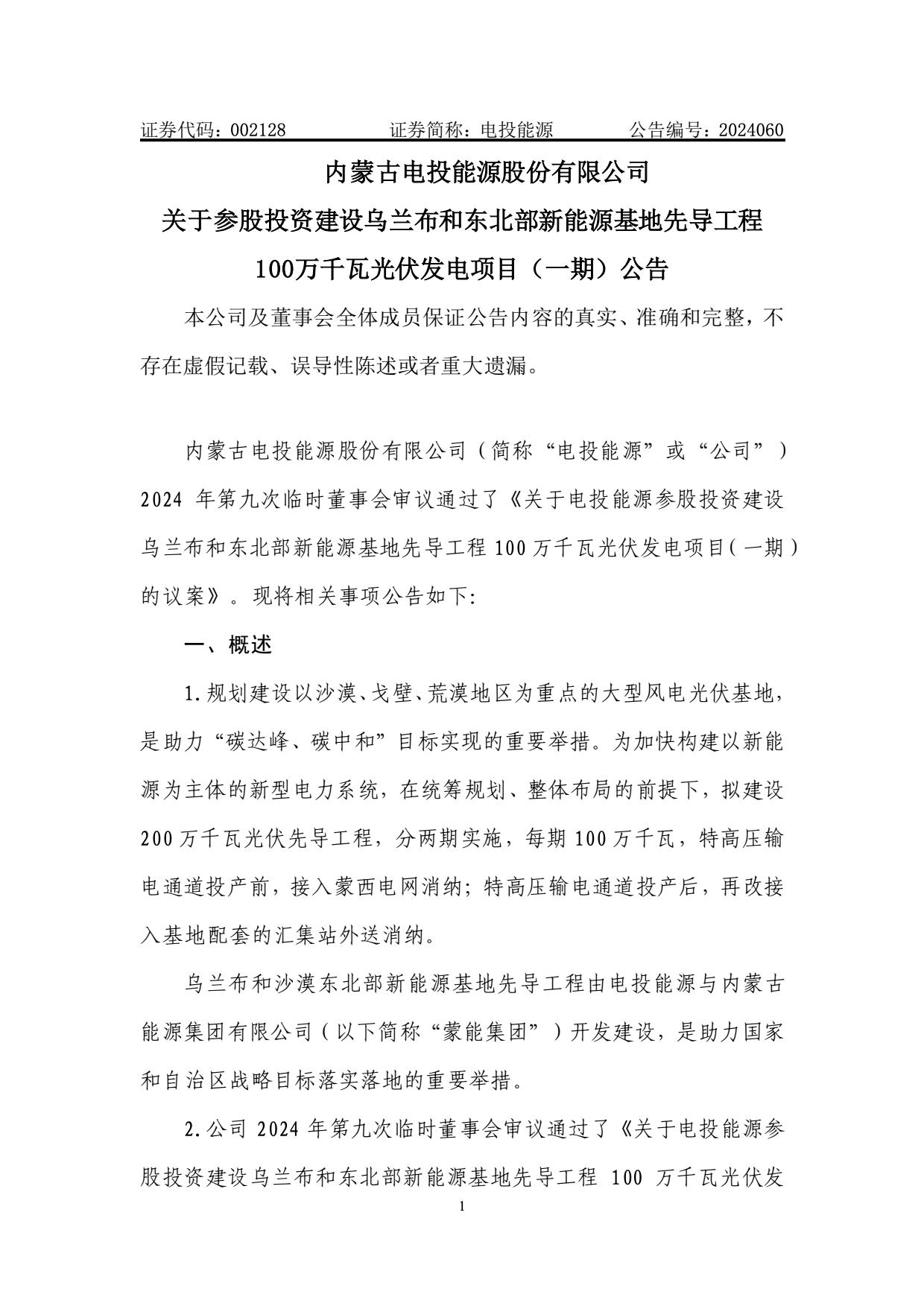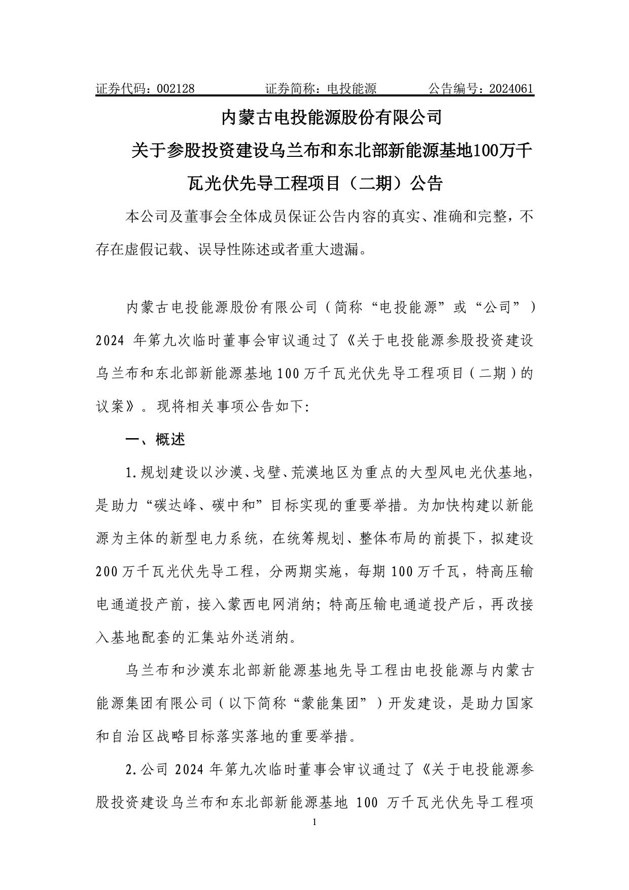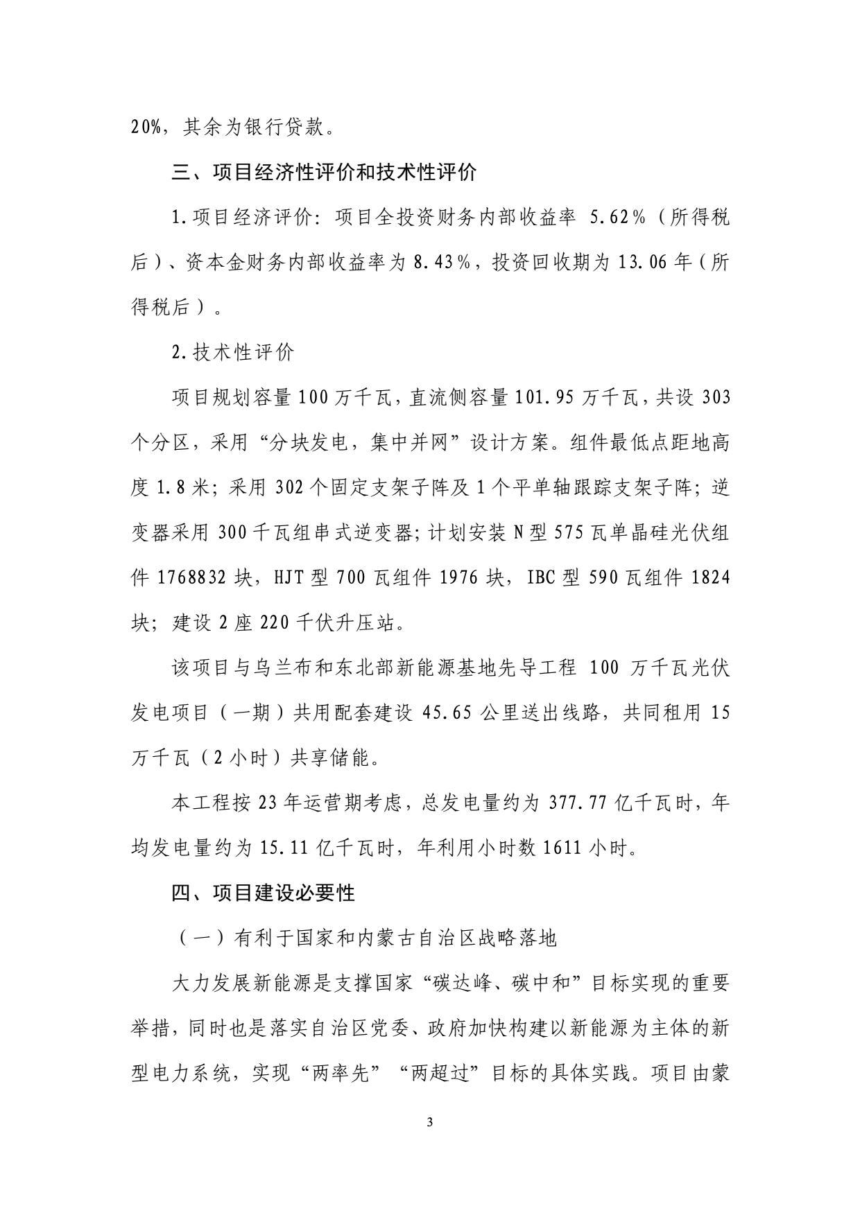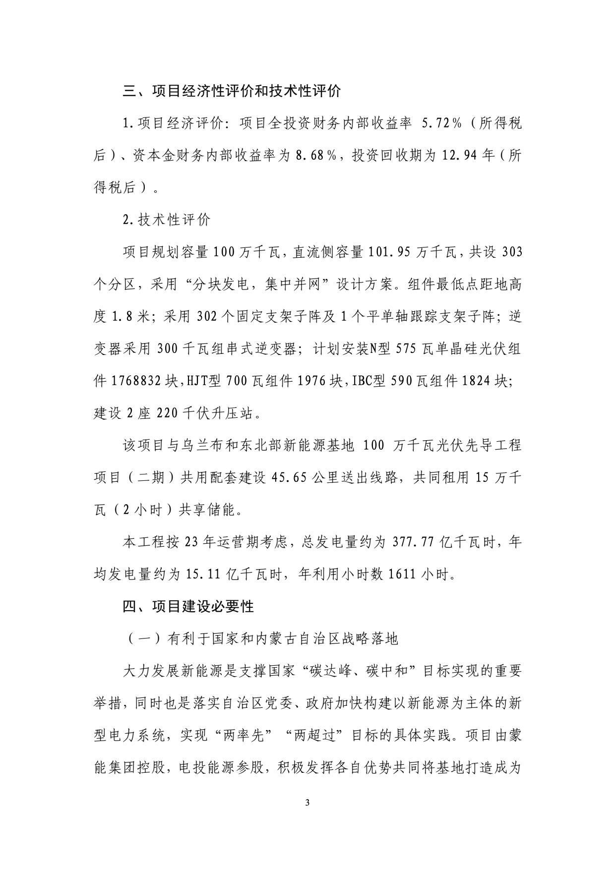 9月4日,內(nèi)蒙古電投能源股份有限公司發(fā)布關(guān)于參股投資建設(shè)烏蘭布和東北部新能源基地先導(dǎo)工程100萬(wàn)千瓦光伏發(fā)電項(xiàng)目(一期)以及(二期)公告。 公告稱(chēng),規(guī)劃建設(shè)以沙漠、戈壁、荒漠地區(qū)為重點(diǎn)的大型風(fēng)電光伏基地,是助力“碳達(dá)峰、碳中和”目標(biāo)實(shí)現(xiàn)的重要舉措。為加快構(gòu)建以新能源為主體的新型電力系統(tǒng),在統(tǒng)籌規(guī)劃、整體布局的前提下,擬建設(shè)200 萬(wàn)千瓦光伏先導(dǎo)工程,分兩期實(shí)施,每期 100 萬(wàn)千瓦,特高壓輸電通道投產(chǎn)前,接入蒙西電網(wǎng)消納;特高壓輸電通道投產(chǎn)后,再改接入基地配套的匯集站外送消納。烏蘭布和沙漠東北部新能源基地先導(dǎo)工程由電投能源與內(nèi)蒙古能源集團(tuán)有限公司開(kāi)發(fā)建設(shè),是助力國(guó)家和自治區(qū)戰(zhàn)略目標(biāo)落實(shí)落地的重要舉措。 規(guī)劃建設(shè)內(nèi)容包括:光伏發(fā)電裝機(jī)容量 100 萬(wàn)千瓦,建設(shè) 220 千伏升壓站 2座。與烏蘭布和東北部新能源基地 100 萬(wàn)千瓦光伏先導(dǎo)工程項(xiàng)目(二期)共用配套建設(shè) 45.65 公里送出線(xiàn)路,共同租用 15 萬(wàn)千瓦(2 小時(shí))共享儲(chǔ)能。該項(xiàng)目在特高壓輸電通道投產(chǎn)前,接入蒙西電網(wǎng)消納;特高壓輸電通道投產(chǎn)后,再改接入基地配套的匯集站外送消納。 在項(xiàng)目經(jīng)濟(jì)性上,一期項(xiàng)目全投資財(cái)務(wù)內(nèi)部收益率 5.72%(所得稅后)、資本金財(cái)務(wù)內(nèi)部收益率為 8.68%,投資回收期為 12.94 年(所得稅后)。 二期項(xiàng)目全投資財(cái)務(wù)內(nèi)部收益率 5.62%(所得稅后)、資本金財(cái)務(wù)內(nèi)部收益率為 8.43%,投資回收期為 13.06 年(所得稅后)。 資料顯示,國(guó)家電投集團(tuán)內(nèi)蒙古能源有限公司是國(guó)家電力投資集團(tuán)公司在內(nèi)蒙古的全資子公司,與國(guó)家電投集團(tuán)蒙東能源有限責(zé)任公司、內(nèi)蒙古電投能源股份有限公司(股票代碼002128)一體化運(yùn)作。公司是集煤炭、火電、新能源、電解鋁、鐵路、港口等產(chǎn)業(yè)一體化協(xié)同發(fā)展的大型綜合能源企業(yè)。現(xiàn)有煤炭產(chǎn)能8300萬(wàn)噸/年;火電裝機(jī)882萬(wàn)千瓦,在建70萬(wàn)千瓦;新能源裝機(jī)711萬(wàn)千瓦;電解鋁產(chǎn)能161萬(wàn)噸/年;鐵路運(yùn)營(yíng)里程627公里,港口規(guī)模1800萬(wàn)噸/年。資產(chǎn)總額1350多億元,員工16000人,擁有43家所屬單位,分布在內(nèi)蒙古的通遼、赤峰、錫盟等12個(gè)盟市,以及湖南、湖北、河南、山西、遼寧、山東、陜西等省份。