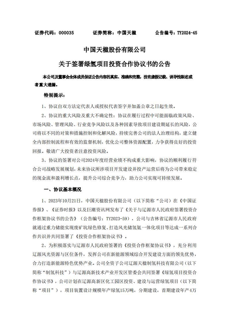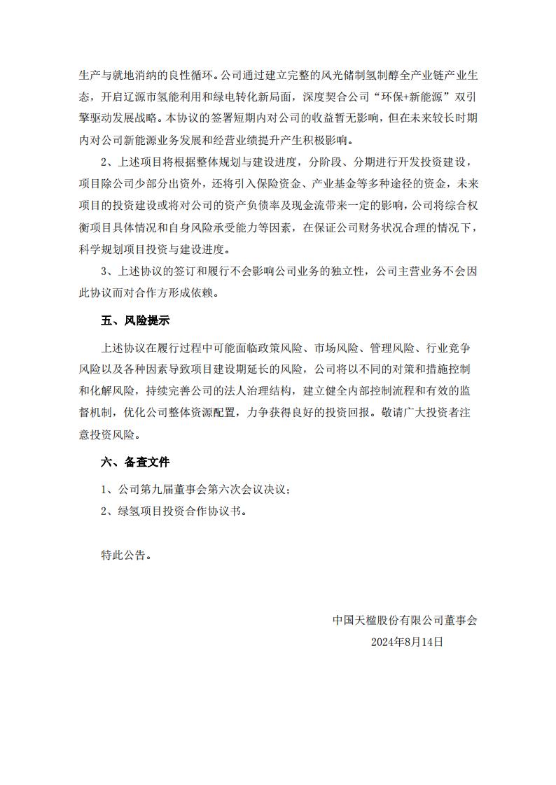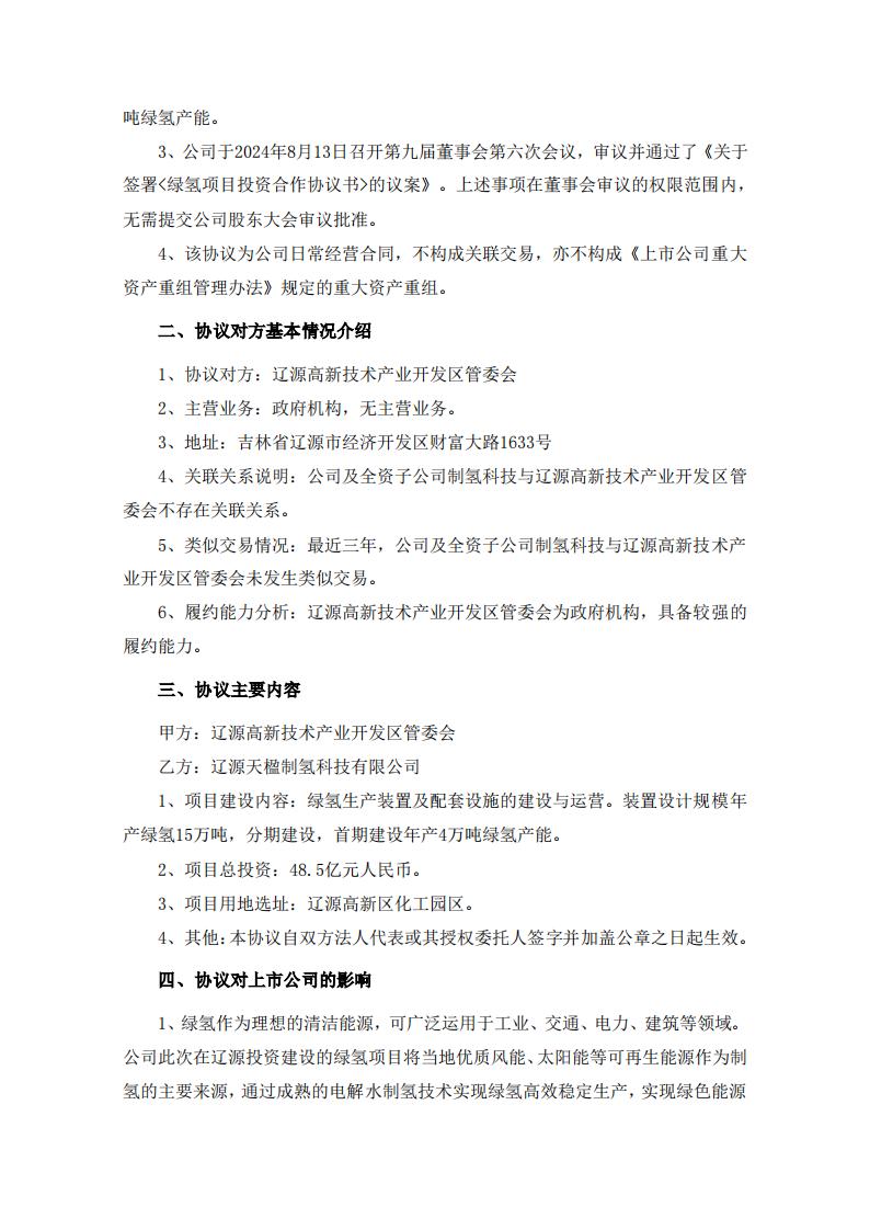 近日,中國天楹發(fā)布公告稱,為積極落實(shí)與遼源市人民政府簽署的《投資合作框架協(xié)議書》,充分利用遼源風(fēng)光資源與區(qū)位條件,發(fā)揮公司在新能源領(lǐng)域綜合開發(fā)建設(shè)方面的領(lǐng)先優(yōu)勢,合力打造新能源特色優(yōu)勢產(chǎn)業(yè)。公司全資子公司遼源天楹制氫科技有限公司與遼源高新技術(shù)產(chǎn)業(yè)開發(fā)區(qū)管委會(huì)共同簽署《綠氫項(xiàng)目投資合作協(xié)議書》,公司計(jì)劃在遼源高新區(qū)化工園區(qū)投資、建設(shè)與運(yùn)營綠氫項(xiàng)目,項(xiàng)目裝置設(shè)計(jì)規(guī)模年產(chǎn)綠氫15萬噸,分期建設(shè),首期建設(shè)年產(chǎn)4萬噸綠氫產(chǎn)能。 中國天楹表示,上述項(xiàng)目將根據(jù)整體規(guī)劃與建設(shè)進(jìn)度,分階段、分期進(jìn)行開發(fā)投資建設(shè),項(xiàng)目除公司少部分出資外,還將引入保險(xiǎn)資金、產(chǎn)業(yè)基金等多種途徑的資金,未來項(xiàng)目的投資建設(shè)或?qū)镜馁Y產(chǎn)負(fù)債率及現(xiàn)金流帶來一定的影響,公司將綜合權(quán)衡項(xiàng)目具體情況和自身風(fēng)險(xiǎn)承受能力等因素,在保證公司財(cái)務(wù)狀況合理的情況下,科學(xué)規(guī)劃項(xiàng)目投資與建設(shè)進(jìn)度。 原公告如下: