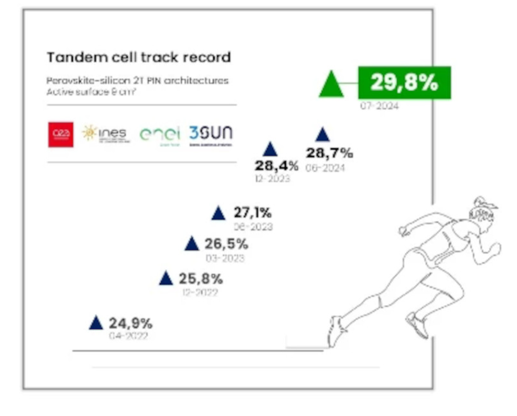 近日,法國(guó)國(guó)家太陽(yáng)能研究所 (INES)(法國(guó)替代能源和原子能委員會(huì) (CEA) 的一個(gè)部門)與 3SUN 宣布,其合作研發(fā)的 9 cm2 的鈣鈦礦/晶硅疊層光伏電池取得了29.8%的認(rèn)證效率記錄。 相關(guān)研究人員解釋說(shuō),國(guó)際上公布的大多數(shù)效率記錄都在 1 cm2 的面積上下。他們表示,面積是他們?cè)陂_(kāi)發(fā)中要解決的真正挑戰(zhàn)。這一結(jié)果標(biāo)志著 P-I-N 型 兩端疊層電池開(kāi)發(fā)迎來(lái)新的階段。 這項(xiàng)工作取得的進(jìn)展是顯而易見(jiàn)的:2023 年 3 月為 26.5%,2023 年 6 月為 27.1%,2023 年 12 月為 28.4%,去年 6 月為 28.7%,現(xiàn)在是 29.8%,Voc 大于 1.9V。 歐洲第一家超級(jí)工廠 3SUN(隸屬于 ENEL Green Power)將于今年在西西里島開(kāi)設(shè)其新的高效異質(zhì)結(jié)光伏板生產(chǎn)線。其產(chǎn)能將達(dá)到 3GW,包括電池和組件的生產(chǎn)。