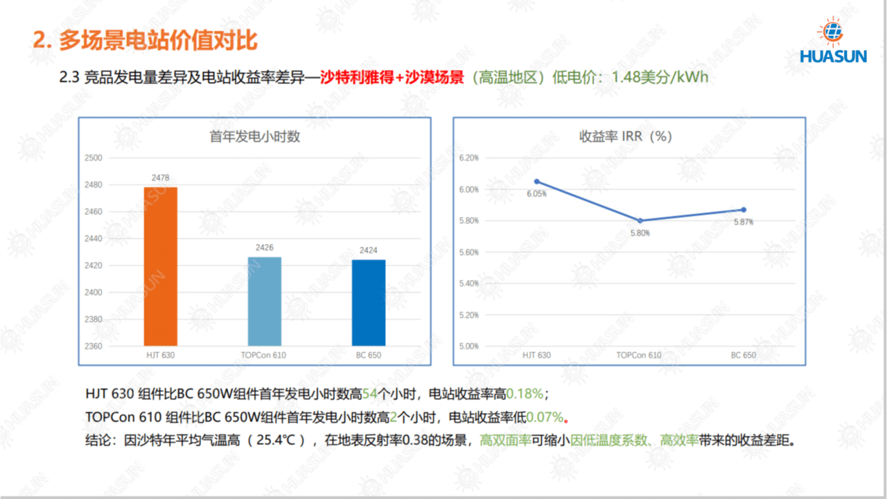 異質(zhì)結(jié)技術(shù)的優(yōu)勢不僅在研發(fā)階段,更體現(xiàn)于實(shí)際應(yīng)用中的性能表現(xiàn)。華晟產(chǎn)品開發(fā)管理中心負(fù)責(zé)人田介花在峰會(huì)上詳細(xì)剖析了N型組件在多場景電站中的價(jià)值。她基于弱光效率、入射角IAM、溫度系數(shù)等多個(gè)關(guān)鍵指標(biāo),將同尺寸的HJT 630W組件&TOPCon 610W組件與BC的650W組件進(jìn)行了對比。 基于光伏應(yīng)用場景的豐富性與多樣性,田介花在演講中引用了青海共和戈壁電站、廣東茂名草地電站、沙特利雅得沙漠電站三個(gè)不同應(yīng)用環(huán)境的典型案例,分析了低溫干旱、高溫高濕以及極端高溫條件下,三款主流N型組件在系統(tǒng)平衡(BOS)、發(fā)電量和收益率等方面的表現(xiàn)。