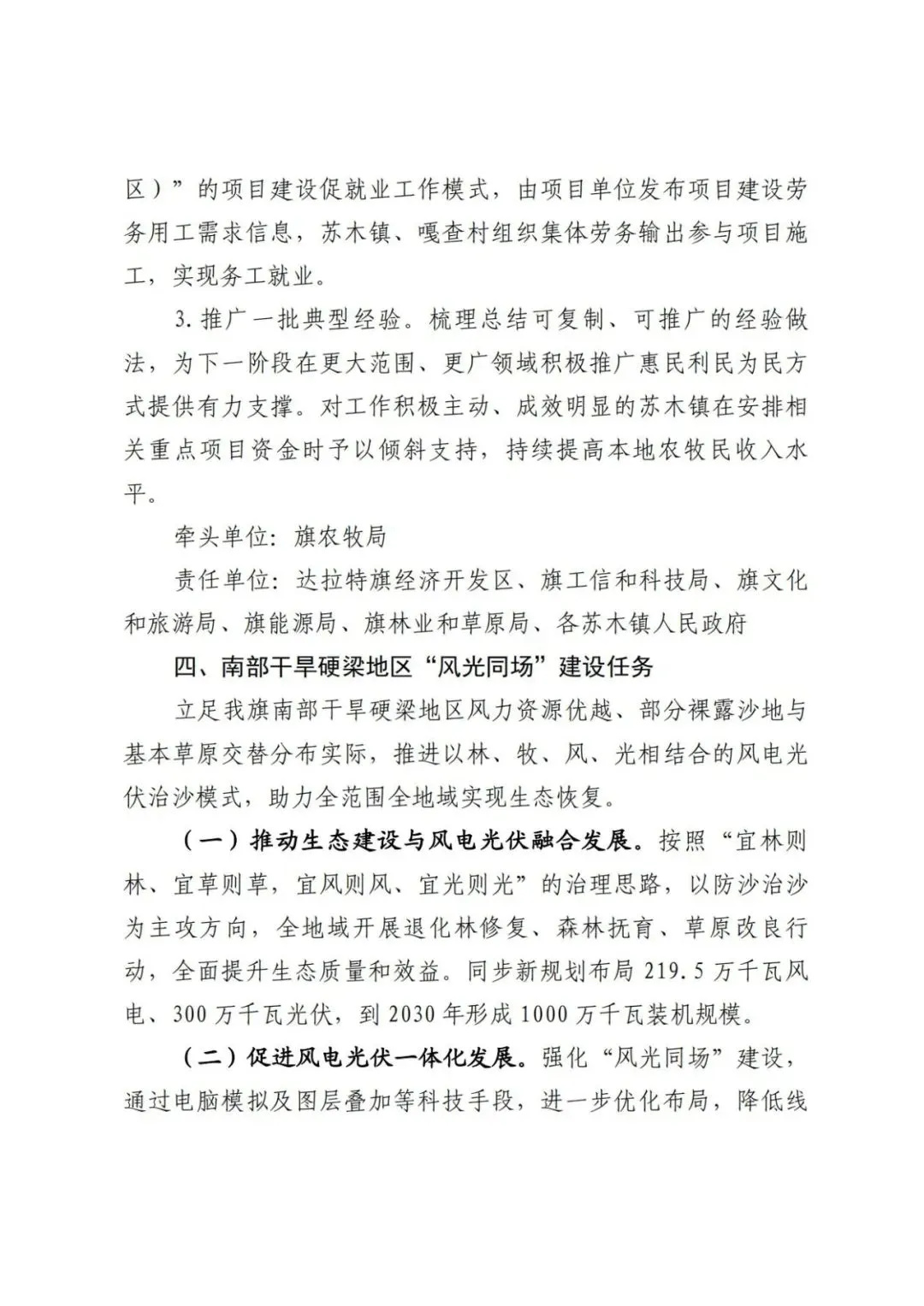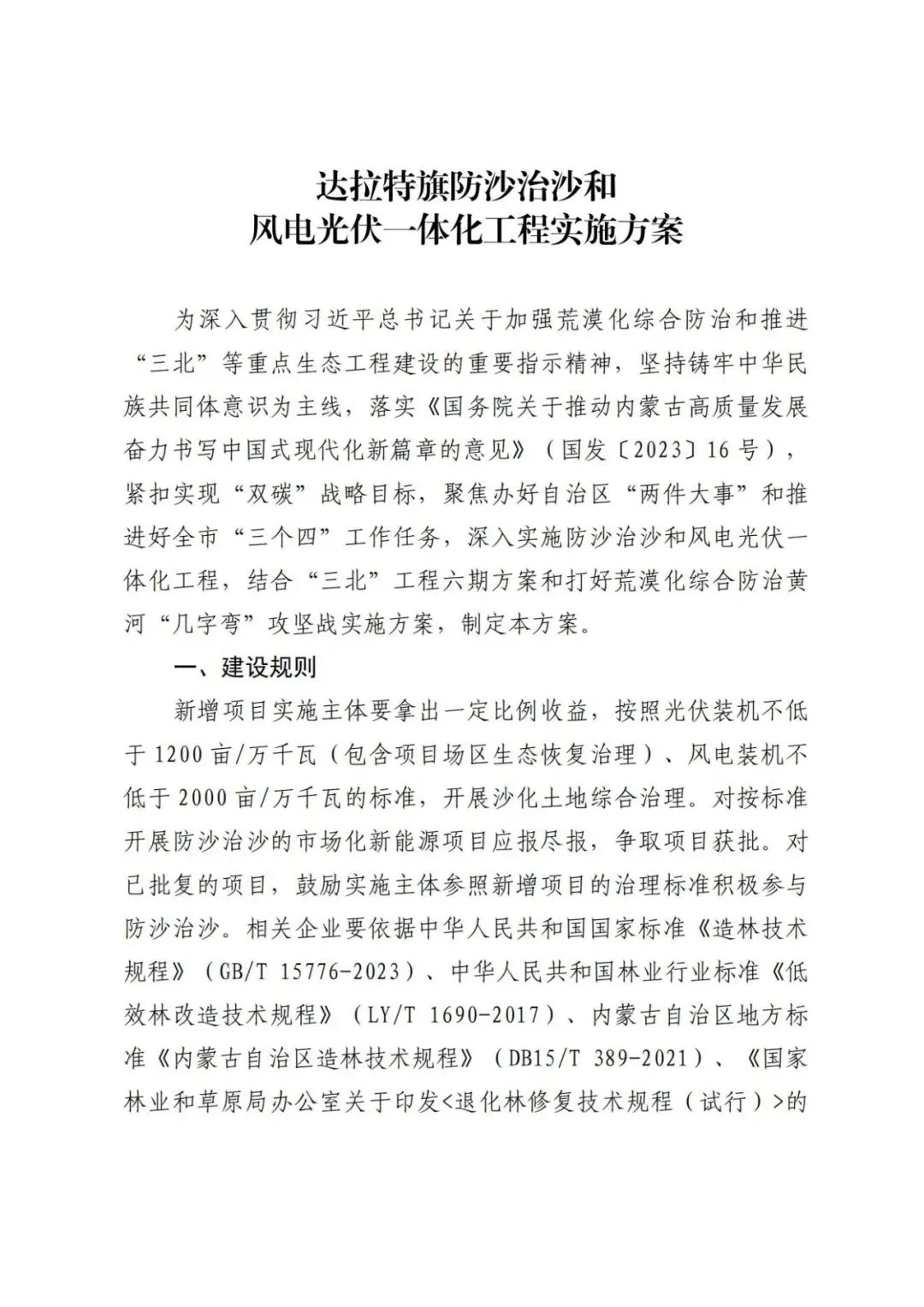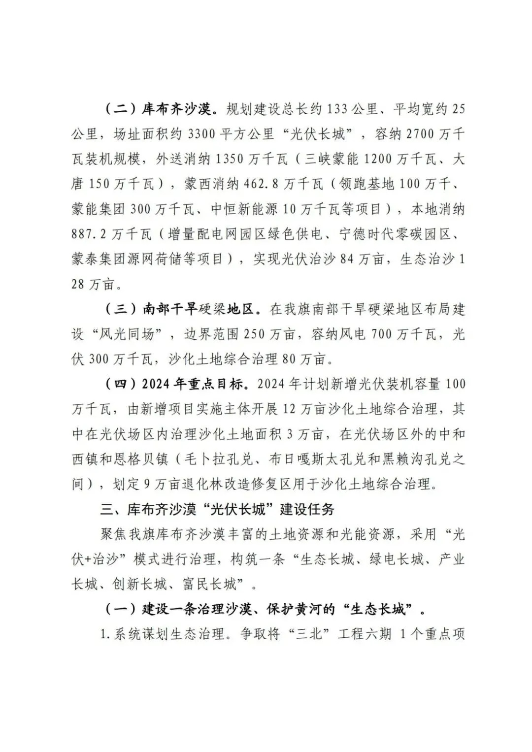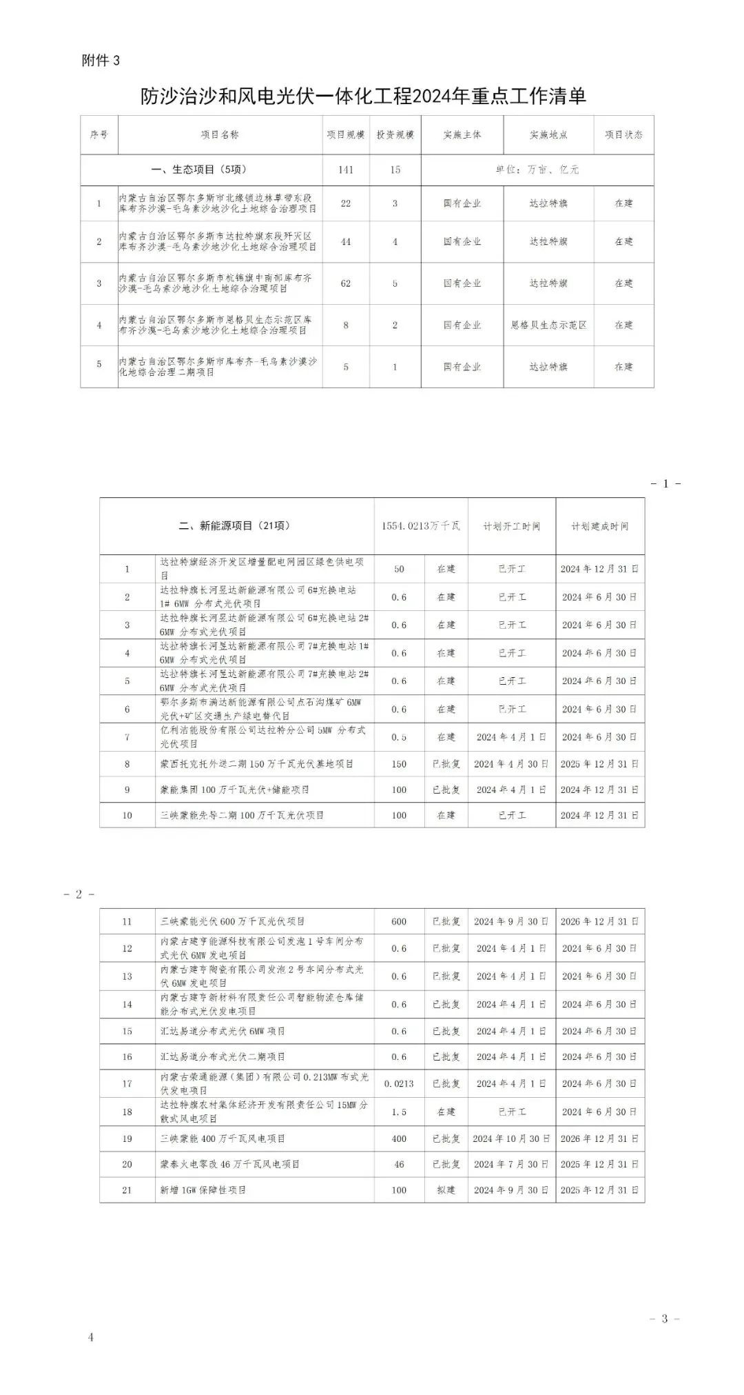 日前,內(nèi)蒙古達(dá)拉特旗人民政府印發(fā)《達(dá)拉特旗防沙治沙和風(fēng)電光伏一體化工程實(shí)施方案》。 文件明確,新增項(xiàng)目實(shí)施主體要拿出一定比例收益,按照光伏裝機(jī)不低于1200畝/萬千瓦(包含項(xiàng)目場區(qū)生態(tài)恢復(fù)治理)、風(fēng)電裝機(jī)不低于2000畝/萬千瓦的標(biāo)準(zhǔn),開展沙化土地綜合治理。對按標(biāo)準(zhǔn)開展防沙治沙的市場化新能源項(xiàng)目應(yīng)報(bào)盡報(bào),爭取項(xiàng)目獲批。對已批復(fù)的項(xiàng)目,鼓勵實(shí)施主體參照新增項(xiàng)目的治理標(biāo)準(zhǔn)積極參與防沙治沙。 文件提出: (一)總體目標(biāo)。以防沙治沙為根本目標(biāo),以風(fēng)電光伏開發(fā)建設(shè)為創(chuàng)新舉措,在達(dá)拉特旗庫布齊沙漠及周邊布局建設(shè)防沙治沙和風(fēng)電光伏一體化工程,實(shí)現(xiàn)292萬畝沙化土地全面治理,容納3700萬千瓦總裝機(jī)容量,促進(jìn)生態(tài)治理與能源開發(fā)融合發(fā)展,全面打贏黃河“幾字彎”攻堅(jiān)戰(zhàn)。 (二)庫布齊沙漠。規(guī)劃建設(shè)總長約133公里、平均寬約25公里,場址面積約3300平方公里“光伏長城”,容納2700萬千瓦裝機(jī)規(guī)模,外送消納1350萬千瓦(三峽蒙能1200萬千瓦、大唐150萬千瓦),蒙西消納462.8萬千瓦(領(lǐng)跑基地100萬千、蒙能集團(tuán)300萬千瓦、中恒新能源10萬千瓦等項(xiàng)目),本地消納887.2萬千瓦(增量配電網(wǎng)園區(qū)綠色供電、寧德時代零碳園區(qū)、蒙泰集團(tuán)源網(wǎng)荷儲等項(xiàng)目),實(shí)現(xiàn)光伏治沙84萬畝,生態(tài)治沙128萬畝。 (三)南部干旱硬梁地區(qū)。在達(dá)拉特旗南部干旱硬梁地區(qū)布局建設(shè)“風(fēng)光同場”,邊界范圍250萬畝,容納風(fēng)電700萬千瓦,光伏300萬千瓦,沙化土地綜合治理80萬畝。 (四)2024年重點(diǎn)目標(biāo)。2024年計(jì)劃新增光伏裝機(jī)容量100萬千瓦,由新增項(xiàng)目實(shí)施主體開展12萬畝沙化土地綜合治理,其中在光伏場區(qū)內(nèi)治理沙化土地面積3萬畝,在光伏場區(qū)外的中和西鎮(zhèn)和恩格貝鎮(zhèn)(毛卜拉孔兌、布日嘎斯太孔兌和黑賴溝孔兌之間),劃定9萬畝退化林改造修復(fù)區(qū)用于沙化土地綜合治理。 此外,《防沙治沙和風(fēng)電光伏一體化工程重點(diǎn)任務(wù)和重點(diǎn)項(xiàng)目清單》顯示,共有新能源項(xiàng)目13個,項(xiàng)目規(guī)模共計(jì)37GW。 《防沙治沙和風(fēng)電光伏一體化工程2024年重點(diǎn)工作清單》顯示,2024年重點(diǎn)建設(shè)新能源項(xiàng)目21個,項(xiàng)目規(guī)模合計(jì)15.54GW。 文件原文如下:
