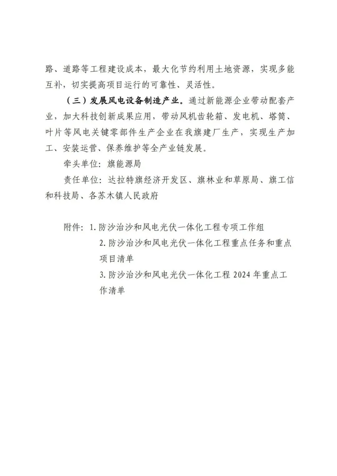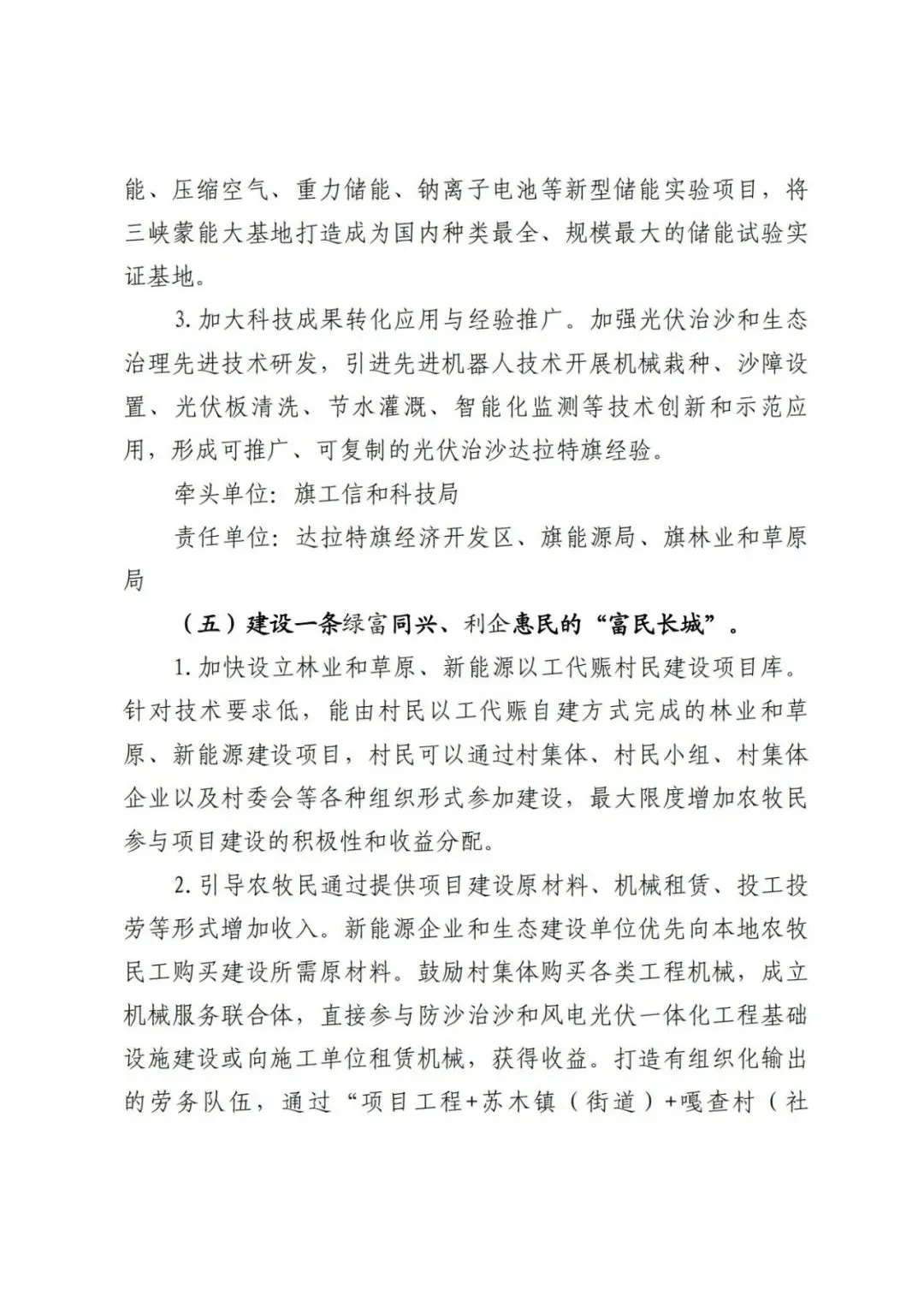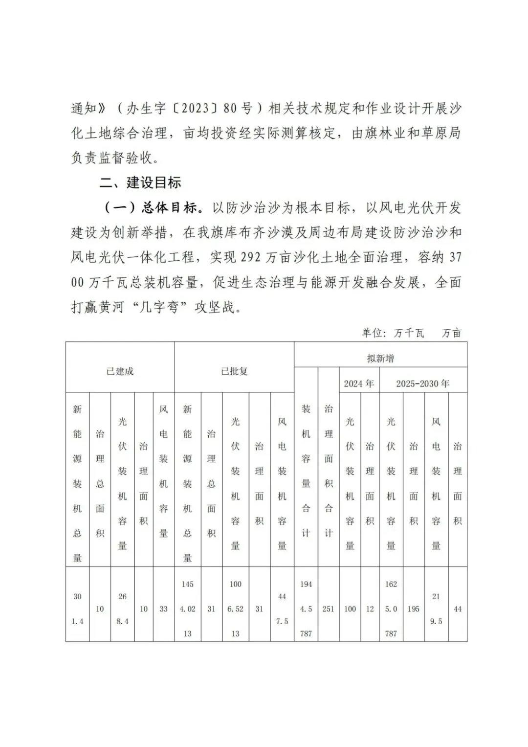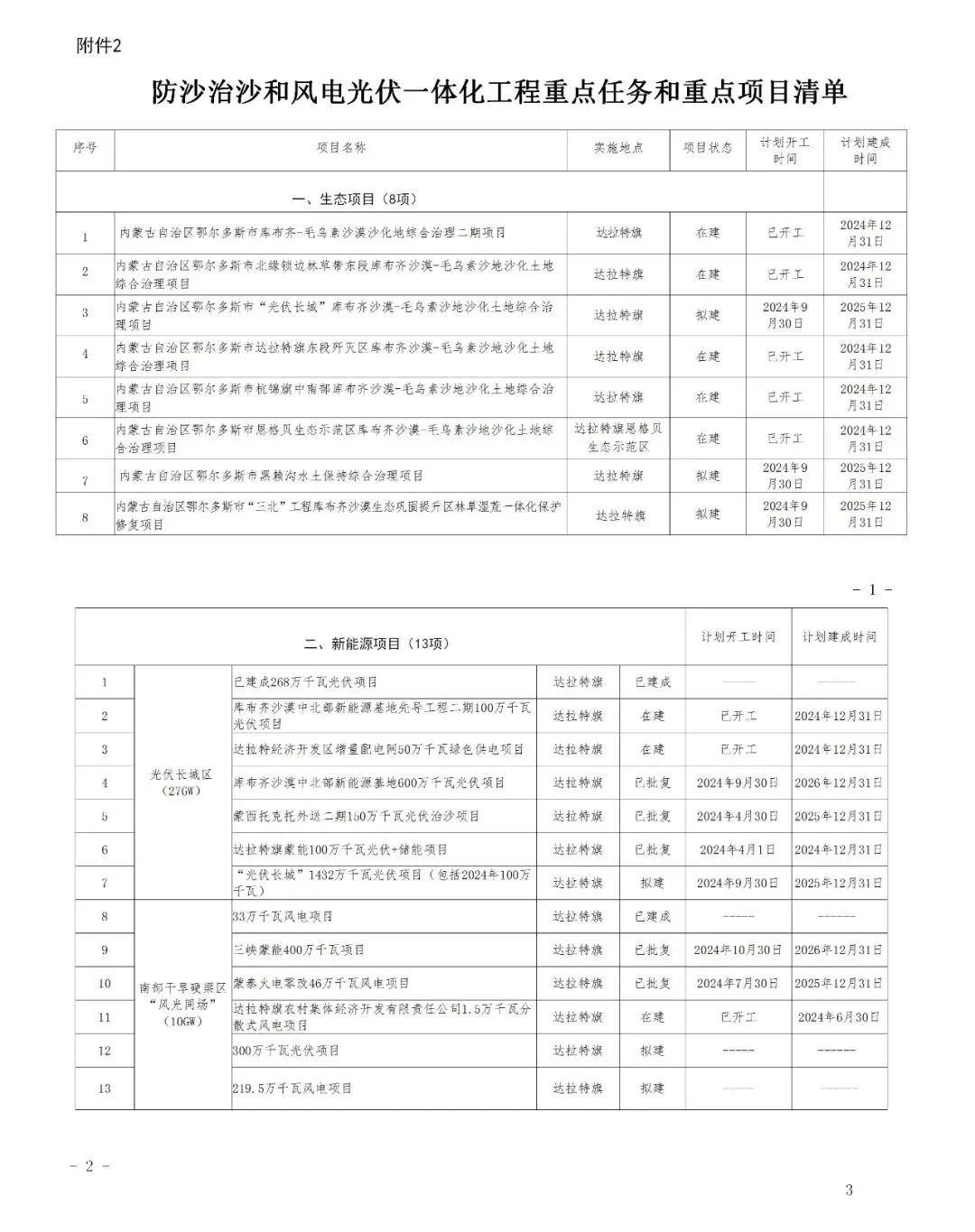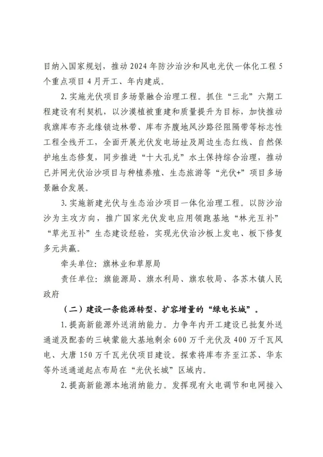 日前,內(nèi)蒙古達(dá)拉特旗人民政府印發(fā)《達(dá)拉特旗防沙治沙和風(fēng)電光伏一體化工程實(shí)施方案》。 文件明確,新增項(xiàng)目實(shí)施主體要拿出一定比例收益,按照光伏裝機(jī)不低于1200畝/萬千瓦(包含項(xiàng)目場區(qū)生態(tài)恢復(fù)治理)、風(fēng)電裝機(jī)不低于2000畝/萬千瓦的標(biāo)準(zhǔn),開展沙化土地綜合治理。對按標(biāo)準(zhǔn)開展防沙治沙的市場化新能源項(xiàng)目應(yīng)報(bào)盡報(bào),爭取項(xiàng)目獲批。對已批復(fù)的項(xiàng)目,鼓勵實(shí)施主體參照新增項(xiàng)目的治理標(biāo)準(zhǔn)積極參與防沙治沙。 文件提出: (一)總體目標(biāo)。以防沙治沙為根本目標(biāo),以風(fēng)電光伏開發(fā)建設(shè)為創(chuàng)新舉措,在達(dá)拉特旗庫布齊沙漠及周邊布局建設(shè)防沙治沙和風(fēng)電光伏一體化工程,實(shí)現(xiàn)292萬畝沙化土地全面治理,容納3700萬千瓦總裝機(jī)容量,促進(jìn)生態(tài)治理與能源開發(fā)融合發(fā)展,全面打贏黃河“幾字彎”攻堅(jiān)戰(zhàn)。 (二)庫布齊沙漠。規(guī)劃建設(shè)總長約133公里、平均寬約25公里,場址面積約3300平方公里“光伏長城”,容納2700萬千瓦裝機(jī)規(guī)模,外送消納1350萬千瓦(三峽蒙能1200萬千瓦、大唐150萬千瓦),蒙西消納462.8萬千瓦(領(lǐng)跑基地100萬千、蒙能集團(tuán)300萬千瓦、中恒新能源10萬千瓦等項(xiàng)目),本地消納887.2萬千瓦(增量配電網(wǎng)園區(qū)綠色供電、寧德時代零碳園區(qū)、蒙泰集團(tuán)源網(wǎng)荷儲等項(xiàng)目),實(shí)現(xiàn)光伏治沙84萬畝,生態(tài)治沙128萬畝。 (三)南部干旱硬梁地區(qū)。在達(dá)拉特旗南部干旱硬梁地區(qū)布局建設(shè)“風(fēng)光同場”,邊界范圍250萬畝,容納風(fēng)電700萬千瓦,光伏300萬千瓦,沙化土地綜合治理80萬畝。 (四)2024年重點(diǎn)目標(biāo)。2024年計(jì)劃新增光伏裝機(jī)容量100萬千瓦,由新增項(xiàng)目實(shí)施主體開展12萬畝沙化土地綜合治理,其中在光伏場區(qū)內(nèi)治理沙化土地面積3萬畝,在光伏場區(qū)外的中和西鎮(zhèn)和恩格貝鎮(zhèn)(毛卜拉孔兌、布日嘎斯太孔兌和黑賴溝孔兌之間),劃定9萬畝退化林改造修復(fù)區(qū)用于沙化土地綜合治理。 此外,《防沙治沙和風(fēng)電光伏一體化工程重點(diǎn)任務(wù)和重點(diǎn)項(xiàng)目清單》顯示,共有新能源項(xiàng)目13個,項(xiàng)目規(guī)模共計(jì)37GW。 《防沙治沙和風(fēng)電光伏一體化工程2024年重點(diǎn)工作清單》顯示,2024年重點(diǎn)建設(shè)新能源項(xiàng)目21個,項(xiàng)目規(guī)模合計(jì)15.54GW。 文件原文如下:
