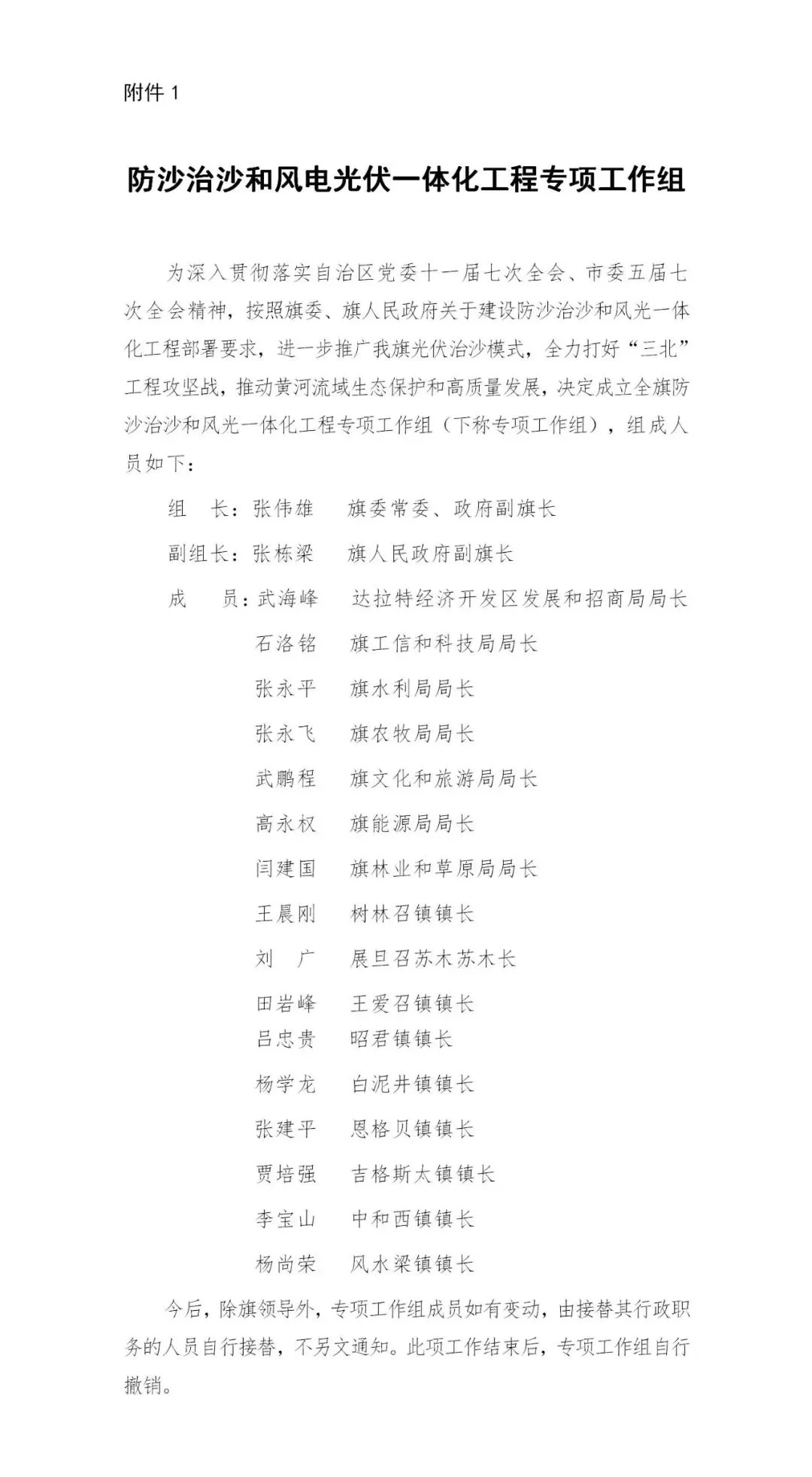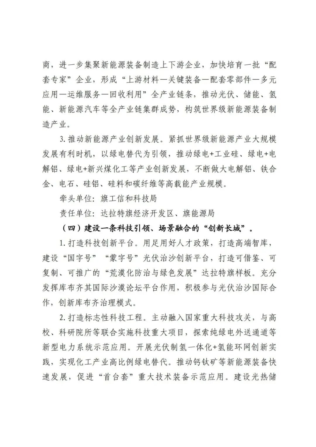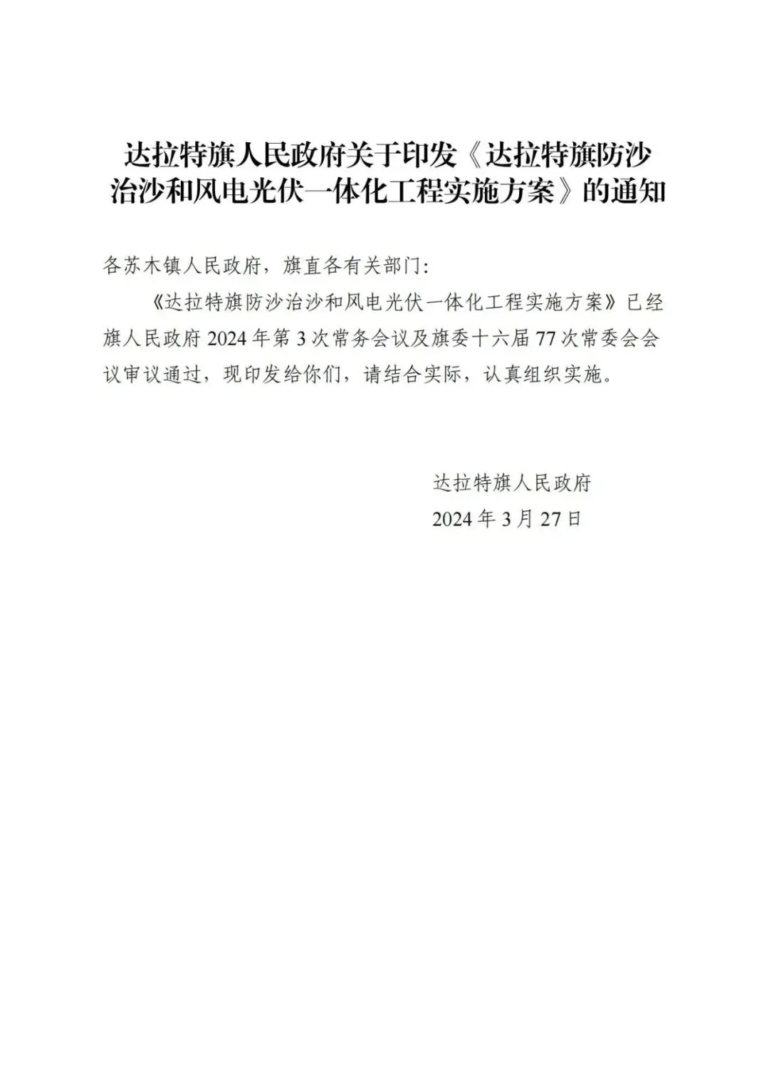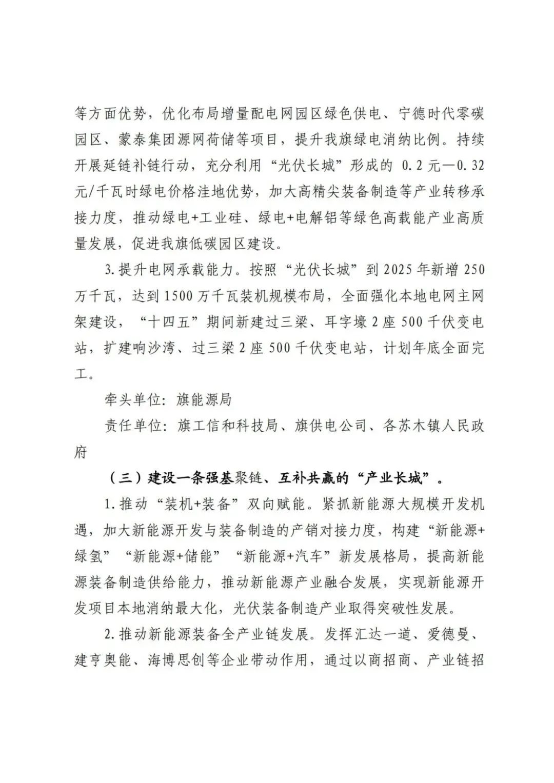 日前,內(nèi)蒙古達(dá)拉特旗人民政府印發(fā)《達(dá)拉特旗防沙治沙和風(fēng)電光伏一體化工程實(shí)施方案》。 文件明確,新增項(xiàng)目實(shí)施主體要拿出一定比例收益,按照光伏裝機(jī)不低于1200畝/萬千瓦(包含項(xiàng)目場區(qū)生態(tài)恢復(fù)治理)、風(fēng)電裝機(jī)不低于2000畝/萬千瓦的標(biāo)準(zhǔn),開展沙化土地綜合治理。對按標(biāo)準(zhǔn)開展防沙治沙的市場化新能源項(xiàng)目應(yīng)報(bào)盡報(bào),爭取項(xiàng)目獲批。對已批復(fù)的項(xiàng)目,鼓勵實(shí)施主體參照新增項(xiàng)目的治理標(biāo)準(zhǔn)積極參與防沙治沙。 文件提出: (一)總體目標(biāo)。以防沙治沙為根本目標(biāo),以風(fēng)電光伏開發(fā)建設(shè)為創(chuàng)新舉措,在達(dá)拉特旗庫布齊沙漠及周邊布局建設(shè)防沙治沙和風(fēng)電光伏一體化工程,實(shí)現(xiàn)292萬畝沙化土地全面治理,容納3700萬千瓦總裝機(jī)容量,促進(jìn)生態(tài)治理與能源開發(fā)融合發(fā)展,全面打贏黃河“幾字彎”攻堅(jiān)戰(zhàn)。 (二)庫布齊沙漠。規(guī)劃建設(shè)總長約133公里、平均寬約25公里,場址面積約3300平方公里“光伏長城”,容納2700萬千瓦裝機(jī)規(guī)模,外送消納1350萬千瓦(三峽蒙能1200萬千瓦、大唐150萬千瓦),蒙西消納462.8萬千瓦(領(lǐng)跑基地100萬千、蒙能集團(tuán)300萬千瓦、中恒新能源10萬千瓦等項(xiàng)目),本地消納887.2萬千瓦(增量配電網(wǎng)園區(qū)綠色供電、寧德時代零碳園區(qū)、蒙泰集團(tuán)源網(wǎng)荷儲等項(xiàng)目),實(shí)現(xiàn)光伏治沙84萬畝,生態(tài)治沙128萬畝。 (三)南部干旱硬梁地區(qū)。在達(dá)拉特旗南部干旱硬梁地區(qū)布局建設(shè)“風(fēng)光同場”,邊界范圍250萬畝,容納風(fēng)電700萬千瓦,光伏300萬千瓦,沙化土地綜合治理80萬畝。 (四)2024年重點(diǎn)目標(biāo)。2024年計(jì)劃新增光伏裝機(jī)容量100萬千瓦,由新增項(xiàng)目實(shí)施主體開展12萬畝沙化土地綜合治理,其中在光伏場區(qū)內(nèi)治理沙化土地面積3萬畝,在光伏場區(qū)外的中和西鎮(zhèn)和恩格貝鎮(zhèn)(毛卜拉孔兌、布日嘎斯太孔兌和黑賴溝孔兌之間),劃定9萬畝退化林改造修復(fù)區(qū)用于沙化土地綜合治理。 此外,《防沙治沙和風(fēng)電光伏一體化工程重點(diǎn)任務(wù)和重點(diǎn)項(xiàng)目清單》顯示,共有新能源項(xiàng)目13個,項(xiàng)目規(guī)模共計(jì)37GW。 《防沙治沙和風(fēng)電光伏一體化工程2024年重點(diǎn)工作清單》顯示,2024年重點(diǎn)建設(shè)新能源項(xiàng)目21個,項(xiàng)目規(guī)模合計(jì)15.54GW。 文件原文如下: