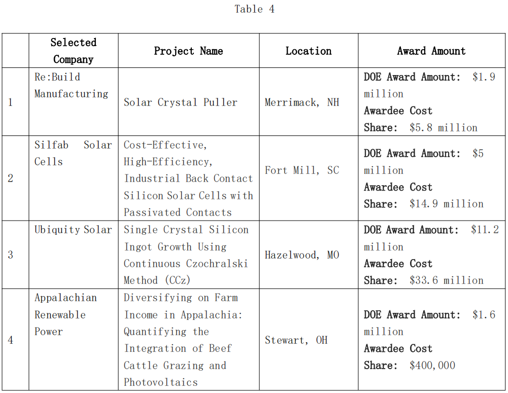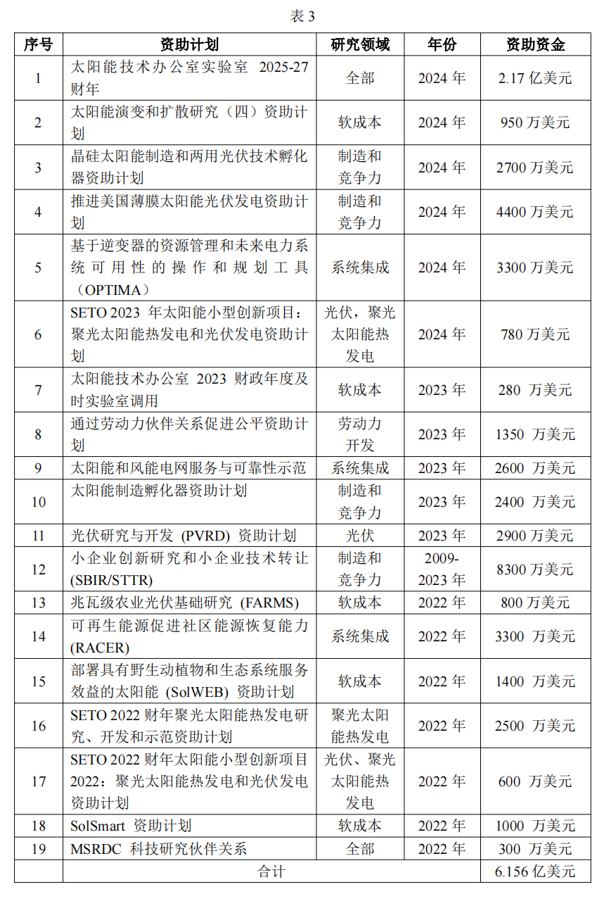 iii. For residential PV applications,on June 28, 2023, the Biden administration announced the Solar for All initiative, which is a key component of the $27 billion Greenhouse Gas Reduction Fund under theIRA. This initiative provides $7 billion for residential rooftop and community distributed solar projects, reducing the cost of PV installation and usage. II.The U.S.providessubstantialgrants andsubsidies for the research anddevelopmentof photovoltaictechnologies The U.S. Department of Energy's Solar Energy Technologies Office (SETO) establishes annual funding programs to provide direct support for PV research and development, and demonstration projects, funded by the Department of Energy and theIIJA. On May 16, 2024, the Department of Energy announced a $71 million investment, including $16 million from theIIJA, to fund the The Silicon Solar Manufacturing and Dual-Use Photovoltaics Incubator Program ($27 million) and the Advancing U.S. Thin-Film Solar Photovoltaics Funding Program ($44 million), aiming to close gaps in PV supply chain manufacturing capabilities. i.Funding for PV R&D and Demonstration Projects According to SETO of the U.S. Department of Energy, since 2022, 19 PV research and development, and demonstration project funding programs have been implemented, totaling $615.6 million, with details listed in Table 3.