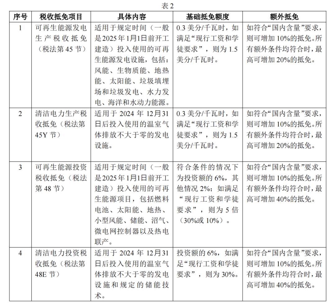 Benefiting from substantial government subsidies, American PV companies are able to continuously expand their manufacturing in the country while facing revenue losses. Take First Solar as an example. According to its 2023 financial report, the company achieved a net profit of $830.777 million, with approximately $659.745 million labeled as government grants receivable, accounting for 79.39% of its profit. This part of income did not exist in 2021 and 2022. In the first quarter of 2024, the company reported a net profit of $236.616 million, with government grant amounting to $281.889 million. Without the subsidies, First Solar would have incurred a net loss of $45.27 million during that period. This significant turnaround was entirely due to the huge amount of government subsidies and tax credit. Meanwhile, the company announced plans to expand its PV module factory in Ohio and to build new factories in Alabama and Louisiana with $2.4 billion of investment, aiming to quadruple its current capacity. In addition to module manufacturers, companies of raw material and accessories in the industry have also received plenty of subsidies. According to the U.S. Department of Energy, the Internal Revenue Service has allocated approximately $4 billion in tax credits for more than 100 projects developed in 35 states. Among the voluntarily disclosed PV projects were Highland Materials, which received $255.6 million for producing solar-grade polysilicon in Tennessee, and SolarCycle, which received $64 million for producing solar glass in Georgia. Additionally, to support the implementation of the production tax credit policy under theIRA, the U.S. Department of Energy's Loan Programs Office has provided a $1.45 billion loan guarantee to domestic crystalline silicon photovoltaic manufacturer Qcells, which supports its PV industry chain project in Cartersville, Georgia. Once completed, the project will produce silicon ingots, wafers, cells, and finished PV modules, making it the largest silicon ingot and wafer plant in the country, addressing a critical gap in its domestic PV supply chain. ii. For PV power generation, theInflation Reduction Act provides four main types of tax credits for domestic projects, as illustrated in Table 2. Notably, for each of these four subsidy policies, projects that meet the requirements in domestic content will receive an additional tax credit. Domestic content refers to using a certain proportion of steel, iron, or manufactured goods, mined, produced, or manufactured in the United States, which may violate the WTO’s national treatment principle.