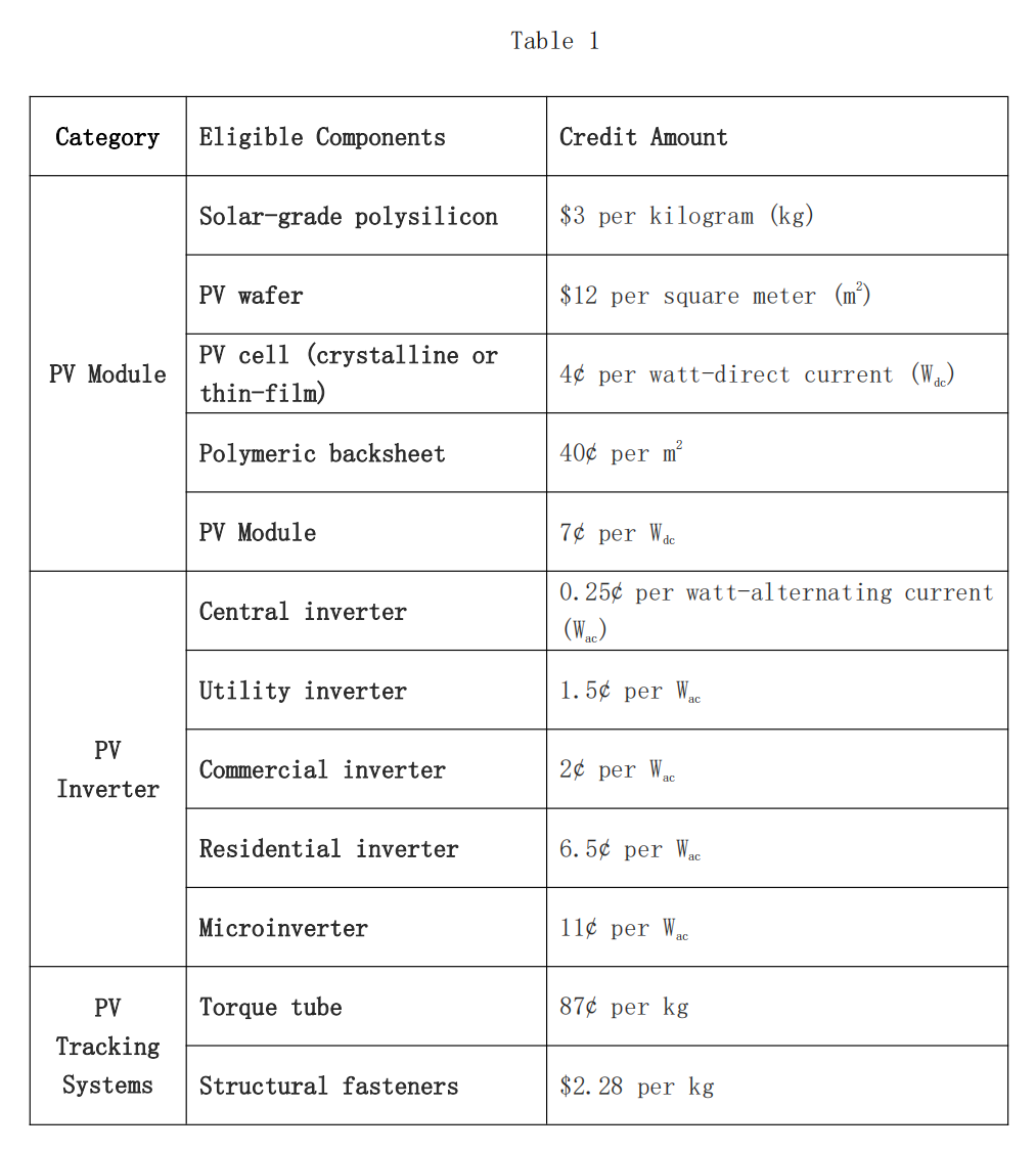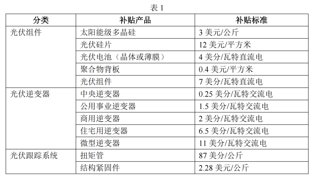 光伏,是推動能源結(jié)構(gòu)調(diào)整和產(chǎn)業(yè)綠色轉(zhuǎn)型的重要產(chǎn)品。當(dāng)前,美國一方面高筑保護主義院墻,采取多重貿(mào)易限制手段,層層加碼設(shè)置光伏關(guān)稅壁壘;另一方面通過《通脹削減法》和《基礎(chǔ)設(shè)施投資與就業(yè)法》等法案,實施排他性、歧視性的產(chǎn)業(yè)政策,向其本土光伏產(chǎn)業(yè)提供大規(guī)模涉嫌違反多邊規(guī)則的補貼,嚴重扭曲全球光伏產(chǎn)業(yè)鏈供應(yīng)鏈的市場化運行,破壞全球共同應(yīng)對氣候變化等領(lǐng)域的國際合作。 一、美國《通脹削減法》為光伏制造和裝機提供巨額補貼 美國于2022年出臺的《通脹削減法》,提供高達3690億美元補貼,以扶持包括本土光伏產(chǎn)品在內(nèi)的清潔能源產(chǎn)業(yè)投資和生產(chǎn),以圖重構(gòu)光伏產(chǎn)業(yè)鏈供應(yīng)鏈。 (一)在光伏產(chǎn)品制造方面,美國聯(lián)邦政府根據(jù)投資額或者產(chǎn)出產(chǎn)品的規(guī)格,向光伏企業(yè)提供稅收抵免補貼。投資稅收抵免總額度高達100億美元,涵蓋光伏等清潔能源制造業(yè)項目,抵免比例最高可達項目投資額的30%。生產(chǎn)稅收抵免涵蓋光伏原材料、電池片、組件和相關(guān)配套產(chǎn)品,具體抵免標(biāo)準(zhǔn)見表1: