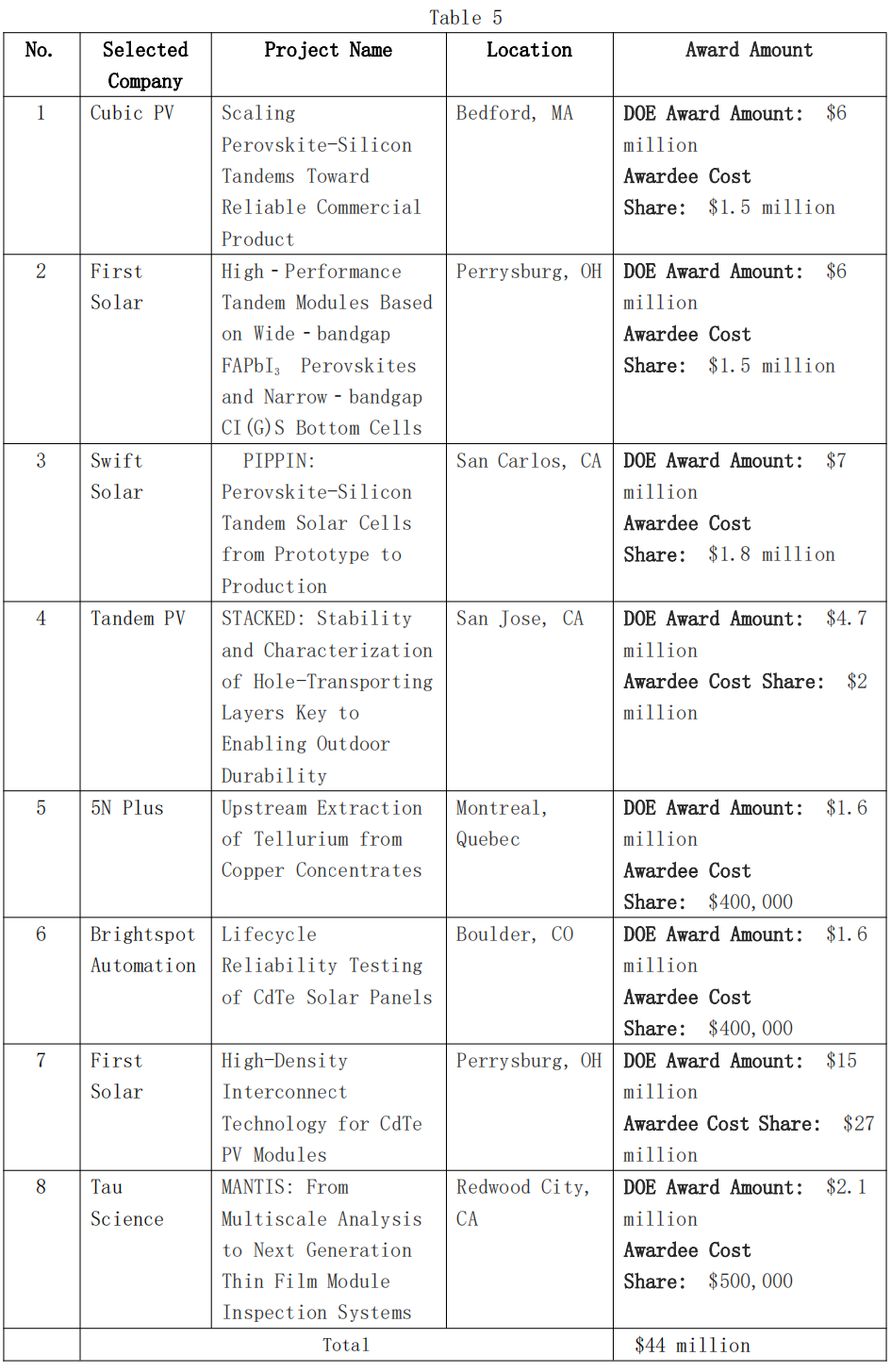 iii.Advancing the U.S. Thin-Film Solar Photovoltaics Funding Program The Advancing U.S. Thin-Film Solar Photovoltaics Funding Program (No. 4 in Table 3) has allocated $44 million for local research, development, and demonstration projects on two major thin-film photovoltaic technologies. The U.S. Department of Energy Solar Energy Technologies Office announced the funding results on May 16, 2024. See Table 5 for the details.