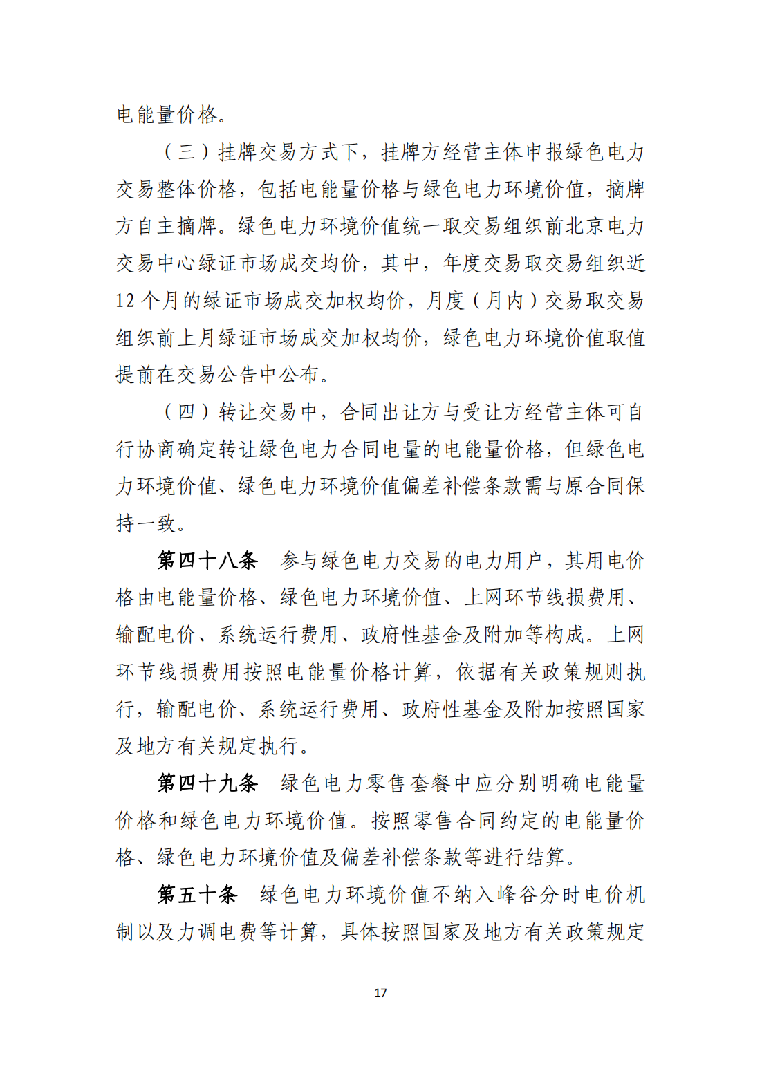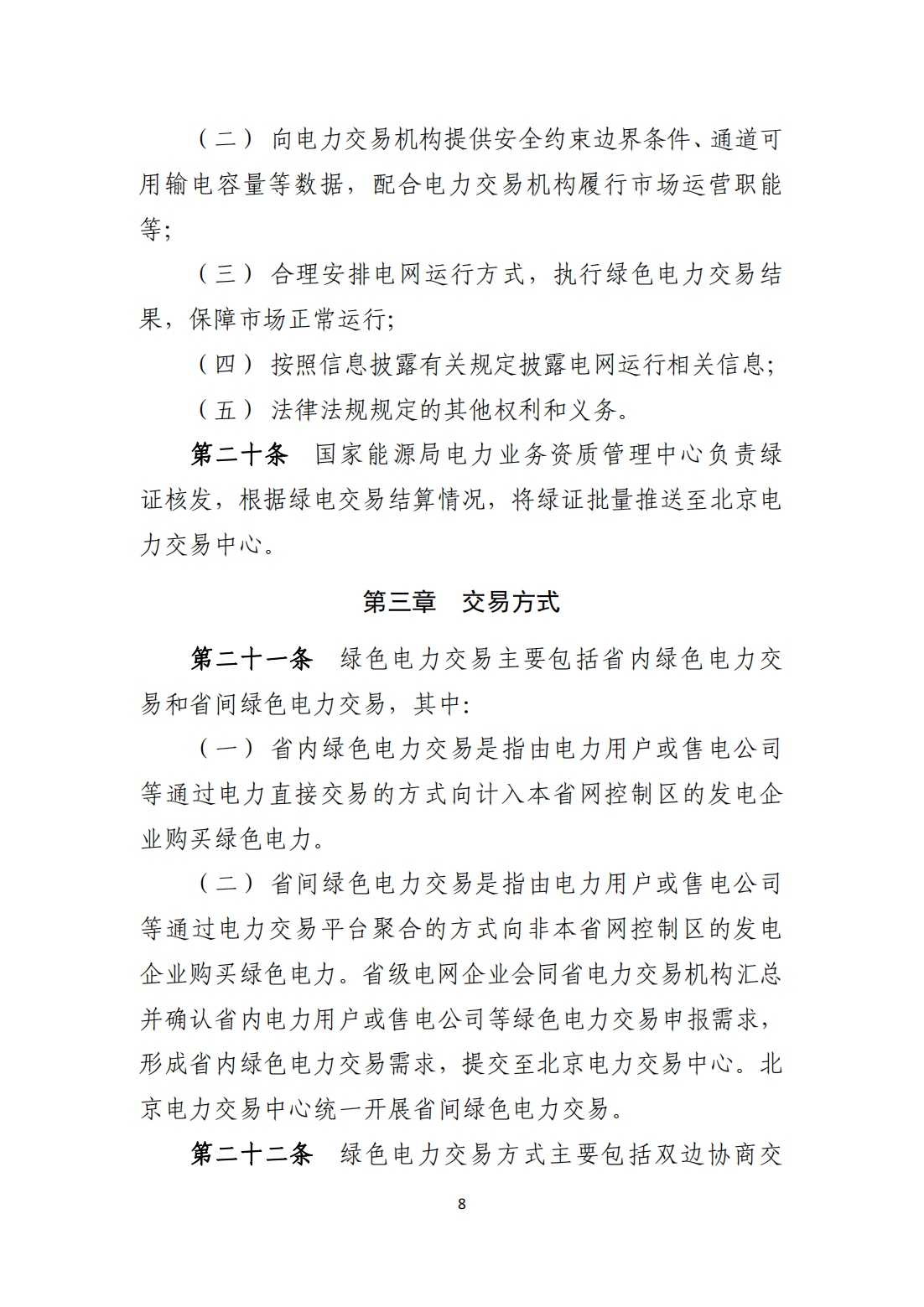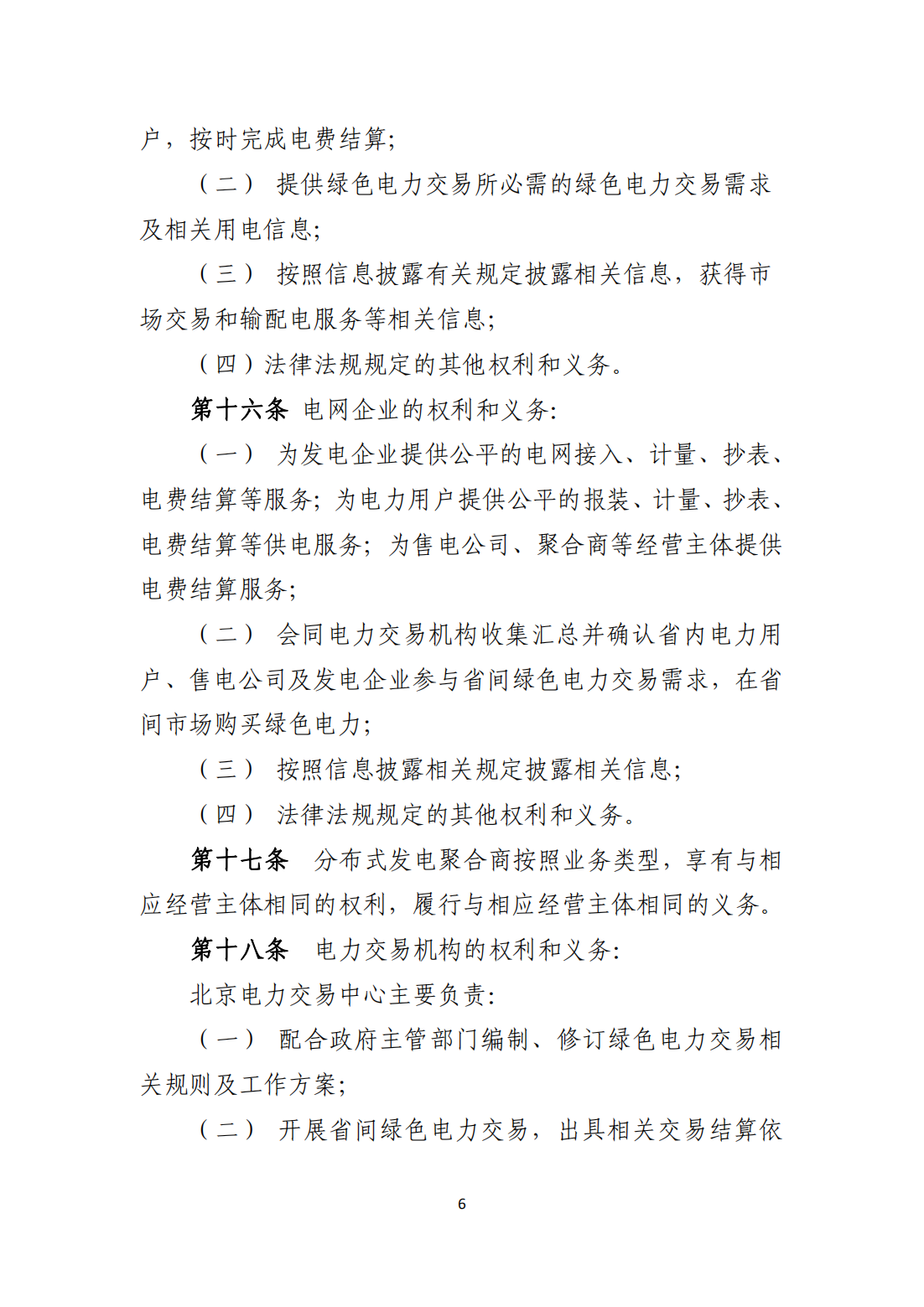 近日,北京電力交易中心發(fā)布關(guān)于印發(fā)《北京電力交易中心綠色電力交易實(shí)施細(xì)則(2024年修訂稿)》的通知,其中提出,細(xì)則適用于國家電網(wǎng)公司經(jīng)營區(qū)域內(nèi)開展的綠色電力交易。 參與綠色電力交易的市場(chǎng)成員包括經(jīng)營主體、 電網(wǎng)企業(yè)和市場(chǎng)運(yùn)營機(jī)構(gòu)。經(jīng)營主體包括發(fā)電企業(yè)(含分布 式發(fā)電主體)、電力用戶、售電公司及聚合商等主體。市場(chǎng) 運(yùn)營機(jī)構(gòu)包括電力交易機(jī)構(gòu)、電力調(diào)度機(jī)構(gòu)。 初期,綠色電力交易優(yōu)先組織未納入國家可再生能源電價(jià)附加補(bǔ)助政策范圍內(nèi)的,或主動(dòng)放棄補(bǔ)貼的風(fēng)電 和光伏發(fā)電企業(yè)參與交易。 分布式發(fā)電主體以聚合形式由聚合商代理參與綠色電力交易。代理分布式發(fā)電主體參與交易的聚合商 (以下簡稱分布式發(fā)電聚合商)在批發(fā)市場(chǎng)以發(fā)電企業(yè)身份 參與綠色電力交易。分布式發(fā)電主體及聚合商相關(guān)準(zhǔn)入注冊(cè) 要求按照有關(guān)規(guī)則規(guī)定執(zhí)行。分布式發(fā)電主體與聚合商以月為最小周 期簽訂分布式電源售電合同。 常態(tài)化開展中長期分時(shí)段交易的地區(qū)應(yīng) 按照相關(guān)規(guī)則,開展分時(shí)段或帶電力曲線的綠色電力交易。 參與綠色電力交易的電力用戶,其用電價(jià) 格由電能量價(jià)格、綠色電力環(huán)境價(jià)值、上網(wǎng)環(huán)節(jié)線損費(fèi)用、 輸配電價(jià)、系統(tǒng)運(yùn)行費(fèi)用、政府性基金及附加等構(gòu)成。上網(wǎng) 環(huán)節(jié)線損費(fèi)用按照電能量價(jià)格計(jì)算,依據(jù)有關(guān)政策規(guī)則執(zhí) 行,輸配電價(jià)、系統(tǒng)運(yùn)行費(fèi)用、政府性基金及附加按照國家 及地方有關(guān)規(guī)定執(zhí)行。 詳情如下: 北京電力交易中心關(guān)于印發(fā)《北京電力交易中心綠色電力交易實(shí)施細(xì)則(2024年修訂稿)》的通知 各經(jīng)營主體、各有關(guān)市場(chǎng)運(yùn)營機(jī)構(gòu): 近期,北京電力交易中心修訂形成《北京電力交易中心綠色電力交易實(shí)施細(xì)則(2024年修訂稿)》,經(jīng)北京電力交易中心市場(chǎng)管理委員會(huì)2024年第1次全體會(huì)議審議通過,并向國家發(fā)展改革委、國家能源局進(jìn)行了報(bào)備?,F(xiàn)予以印發(fā),自2024年10月1日起施行。