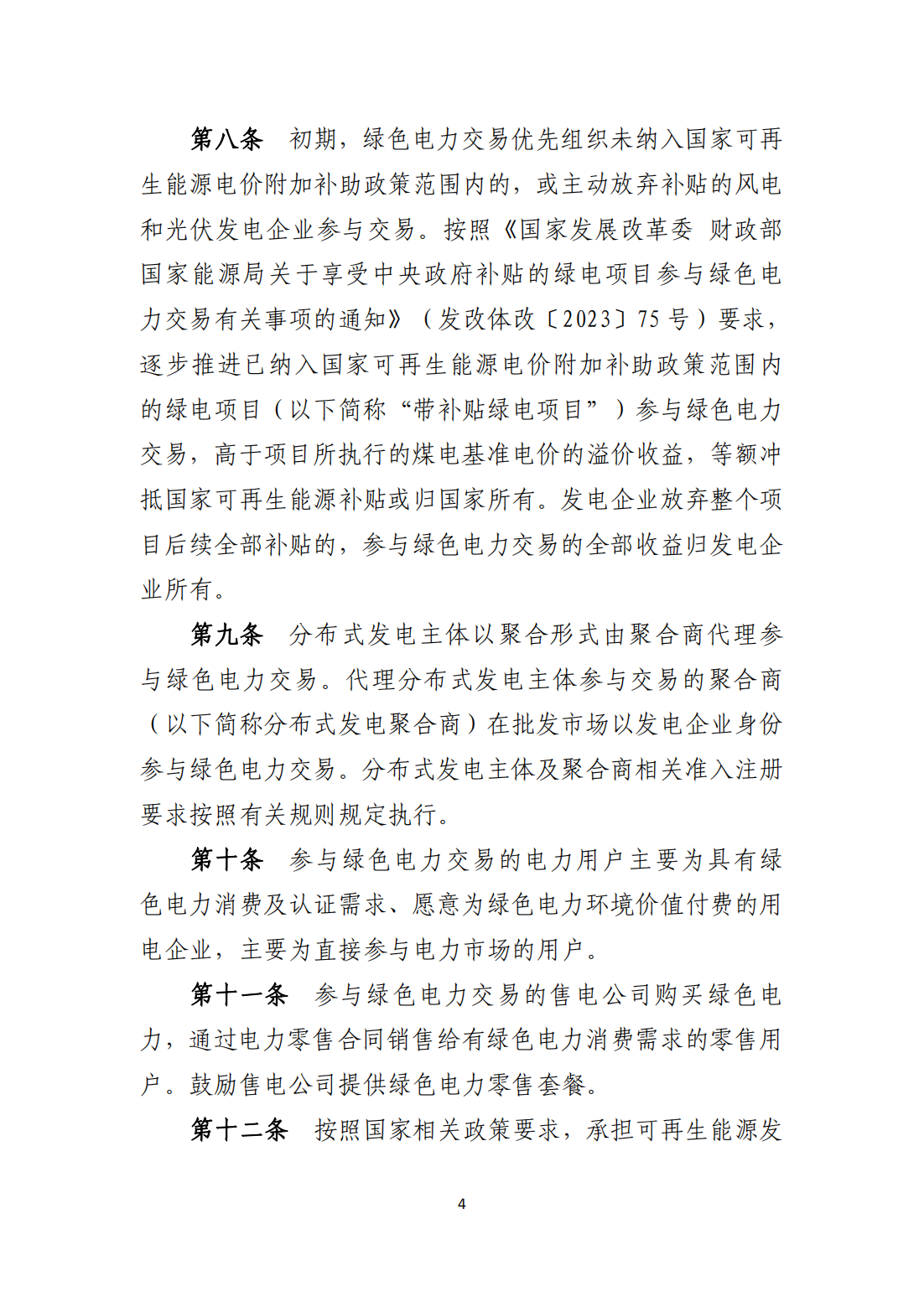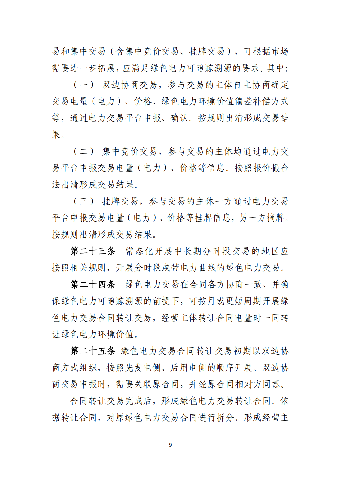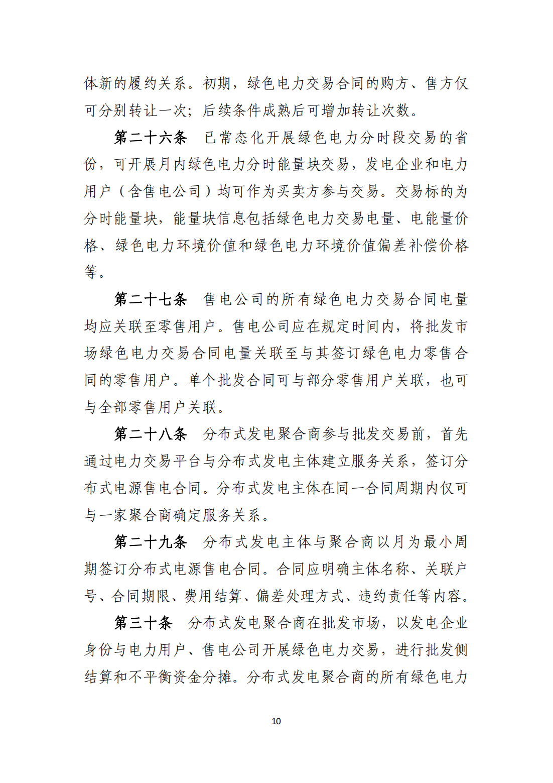 近日,北京電力交易中心發(fā)布關(guān)于印發(fā)《北京電力交易中心綠色電力交易實(shí)施細(xì)則(2024年修訂稿)》的通知,其中提出,細(xì)則適用于國家電網(wǎng)公司經(jīng)營區(qū)域內(nèi)開展的綠色電力交易。 參與綠色電力交易的市場(chǎng)成員包括經(jīng)營主體、 電網(wǎng)企業(yè)和市場(chǎng)運(yùn)營機(jī)構(gòu)。經(jīng)營主體包括發(fā)電企業(yè)(含分布 式發(fā)電主體)、電力用戶、售電公司及聚合商等主體。市場(chǎng) 運(yùn)營機(jī)構(gòu)包括電力交易機(jī)構(gòu)、電力調(diào)度機(jī)構(gòu)。 初期,綠色電力交易優(yōu)先組織未納入國家可再生能源電價(jià)附加補(bǔ)助政策范圍內(nèi)的,或主動(dòng)放棄補(bǔ)貼的風(fēng)電 和光伏發(fā)電企業(yè)參與交易。 分布式發(fā)電主體以聚合形式由聚合商代理參與綠色電力交易。代理分布式發(fā)電主體參與交易的聚合商 (以下簡稱分布式發(fā)電聚合商)在批發(fā)市場(chǎng)以發(fā)電企業(yè)身份 參與綠色電力交易。分布式發(fā)電主體及聚合商相關(guān)準(zhǔn)入注冊(cè) 要求按照有關(guān)規(guī)則規(guī)定執(zhí)行。分布式發(fā)電主體與聚合商以月為最小周 期簽訂分布式電源售電合同。 常態(tài)化開展中長期分時(shí)段交易的地區(qū)應(yīng) 按照相關(guān)規(guī)則,開展分時(shí)段或帶電力曲線的綠色電力交易。 參與綠色電力交易的電力用戶,其用電價(jià) 格由電能量價(jià)格、綠色電力環(huán)境價(jià)值、上網(wǎng)環(huán)節(jié)線損費(fèi)用、 輸配電價(jià)、系統(tǒng)運(yùn)行費(fèi)用、政府性基金及附加等構(gòu)成。上網(wǎng) 環(huán)節(jié)線損費(fèi)用按照電能量價(jià)格計(jì)算,依據(jù)有關(guān)政策規(guī)則執(zhí) 行,輸配電價(jià)、系統(tǒng)運(yùn)行費(fèi)用、政府性基金及附加按照國家 及地方有關(guān)規(guī)定執(zhí)行。 詳情如下: 北京電力交易中心關(guān)于印發(fā)《北京電力交易中心綠色電力交易實(shí)施細(xì)則(2024年修訂稿)》的通知 各經(jīng)營主體、各有關(guān)市場(chǎng)運(yùn)營機(jī)構(gòu): 近期,北京電力交易中心修訂形成《北京電力交易中心綠色電力交易實(shí)施細(xì)則(2024年修訂稿)》,經(jīng)北京電力交易中心市場(chǎng)管理委員會(huì)2024年第1次全體會(huì)議審議通過,并向國家發(fā)展改革委、國家能源局進(jìn)行了報(bào)備?,F(xiàn)予以印發(fā),自2024年10月1日起施行。