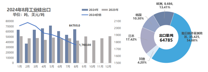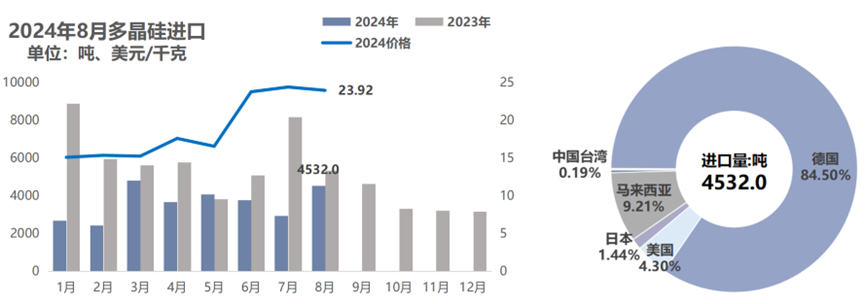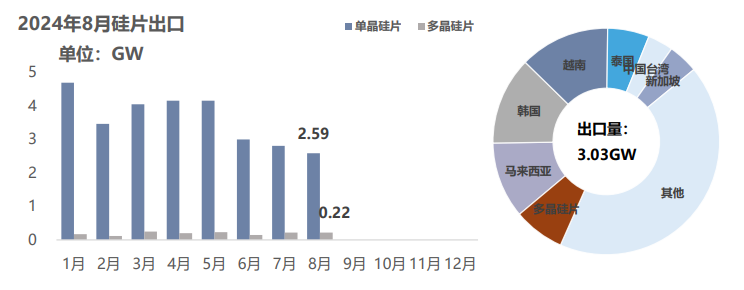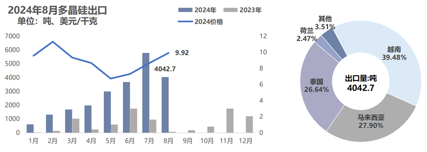 工業(yè)硅 據(jù)海關(guān)數(shù)據(jù),2024年8月份工業(yè)硅出口6.48萬噸,環(huán)比增加19.78%,同比增加49.65%,較7月份出口量增加。主要原因是進(jìn)入8月份海外采購活躍度提高,海運(yùn)運(yùn)費(fèi)也有所下降,且前期出口稅收方面的影響減弱,出口量小幅增加。分國別和地區(qū)來看,對日本出口1.13萬噸,環(huán)比增加29.24%,對韓國出口0.67萬噸,環(huán)比增加3.59%,對歐洲出口0.87萬噸,環(huán)比減少9.69%,對除日韓外的亞洲地區(qū)出口3.54萬噸,環(huán)比增加31.43%。2024年8月份工業(yè)硅出口均價(jià)為1760美元/噸,環(huán)比下跌2.71%,同比下跌11.47%,主要原因是工業(yè)硅市場持續(xù)低迷,價(jià)格底部震蕩,出口價(jià)格受國內(nèi)市場影響下跌。 2024年1-8月份工業(yè)硅出口總量為48.38萬噸,同比增加27.65%。8月份共出口41個(gè)國家和地區(qū),排名前五的國家分別為日本1.13萬噸、印度0.70萬噸、泰國0.67萬噸、韓國0.67萬噸、馬來西亞0.51萬噸,合計(jì)出口量為3.68萬噸,占當(dāng)月出口總量的56.79%,中國工業(yè)硅出口主力地區(qū)仍為亞洲地區(qū)。對歐洲出口量下降,可能是由于歐洲汽車庫存不斷累積,導(dǎo)致鋁廠開工率降低,對工業(yè)硅的需求減少。 進(jìn)入9月份,工業(yè)硅海外需求未有明顯改善,預(yù)計(jì)9月份出口與8月份變動(dòng)不大。 圖:2024年8月工業(yè)硅出口量及分國別統(tǒng)計(jì)情況 多晶硅 根據(jù)海關(guān)最新數(shù)據(jù)顯示,2024年8月我國多晶硅進(jìn)口量為4532.0噸,環(huán)比上漲55.13%。其中,自德國的進(jìn)口量3829.3噸,占總進(jìn)口量的84.50%,相較7月份進(jìn)口量環(huán)比上漲117.67%,為我國當(dāng)月多晶硅最大的進(jìn)口國。自馬來西亞進(jìn)口量417.6噸,占總進(jìn)口量的9.21%,環(huán)比下降59.30%。從以上兩國進(jìn)口的多晶硅占總進(jìn)口量的93.71%。8月多晶硅進(jìn)口量有所反彈并非出于基本面因素,主要是由于海外廠商國內(nèi)備貨所致,因此推測9月硅料進(jìn)口量將出現(xiàn)小幅下滑。8月份多晶硅進(jìn)口均價(jià)23.92美元/千克,環(huán)比下降1.81%,兩大主要進(jìn)口來源國進(jìn)口均價(jià)分別為:德國23.87美元/千克,馬來西亞16.70美元/千克,價(jià)格分別下跌11.05%及13.29%。進(jìn)口價(jià)格近月來首次出現(xiàn)跌勢,推測前期高價(jià)急單基本已經(jīng)在8月履行完畢,9月進(jìn)口硅料價(jià)格將以持平為主。 圖1:2024年8月多晶硅進(jìn)口量及價(jià)格 根據(jù)海關(guān)最新數(shù)據(jù)顯示,2024年8月我國多晶硅出口量為4042.7噸,環(huán)比下降30.21%。其中,向越南出口量為1596.0噸,占總出口量的39.48%。向馬來西亞出口量1128噸,占總出口量的27.90%,對以上兩地出口的多晶硅占總量的67.38%。8月份我國出口呈現(xiàn)對歐盟出口拉動(dòng)大幅增強(qiáng),對東盟國家出口有所減弱的局面。其中,歐洲地區(qū)的光伏裝機(jī)補(bǔ)貼是荷蘭等地需求好轉(zhuǎn)的潛在原因。而對馬來西亞等東盟國家的出口進(jìn)度受海運(yùn)運(yùn)力緊張、港口擁堵等原因出現(xiàn)回落。同時(shí),美國大選帶來的不確定性也抑制了對東盟國家的出口增速。8月我國多晶硅出口均價(jià)為9.92美元/千克,環(huán)比上漲14.55%。兩大主要出口國均價(jià)分別為越南7.18美元/千克,馬來西亞9.73美元/千克, 圖2:2024年8月多晶硅出口量及價(jià)格 硅片 2024年8月國內(nèi)硅片出口量2.81GW,環(huán)比減少7.26%,其中單晶硅片出口2.59GW,環(huán)比減少7.83%,多晶硅片出口0.22GW,環(huán)比持平;1-8月國內(nèi)硅片出口量29.35GW,同比增長3.71%。 分國別統(tǒng)計(jì)情況來看,柬埔寨、馬來西亞、泰國、越南東南亞四國累積出口0.83GW,環(huán)比減少17.8%,具體來看出口減少最多的是越南,減量約0.19GW較上個(gè)月降幅達(dá)87.8%,增量最多的是印度,增量約0.2GW較上個(gè)月增幅達(dá)48.7%。東南亞反規(guī)避政策以來,整體硅片出口量也一直呈下降趨勢,其中東南亞四國出口量持續(xù)減少,印度出口量維持高位,海外市場出現(xiàn)結(jié)構(gòu)性轉(zhuǎn)型。 預(yù)計(jì)9月硅片出口量將相對持平或一定程度小幅下降,隨著國內(nèi)產(chǎn)業(yè)鏈價(jià)格復(fù)蘇,部分海外硅片需求轉(zhuǎn)向國內(nèi),同時(shí)以印度為首的新興市場也將維持增長態(tài)勢。 圖:2024年8月硅片出口量及分國別統(tǒng)計(jì)情況