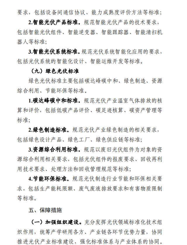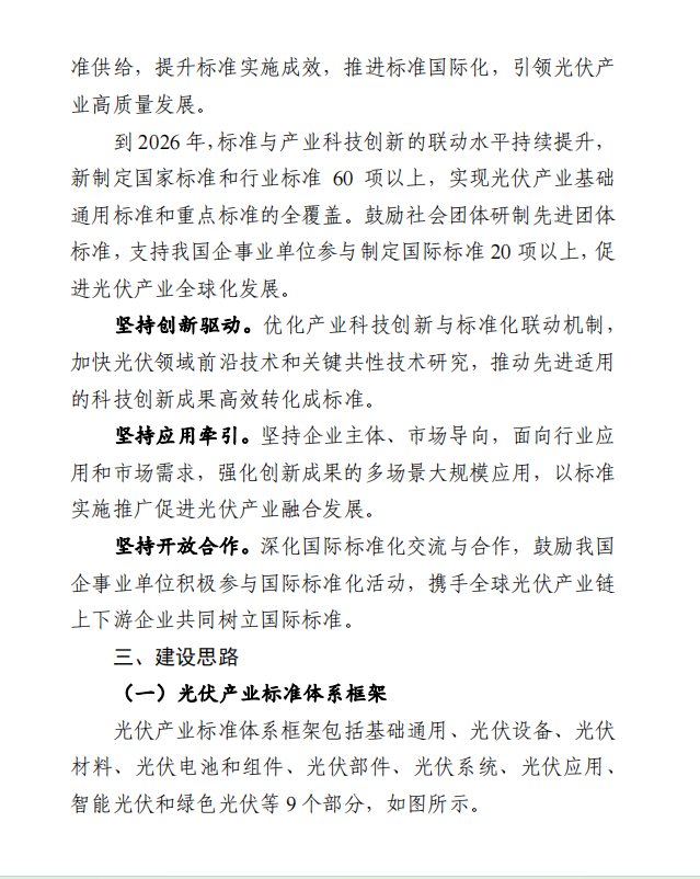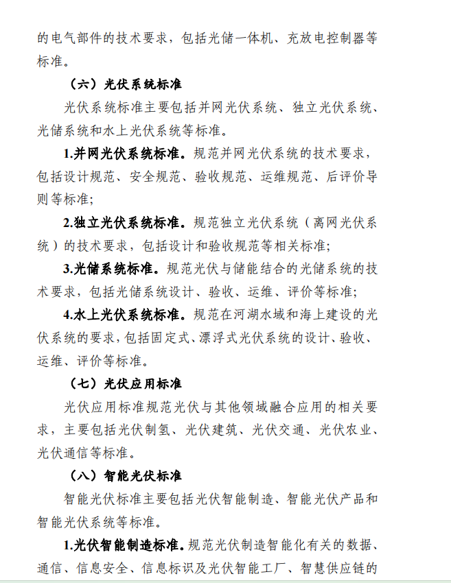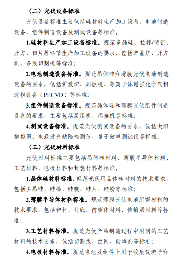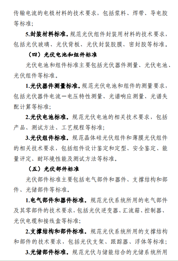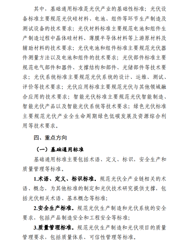 9月25日,工業(yè)和信息化部辦公廳關(guān)于印發(fā)光伏產(chǎn)業(yè)標(biāo)準(zhǔn)體系建設(shè)指南(2024版)的通知。 根據(jù)《通知》,光伏產(chǎn)業(yè)標(biāo)準(zhǔn)體系重點方向包括基礎(chǔ)通用標(biāo)準(zhǔn)、光伏設(shè)備標(biāo)準(zhǔn)、光伏材料標(biāo)準(zhǔn)、光伏電池和組件標(biāo)準(zhǔn)、光伏部件標(biāo)準(zhǔn)、光伏系統(tǒng)標(biāo)準(zhǔn)、光伏應(yīng)用標(biāo)準(zhǔn)、智能光伏標(biāo)準(zhǔn)、綠色光伏標(biāo)準(zhǔn)9個方向。 詳情如下: 各省、自治區(qū)、直轄市工業(yè)和信息化主管部門,有關(guān)行業(yè)協(xié)會、標(biāo)準(zhǔn)化技術(shù)組織和專業(yè)機(jī)構(gòu): 為認(rèn)真落實《新產(chǎn)業(yè)標(biāo)準(zhǔn)化領(lǐng)航工程實施方案(2023—2035年)》,加強(qiáng)光伏產(chǎn)業(yè)標(biāo)準(zhǔn)工作頂層設(shè)計,我們組織編制了《光伏產(chǎn)業(yè)標(biāo)準(zhǔn)體系建設(shè)指南(2024版)》。現(xiàn)印發(fā)給你們,請結(jié)合實際,抓好貫徹落實。 工業(yè)和信息化部辦公廳 2024年8月24日