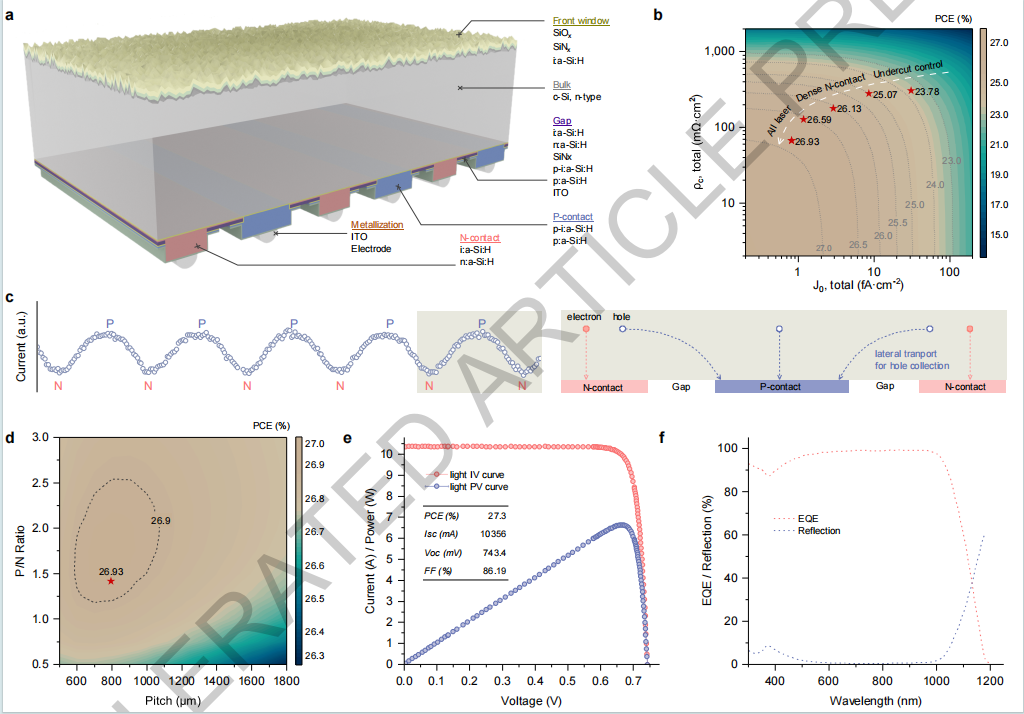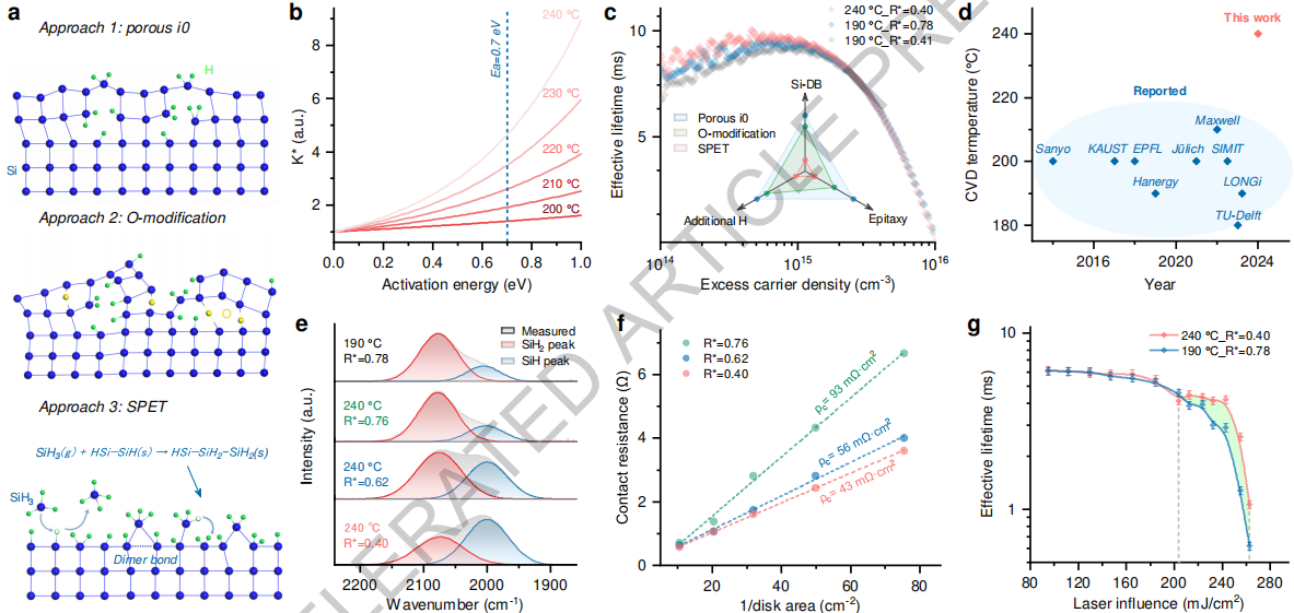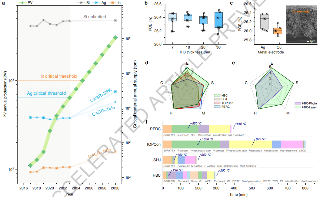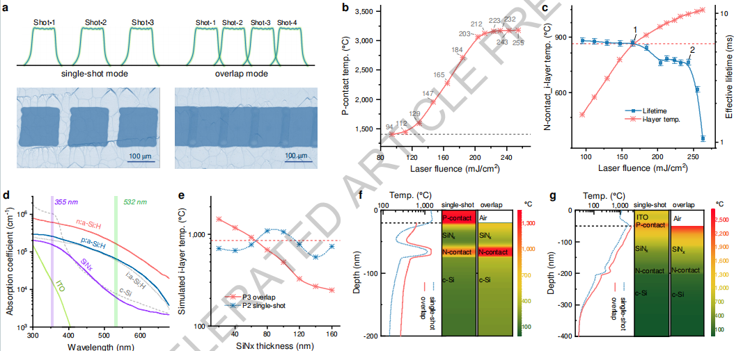 本文介紹了一種利用激光技術(shù)制備高效背接觸硅異質(zhì)結(jié)太陽能電池的方法,實現(xiàn)了27.3%的效率,創(chuàng)下了新的紀(jì)錄。文章針對背接觸電池制備過程中存在的復(fù)雜性和效率損失問題,提出了三個關(guān)鍵工藝改進(jìn):密集鈍化接觸、無激光損傷的激光刻蝕和通過優(yōu)化濕化學(xué)工藝控制刻蝕深度。此外,文章還探討了在太瓦規(guī)模下,如何減少對稀有銦和貴金屬銀的依賴,并展示了無銦和銀背接觸電池的制備,分別實現(xiàn)了26.5%和26.2%的效率。該方法為高效背接觸硅異質(zhì)結(jié)太陽能電池的制備提供了新的思路,并有望推動光伏技術(shù)在建筑和交通領(lǐng)域的應(yīng)用。 圖1. HBC太陽能電池的發(fā)展。a. 最先進(jìn)的HBC太陽能電池配置。b. 接觸電阻率(pc)和復(fù)合電流密度(Jo)對效率模擬的影響。c. 電學(xué)陰影效應(yīng):通過6個間距的線性光束誘導(dǎo)電流(lBIC)測量顯示,由于橫向空穴傳輸損失,N-接觸處的電流收集低于P-接觸處。紅色N和藍(lán)色P分別標(biāo)記N-接觸和P-接觸的周期性位置。還展示了一個間距內(nèi)的損失機(jī)制示意圖。d. P-接觸至N-接觸(P/N)比例和間距對效率模擬的影響。紅色五角星標(biāo)記了記錄電池的最優(yōu)P/N比例和間距組合。e. 由ISFH_CalTeC(哈梅林太陽能研究所,校準(zhǔn)和測試中心)認(rèn)證的記錄電池的電流-電壓(IV)和功率-電壓(PV)曲線。f. 記錄電池的EQE(在ISFH_CalTeC測量)和反射(內(nèi)部測量)曲線。 圖2. 用于HBC的致密鈍化N接觸。a. 三種抑制外延生長的方法。b. 相對反應(yīng)速率系數(shù)K*與不同溫度下的活化能之間的關(guān)系。藍(lán)色線表示Si-Si二聚體在較低極限的活化能。c. 經(jīng)過不同i0層鈍化的晶片的有效壽命。入口雷達(dá)圖定性比較了不同i0層在鈍化方面的性能。d. 報告工作和本研究中主要團(tuán)隊CVD溫度的總結(jié)9,10,19,29-34。e. 在190℃和240°C下制備的不同微結(jié)構(gòu)因子的i0層的FTIR光譜。展示了SH2和Si峰的高斯曲線擬合。f. 使用Cox和Strack方法(CSM,擴(kuò)展數(shù)據(jù)圖1)的接觸電阻率的線性擬合曲線。在圖2 c-f中顯示的結(jié)果中,i1總是被調(diào)整以與i0具有相同的R*。g. 不同i0層在激光通量下的i0/i1/i2堆疊鈍化有效壽命的進(jìn)展。 圖3. 激光圖案化過程。a. 激光束操作模式:單次射擊與重疊。激光射擊輪廓的高度代表了光斑處的能量強(qiáng)度。激光斑點(diǎn)在光學(xué)顯微鏡下進(jìn)行檢查。b. 隨著激光通量增加的P接觸溫度模擬。c. N接觸鈍化質(zhì)量的比較,通過5x10^15 cm^-3處的有效壽命指示,與模擬的i層溫度。點(diǎn)1和2表示有效壽命曲線上的第一和第二個轉(zhuǎn)折點(diǎn)。d. 內(nèi)部測量的i:a-Si:H, n:a-Si:H, p:a-Si:H, SiNx(n=2.5)和ITO層的吸收系數(shù),以及c-Si的參考。e. 在P2和P3期間,隨著SiNx厚度的變化,模擬i層溫度。f. P2激光通量后堆疊層內(nèi)的溫度分布。g. P3激光通量后堆疊層內(nèi)的溫度分布。 圖4. 太瓦級可持續(xù)性分析。a. PV年產(chǎn)量和關(guān)鍵材料年供應(yīng)量。b. 不同ITO厚度的HBC太陽能電池效率。c. 使用Ag電極和Cu電極金屬化的HBC太陽能電池效率。入口SEM圖像顯示了Cu電極的橫截面形態(tài)。d. HBC、SHJ、TOPCon和PERC的ESMRC圖表。e. 通過光刻(HBC-Photo)或激光P3(HBC-Laser)圖案化的HBC的ESMRC圖表。f. PERC、TOPCon、SHJ和HBC的工藝時間。標(biāo)記的是工藝中的最高溫度步驟。在b和c中,頂線、底線、盒內(nèi)的線和盒子分別代表最大值、最小值、中位數(shù)和25-75%的分布。