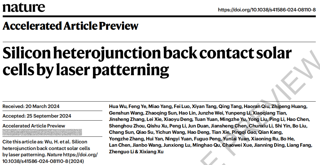 隆基綠能李振國、徐希翔&揚(yáng)州大學(xué)丁建寧《Nature》|通過激光圖案化實現(xiàn)的硅異質(zhì)結(jié)背接觸太陽能電池2024-10-09 10:35來源:gessey瀏覽數(shù):365次